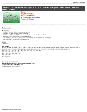 Informacje o produkcie S0000310 - Blokada rozrządu 2.5 / 2.8 Citroen, Peugeot, Fiat, Iveco, Renault, Opel - Diesel Cena : 52,85 zł (netto) 65,00 zł (brutto) Nr katalogowy : S0000310 Producent : Tesam Zastosowanie: Samochody: - PSA 2,8D / Tdi / Hdi - Citroen Relay / Jumper (01-06) - PSA 2,8D / Tdi / Hdi - Peugeot Boxer I / II (00-06) - Fiat 2,5D / 2,5DT / 2,8D / 2,8JTD - Croma (93-97) / Ducato (87-06) / Talento (87-02) - Iveco 2,5D / 2,8D - Daily (91-06) / Turbo Daily (94-00) - Renault 2,5D / 2,5D Turbo / 2,8dTi / 2,8dCi- Trafic (98-00) / Master (98-07) / Mascot (99-07) - Opel 2,5D / 2,8D - Arena (97-01) / Movano (98-03) Silniki: - Diesla 2.5, 2.8 Kod silnika: 8140.63, 8140.43, 8140.43S, 8144.67, 8140.27, 8140.47R, 8144.21, 8144.97Y, 8140.43, 8140.63, 8140.43S, 8140.07, 8140.21, 8140.27S, 8140.47, 8140.47R, 8140.67F, 8140.97, 8140.23, 8140.43B, 8140.43C, 8140.43N, 8140.43R / 8140.43S, 8140.63, 8140.23.27, 8140.43.37 S8U – 720 / 722 / 730 / 731 / 742 / 748 / 750 / 752 / 770 / 772 / 780 / 782 S9U – 700 / 702 / 704 / 714 / 740 S9W – 700 / 702 / 206 / 208 / 212 S8U – 770 / 772 S9W- 700 / 702 rozrzadu Gwarancja 12 miesięcy: Tak Stan produktu: Używany / Nowy / Regenerowany: Nowy Czas wysyłki: 24h | 48h | 3 dni: 24h Koszty wysyłki: 21zł | 26zł | 0zł Wygenerowano w programie www.oscGold.com