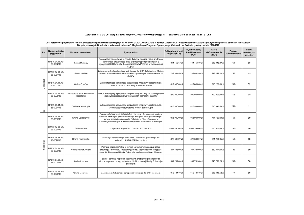 Załacznik nr 2 do Uchwały Zarzadu Województwa Świętokrzyskiego Nr 1799/2016 z dnia 27 września 2016 roku Lista rezerwowa projektów w ramach jednoetapowego konkursu zamkniętego nr RPSW.04.01.00-IZ.00-26-029/16 w ramach Działania 4.1 "Przeciwdziałanie skutkom klęsk żywiołowych oraz usuwanie ich skutków" Osi priorytetowej 4 „Dziedzictwo naturalne i kulturowe” Regionalnego Programu Operacyjnego Województwa Świętokrzyskiego na lata 2014-2020 Lp. Procent dofinansowania Liczba uzyskanych punktów 633 342,37 zł 75% 33 785 981,50 zł 589 486,12 zł 75% 32 817 600,00 zł 817 600,00 zł 613 200,00 zł 75% 32 Nowoczesny sprzęt specjalistyczny podstawą poprawy i budowy systemu reagowania i ratownictwa w sytuacjach zagrożeń i katastrof 200 000,00 zł 200 000,00 zł 150 000,00 zł 75% 32 Gmina Nowa Słupia Zakup średniego samochodu strażackiego wraz z wyposażeniem dla Ochotniczej Straży Pożarnej w msc. Stara Słupia 813 398,00 zł 813 398,00 zł 610 048,50 zł 75% 31 RPSW.04.01.0026-0037/16 Gmina Działoszyce Poprawa skuteczności i jakości akcji ratowniczych, usuwania skutków katastrof oraz klęsk żywiołowych dzięki zakupowi wozu pożarniczego i sprzętu specjalistycznego dla Ochotniczej Straży Pożarnej w Działoszycach będącej w Krajowym Systemie Ratowniczo-Gaśniczym 953 000,00 zł 953 000,00 zł 714 750,00 zł 75% 30 RPSW.04.01.0026-0034/16 Gmina Mniów Doposażenie jednostki OSP w Zaborowicach 1 009 140,04 zł 1 009 140,04 zł 756 855,03 zł 75% 30 RPSW.04.01.0026-0028/16 Gmina Kluczewsko Zakup specjalistycznego samochodu ratowniczo-gaśniczego dla jednostki z KSRG OSP Dobromierz 828 389,27 zł 828 389,27 zł 621 291,95 zł 75% 30 RPSW.04.01.0026-0029/16 Gmina Nowy Korczyn Poprawa bezpieczeństwa w Gminie Nowy Korczyn poprzez zakup średniego samochodu strażackiego wraz z wyposażeniem ratującym życie dla Ochotniczej Straży Pożarnej w miejscowości Nowy Korczyn. 867 396,00 zł 867 396,00 zł 650 547,00 zł 75% 30 RPSW.04.01.0026-0004/16 Gmina Łubnice Zakup pompy z napędem spalinowym oraz lekkiego samochodu strażackiego wraz z wyposażeniem dla Ochotniczej Straży Pożarnej w Łubnicach 331 731,00 zł 331 731,00 zł 248 798,25 zł 75% 30 RPSW.04.01.0026-0026/16 Gmina Morawica Zakup specjalistycznego sprzętu ratowniczego dla OSP Morawica 915 484,70 zł 915 484,70 zł 686 613,52 zł 75% 30 Wydatki/Koszty kwalifikowalne (PLN) Nazwa wnioskodawcy Tytuł projektu RPSW.04.01.0026-0002/16 Gmina Dwikozy Poprawa bezpieczeństwa w Gminie Dwikozy poprzez zakup średniego samochodu strażackiego oraz przenośnej pompy szlamowej o wydajności 2000 l/min dla Ochotniczej Straży Pożarnej w miejscowości Słupcza 844 456,50 zł 844 456,50 zł RPSW.04.01.0026-0031/16 Gmina Łoniów Zakup samochodu ratowniczo-gaśniczego dla OSP Sulisławice w Gminie Łoniów - przeciwdziałanie skutkom klęsk żywiołowych oraz usuwania ich skutków 785 981,50 zł RPSW.04.01.0026-0003/16 Gmina Ożarów Zakup średniego samochodu strażackiego wraz z wyposażeniem dla Ochotniczej Straży Pożarnej w mieście Ożarów RPSW.04.01.0026-0008/16 Ochotnicza Straż Pożarna w Prząsławiu RPSW.04.01.0026-0024/16 1 2 ex aequo Calkowita wartość projektu (PLN) Numer wniosku (sygnatura) Kwota dofinansowania (PLN) 4 ex aequo 3 Strona 1 z 2 5 ex aequo 6 ex aequo RPSW.04.01.0026-0009/16 Gmina Łączna Zakup średniego samochodu strażackiego wraz z wyposażeniem dla Ochotniczej Straży Pożarnej w Łącznej. 833 940,00 zł 833 940,00 zł 625 455,00 zł 75% 29 RPSW.04.01.0026-0033/16 Gmina Samborzec Przeciwdziałanie skutkom klęsk żywiołowych oraz usuwanie ich skutków na terenie gminy Samborzec poprzez zakup sprzętu i wyposażenia dla jednostek Ochotniczych Straży Pożarnych będących w Krajowym Systemie Ratowniczo Gaśniczym 310 000,00 zł 310 000,00 zł 232 500,00 zł 75% 29 RPSW.04.01.0026-0042/16 Gmina Chęciny Doposażenie jednostki OSP w Chęcinach poprzez zakup samochodu ratowniczo-gaśniczego wraz z wyposażeniem 898 600,00 zł 898 600,00 zł 673 950,00 zł 75% 28 RPSW.04.01.0026-0043/16 Gmina Chęciny Zakup samochodu ratowniczo-gaśniczego wraz z wyposażeniem dla jednostki OSP w Wolicy, Gmina Chęciny 810 790,00 zł 810 790,00 zł 608 092,50 zł 75% 28 RPSW.04.01.0026-0020/16 Gmina Mierzec Poprawa funkcjonowania systemu ratowniczo-gaśniczego i przeciwdziałanie zagrożeniom w Gminie Mirzec poprzez zakup nowego samochodu pożarniczego dla Jednostki OSP Mirzec. 739 500,00 zł 738 000,00 zł 553 500,00 zł 75% 28 RPSW.04.01.0026-0018/16 Gmina Wąchock Zakup średniego samochodu strażackiego wraz z wyposażeniem dla Ochotniczej Straży Pożarnej w mieście Wąchock 908 077,92 zł 908 077,92 zł 681 058,44 zł 75% 28 12 867 484,93 12 865 984,93 9 649 488,68 SUMA Strona 2 z 2