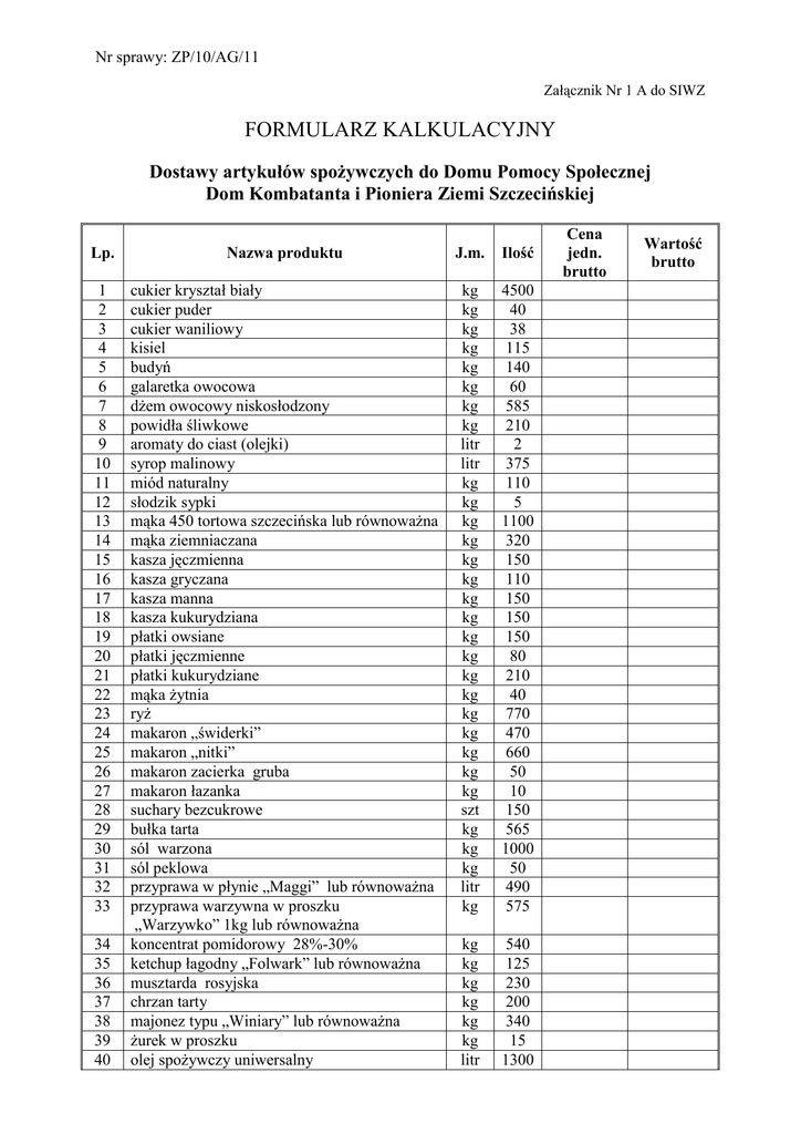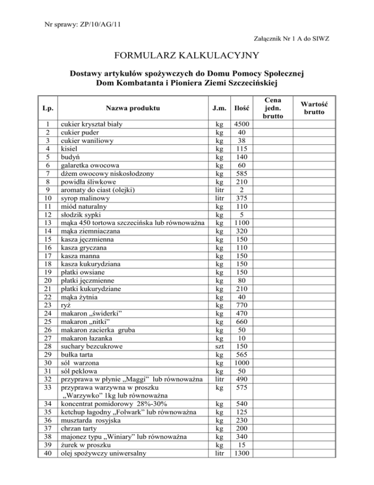 Nr sprawy: ZP/10/AG/11 Załącznik Nr 1 A do SIWZ FORMULARZ KALKULACYJNY Dostawy artykułów spożywczych do Domu Pomocy Społecznej Dom Kombatanta i Pioniera Ziemi Szczecińskiej Lp. Nazwa produktu J.m. Ilość 1 2 3 4 5 6 7 8 9 10 11 12 13 14 15 16 17 18 19 20 21 22 23 24 25 26 27 28 29 30 31 32 33 cukier kryształ biały cukier puder cukier waniliowy kisiel budyń galaretka owocowa dżem owocowy niskosłodzony powidła śliwkowe aromaty do ciast (olejki) syrop malinowy miód naturalny słodzik sypki mąka 450 tortowa szczecińska lub równoważna mąka ziemniaczana kasza jęczmienna kasza gryczana kasza manna kasza kukurydziana płatki owsiane płatki jęczmienne płatki kukurydziane mąka żytnia ryż makaron „świderki” makaron „nitki” makaron zacierka gruba makaron łazanka suchary bezcukrowe bułka tarta sól warzona sól peklowa przyprawa w płynie „Maggi” lub równoważna przyprawa warzywna w proszku „Warzywko” 1kg lub równoważna koncentrat pomidorowy 28%-30% ketchup łagodny „Folwark” lub równoważna musztarda rosyjska chrzan tarty majonez typu „Winiary” lub równoważna żurek w proszku olej spożywczy uniwersalny kg kg kg kg kg kg kg kg litr litr kg kg kg kg kg kg kg kg kg kg kg kg kg kg kg kg kg szt kg kg kg litr kg 4500 40 38 115 140 60 585 210 2 375 110 5 1100 320 150 110 150 150 150 80 210 40 770 470 660 50 10 150 565 1000 50 490 575 kg kg kg kg kg kg litr 540 125 230 200 340 15 1300 34 35 36 37 38 39 40 Cena jedn. brutto Wartość brutto 41 42 43 44 45 46 47 48 49 50 51 52 53 54 55 56 57 58 59 60 61 62 63 64 65 66 67 68 69 70 71 72 73 74 75 76 77 78 79 80 81 82 83 84 85 86 87 88 89 90 ocet 10% proszek do pieczenia drożdże spożywcze pieprz czarny mielony pieprz ziołowy mielony pieprz cayenne mielony czubryca zielona suszona papryka słodka w proszku cynamon w proszku imbir oregano zioła prowansalskie kminek bazylia tarta gałka muszkatołowa curry w proszku czosnek granulowany majeranek goździki liść laurowy przyprawa do drobiu przyprawa do ryb przyprawa do potraw chińskich typu ”Wok” lub równoważna ziele angielskie żelatyna spożywcza barszcz czerwony proszek typu „Winiary” lub równoważna kwasek cytrynowy groszek konserwowy ogórek konserwowy kukurydza konserwowa papryka konserwowa brzoskwinia konserwowana ananas konserwowany fasola Jaś groch łuskany rodzynki śliwka suszona wiórki kokosowe sok pomidorowy 330ml szpinak mrożony kalafior mrożony brokuły mrożone brukselka mrożona fasolka szparagowa mrożona marchew mrożona marchew z groszkiem mrożona włoszczyzna mrożona mieszanka kompotowa mrożona 5-składnikowa truskawka mrożona sardynki w pomidorach puszka 170g litr kg kg kg kg kg kg kg kg kg kg kg kg kg kg kg kg kg kg kg kg kg kg 108 21 21 48 12 5 4 43 6 2 4 5 5 10 3 2 20 11 4 8 44 12 30 kg kg kg 8 46 18 kg kg kg kg kg kg kg kg kg kg kg kg szt kg kg kg kg kg kg kg kg kg 14 235 1120 90 520 55 40 225 245 39 32 7 8000 335 425 240 165 510 50 290 120 300 kg szt 145 50 91 92 93 94 95 96 97 98 99 100 101 102 103 104 105 106 107 108 109 110 111 112 113 114 115 116 117 118 119 120 121 122 123 124 125 makrela wędzona tusza śledzie solone filet filet morszczuk mrożony glazura 15% karp świeży tusza herbata granulowana typu „Assam” lub równoważna herbata expressowa miętowa ekstrakt kawy zbożowej „Inka” lub równoważna kawa rozpuszczalna naturalna typu „Nescafe” lub równoważna kakao naturalne sypkie makaron spagetti sos sojowy jasny przyprawa kurkuma przyprawa kolendra przyprawa jałowiec przyprawa cząber przyprawa estragon przyprawa rozmaryn przyprawa tymianek przyprawa gorczyca przyprawa do grilla „kamis” lub równoważna przyprawa chińska 5 smaków „kamis” lub równoważna przyprawa do gyrosa „kamis” lub równoważna przyprawa shoarma „kamis” lub równoważna przyprawa do ziemniaków „kamis” lub równoważna kmin rzymski „kamis” lub równoważna grzyby suszone papryka pepperoni-słoik oliwa z oliwek ocet winny oliwki w zalewie soja ziarno koper suszony przyprawa do wieprzowiny wiśnie mrożone Frytura (olej palmowy) kg kg kg kg kg 1235 500 1900 105 455 kg kg 21 215 kg 32 kg kg litr kg kg kg kg kg kg kg kg kg kg 50 200 150 4 2 2 2 2 5 2 4 5 5 kg kg kg 3 3 5 kg kg kg litr litr kg kg kg kg kg litr 3 5 15 5 3 50 1500 3 3 20 700 Razem wartość brutto: …………………..................................................... (podpis(y) osób uprawnionych do reprezentacji wykonawcy)