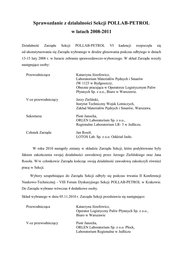 Sprawozdanie z działalności Sekcji POLLAB-PETROL w latach 2008-2011 Działalność Zarządu Sekcji POLLAB-PETROL VI kadencji rozpoczęła się od ukonstytuowania się Zarządu wybranego w drodze głosowania podczas odbytego w dniach 13-15 luty 2008 r. w Juracie zebrania sprawozdawczo-wyborczego. W skład Zarządu weszły następujące osoby: Przewodnicząca Katarzyna Józefowicz, Laboratorium Materiałów Pędnych i Smarów JW 1123 w Bydgoszczy, Obecnie pracująca w Operatorze Logistycznym Paliw Płynnych Sp. z o.o., Biuro w Warszawie. V-ce przewodniczący Jerzy Zieliński, Instytut Techniczny Wojsk Lotniczych, Zakład Materiałów Pędnych i Smarów, Warszawa. Sekretarza Piotr Janocha, ORLEN Laboratorium Sp. z o.o., Regionalne Laboratorium LR- 3 w Jedliczu. Członek Zarządu Jan Rosół, LOTOS Lab. Sp. z o.o. Oddział Jasło. W roku 2010 nastąpiły zmiany w składzie Zarządu Sekcji, które podyktowane były faktem zakończenia swojej działalności zawodowej przez Jerzego Zielińskiego oraz Jana Rosoła. W/w członkowie Zarządu kończąc swoją działalność zawodową zakończyli również pracę w Sekcji. Wybory uzupełniające do Zarządu Sekcji odbyły się podczas trwania II Konferencji Naukowo-Technicznej - VIII Forum Dyskusyjnego Sekcji POLLAB-PETROL w Krakowie. Do Zarządu wybrano wówczas 4 dodatkowe osoby. Skład wybranego w dniu 05.11.2010 r. Zarządu Sekcji przedstawia się następująco: Przewodnicząca Katarzyna Józefowicz, Operator Logistyczny Paliw Płynnych Sp. z o.o., Biuro w Warszawie V-ce przewodniczący Piotr Janocha, ORLEN Laboratorium Sp. z o.o. Płock, Laboratorium Regionalne w Jedliczu Sekretarz Ewa Rostek, Instytut Transportu Samochodowego, Warszawa Członek Tadeusz Bałuch, Lotos Lab. Sp. z o.o., Oddział Czechowice-Dziedzice Członek Elżbieta Trzaska, Instytut Nafty i Gazu, Kraków Członek Marek Domański, Instytut Techniczny Wojsk Lotniczych Zakład MPS, Warszawa. Działalność Zarządu Sekcji w czasie objętym sprawozdaniem skupiała się na dwóch zasadniczych zagadnieniach: 1. Organizacji zebrań członków 2. Organizacji badań biegłości Organizacja spotkań Organizowane, przez Zarząd Sekcji, zebrania mają charakter Forum Dyskusyjnego i są to dwu lub trzy dniowe zebrania Członków Sekcji ukierunkowane na wymianę doświadczeń w zakresie rozwoju metodyk badawczych, nowinek branżowych, doskonalenia systemów zarządzania jakością wg wymagań normy PN-EN ISO/IEC 17025:2005 oraz omawianie wyników i wniosków z prowadzonych przez Sekcję badań biegłości. W minionej kadencji Zarząd Sekcji zorganizował następujące Fora dyskusyjne: V Forum Dyskusyjne Sekcji POLLAB-PETROL przeprowadzone w dniach 13-15 luty 2008 r. w Juracie. Organizatorem technicznym zebrania był Pan Grzegorz Domański z Laboratorium Materiałów Pędnych i Smarów Marynarki Wojennej w Dębogórzu. VI Forum Dyskusyjne Sekcji POLLAB-PETROL, które odbyło się w dniach 1-3 października 2008 r. w Koszelówce k. Płocka. Duży wkład pracy w organizację tego zebrania włożyły Panie Marzena Mazurowska i Jolanta Kowalczyk z Ośrodka Badawczo-Rozwojowego Przemysły Rafineryjnego w Płocku oraz Edyta Lewandowska-Burczak z ORLEN Laboratorium Sp. z o.o. w Płocku oraz Zarząd Sekcji. W zebraniu tym uczestniczyły 73 osoby. Konferencja Naukowo-Techniczna - VII Forum Dyskusyjne Sekcji POLLABPETROL, które odbyło się w Bydgoszczy w dniach 04-06.11.2009 r. Organizatorem technicznym i głównym sponsorem zebrania była firma Operator Logistyczny Paliw Płynnych. Podczas konferencji ok. 70-ciu jej uczestników wysłuchało 13 referatów. II Konferencja Naukowo-Techniczna - VIII Forum Dyskusyjne Sekcji POLLABPETROL przeprowadzone w Krakowie w dniach 03-05.11.2010 r. Organizatorem technicznym tej konferencji oraz głównym sponsorem był Instytut Nafty i Gazu. Tematem przewodnim konferencji były "Analityczno-technologiczne aspekty jakości współczesnych paliw". W konferencji uczestniczyła rekordowa liczba 84 osób. Uczestnicy podczas pięciu sesji tematycznych wysłuchali 14 referatów oraz 4 sprawozdań z organizacji porównań międzylaboratoryjnych realizowanych w ramach działalności sekcji POLLAB-PETROL. III Konferencja Naukowo-Techniczna – IX Forum Dyskusyjne Sekcji POLLABPETROL nt.: "Analityczno-technologicznych aspektów jakości współczesnych produktów naftowych i biopaliw" zorganizowana w dniach 14÷16 września 2011 roku w Gdańsku, w hotelu Bartan usytuowanym na Wyspie Sobieszowskiej. W organizacji tej konferencji Zarząd Sekcji POLLAB-PETROL wspierała Pani Iwona Surawska oraz pracownicy LOTOS Lab Sp. z o.o. Na konferencji, podczas sześciu sesji tematycznych, wygłoszono 16 referatów. W zebraniu tym uczestniczyło około 60 osób. Duże zainteresowanie oraz wysoki poziom prezentowanych referatów podczas Forów Dyskusyjnych pozwoliło na podniesienie rangi tych spotkań do poziomu Konferencji Naukowo-Technicznych. Tematyka referatów skupiona jest na zagadnieniach związanych z jakością i badaniami biokomponentów, paliw i innych przetworów naftowych oraz zagadnieniami związanymi z doskonaleniem systemów zarządzania w laboratoriach badawczych. Stałym punktem programu organizowanych konferencji są prezentacje zaproszonych firm, które mają możliwość zapoznać uczestników z najnowszymi rozwiązaniami aparaturowymi oferowanego sprzętu analitycznego. Spotkania Zarządu Sekcji Organizacja pracy Sekcji oraz organizacja porównań międzylaboratoryjnych jest omawiana na spotkaniach Zarządu Sekcji i Grupy Roboczej ds. Badań Biegłości. W okresie sprawozdawczym odbyły się następujące spotkania: Zebranie Zarządu Sekcji POLLAB-PETROL oraz Grupy Roboczej ds. Organizacji Badań Biegłości –Warszawa, kwiecień 2008 r. Zebranie Zarządu Sekcji POLLAB-PETROL oraz Grupy Roboczej ds. Organizacji Badań Biegłości – Warszawa, 25.03 2009 r. Zebranie Zarządu Sekcji POLLAB-PETROL oraz Grupy Roboczej ds. Organizacji Badań Biegłości – Warszawa, 