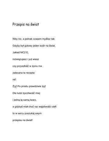 Przepis na świat Niby nic, a jednak czasem myślisz tak: Gdyby był gotowy jeden wzór na świat, Jakieś MC2 E, rozwiązujesz i już wiesz czy przyszłość w życiu ma zalecana ta recepta: ref: Żyj! Po prostu prawdziwie żyj! Dla ludzi życzliwość miej i jedną tę samą twarz, a gdybyś miał choć raz wątpliwości cień to w sercu poszukaj swym przepisu na świat! Niby nic, a jednak czasem bywa, że chytry los wywiedzie cię na ścieżki dwie Choćbyś dobre wzory znał, musisz jedną wybrać sam. Nie wszystko mieści się w maturalnych podręcznikach! ref: Żyj! Po prostu prawdziwie żyj! Dla ludzi życzliwość miej i jedną tę samą twarz, a gdybyś miał choć raz wątpliwości cień to w sercu poszukaj swym przepisu na świat!