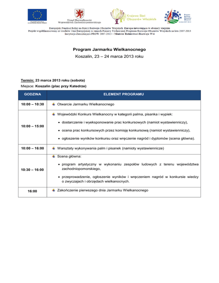 Program Jarmarku Wielkanocnego Koszalin, 23 – 24 marca 2013 roku Termin: 23 marca 2013 roku (sobota) Miejsce: Koszalin (plac przy Katedrze) GODZINA 10:00 – 10:30 ELEMENT PROGRAMU Otwarcie Jarmarku Wielkanocnego Wojewódzki Konkurs Wielkanocny w kategorii palma, pisanka i wypiek: dostarczenie i wyeksponowanie prac konkursowych (namiot wystawienniczy), 10:00 – 15:00 ocena prac konkursowych przez komisję konkursową (namiot wystawienniczy), ogłoszenie wyników konkursu oraz wręczenie nagród i dyplomów (scena główna). 10:00 – 16:00 Warsztaty wykonywania palm i pisanek (namioty wystawiennicze) Scena główna: 10:30 – 16:00 program artystyczny w wykonaniu zespołów ludowych z terenu województwa zachodniopomorskiego, przeprowadzenie, ogłoszenie wyników i wręczeniem nagród w konkursie wiedzy o zwyczajach i obrzędach wielkanocnych. 16:00 Zakończenie pierwszego dnia Jarmarku Wielkanocnego Termin: 24 marca 2013 roku (niedziela) Miejsce: Koszalin (plac przy Katedrze) GODZINA ELEMENT PROGRAMU 10:00 Otwarcie drugiego dnia Jarmarku Wielkanocnego 10:00 – 15:00 Warsztaty wykonywania palm i pisanek (namioty wystawiennicze) Scena główna: program artystyczny w wykonaniu zespołów ludowych z terenu województwa zachodniopomorskiego, przeprowadzenie, ogłoszenie wyników i wręczeniem nagród w konkursie wiedzy 10:00 – 15:00 o zwyczajach i obrzędach wielkanocnych. 15:00 Zakończenie Jarmarku Wielkanocnego