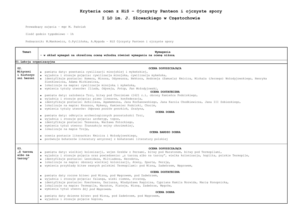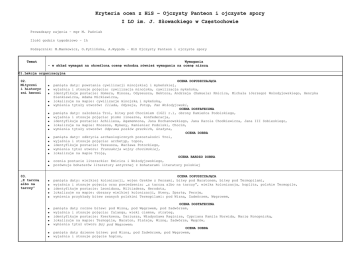 Kryteria ocen z HiS – Ojczysty Panteon i ojczyste spory I LO im. J. Słowackiego w Częstochowie Prowadzący zajęcia – mgr M. Paściak Ilość godzin tygodniowo – 1h Podręcznik: M.Mankowicz, O.Pytlińska, A.Wygoda – HiS Ojczysty Panteon i ojczyste spory Temat Wymagania - w skład wymagań na określoną ocenę wchodzą również wymagania na ocenę niższą 01.Lekcja organizacyjna 02. Mityczni i historyc zni herosi OCENA DOPUSZCZAJĄCA pamięta daty: powstania cywilizacji minojskiej i mykeńskiej, wyjaśnia i stosuje pojęcia: cywilizacja minojska, cywilizacja mykeńska, identyfikuje postacie: Homera, Minosa, Odyseusza, Hektora, Andrzeja (Samuela) Kmicica, Michała (Jerzego) Wołodyjowskiego, Henryka Sienkiewicza, Adama Mickiewicza, lokalizuje na mapie: cywilizacje minojską i mykeńską, wymienia tytuły utworów: Iliada, Odyseja, Potop, Pan Wołodyjowski, OCENA DOSTATECZNA pamięta daty: założenia Troi, bitwy pod Chocimiem (1621 r.), obrony Kamieńca Podolskiego, wyjaśnia i stosuje pojęcia: pismo linearne, konfederacja, identyfikuje postacie: Achillesa, Agamemnona, Jana Kochanowskiego, Jana Karola Chodkiewicza, Jana III Sobieskiego, lokalizuje na mapie: Knossos, Mykeny, Kamieniec Podolski, Chocim, wymienia tytuły utworów: Odprawa posłów greckich, Grażyna, OCENA DOBRA pamięta daty: odkrycia archeologicznych pozostałości Troi, wyjaśnia i stosuje pojęcia: archetyp, topos, identyfikuje postacie: Tezeusza, Wacława Potockiego, wymienia tytuł utworu: Transakcja wojny chocimskiej, lokalizuje na mapie Troję, OCENA BARDZO DOBRA ocenia postacie literackie: Kmicica i Wołodyjowskiego, porównuje bohaterów literatury antycznej z bohaterami literatury polskiej OCENA DOPUSZCZAJĄCA pamięta daty: wielkiej kolonizacji, wojen Greków z Persami, bitwy pod Maratonem, bitwy pod Termopilami, wyjaśnia i stosuje pojęcia oraz powiedzenia: „z tarczą albo na tarczy”, wielka kolonizacja, hoplita, polskie Termopile, identyfikuje postacie: Leonidasa, Miltiadesa, Herodota, lokalizuje na mapie: obszary wielkiej kolonizacji, Ateny, Spartę, Persję, wymienia przykłady bitew zwanych polskimi Termopilami: pod Wizną, Zadwórzem, Węgrowem, 03. „Z tarczą albo na tarczy” OCENA DOSTATECZNA pamięta daty roczne bitew: pod Wizną, pod Węgrowem, pod Zadwórzem, wyjaśnia i stosuje pojęcia: falanga, wieki ciemne, strateg, identyfikuje postacie: Kserksesa, Dariusza, Władysława Raginisa, Cypriana Kamila Norwida, Marię Konopnicką, lokalizuje na mapie: Termopile, Maraton, Plateje, Wiznę, Zadwórze, Węgrów, wymienia tytuł utworu Bój pod Węgrowem, OCENA DOBRA pamięta daty dzienne bitew: pod Wizną, pod Zadwórzem, pod Węgrowem, wyjaśnia i stosuje pojęcie hoplon, 04. „Życie jest krótkie, sława nieśmierte lna” identyfikuje postacie: Heinza Guderiana, Jana Matlińskiego, Władysława Jabłonowskiego, Bolesława Zajączkowskiego, Siemiona Budionnego, Kornela Ujejskiego, przedstawia przebieg bitew zwanych polskimi Termopilami, przedstawia uzbrojenie hoplity, wymienia tytuły utworów: Vanitas, Maraton, Atak pod Węgrowem, OCENA BARDZO DOBRA identyfikuje postać Augusta Barbiera, wyjaśnia przyczyny odwoływania się Polaków do wydarzeń z okresu wojen grecko-perskich, wyjaśnia różnice w pojmowaniu pojęcia patriotyzmu dawniej i dziś 05. Wzorowy obywatel wczoraj i dziś OCENA DOPUSZCZAJĄCA pamięta daty: założenia Rzymu, śmierci Juliusza Cezara, potopu szwedzkiego, przewrotu majowego, wojen punickich, bitwy pod Cecorą, wyjaśnia i stosuje pojęcia i powiedzenia: wojna podjazdowa, „kości zostały rzucone”, „przekroczyć Rubikon”, przewrót majowy, dyktator, tyran, identyfikuje postacie: Aleksandra Macedońskiego, Filipa II, Hannibala, Juliusza Cezara, Oktawiana Augusta, Stefana Czarnieckiego, Bohdana Chmielnickiego, Tadeusza Kościuszkę, Józefa Piłsudskiego, lokalizuje na mapie: starożytną Macedonię, ziemie podbite przez Aleksandra Wielkiego i Filipa II, Kartaginę, Wiedeń, podejmuje próbę oceny wpływu wybranych bohaterów na losy Rzeczypospolitej, OCENA DOSTATECZNA pamięta daty: bitwy pod Cheroneą, początku wyprawy Aleksandra Wielkiego na Persję, bitwy nad Granikiem, bitwy pod Issos, bitwy pod Gaugamelą, drugiej wojny punickiej, bitwy pod Kannami, bitwy pod Zamą, wyprawy Czarnieckiego do Danii, wyjaśnia i stosuje pojęcia: Związek Koryncki, dyktator, identyfikuje postacie: Dariusza III, Scypiona Afrykańskiego, Karola Gustawa, Stanisława Żółkiewskiego, Jana III Sobieskiego, lokalizuje na mapie: Cheroneę, Issos, Gaugamelę, Zamę, Kanny, Galię, Warkę, Maciejowice, Cecorę, charakteryzuje wpływ Stefana Czarnieckiego, Tadeusza Kościuszki i Józefa Piłsudskiego na losy Polski, OCENA DOBRA pamięta daty: utworzenia Związku Korynckiego, bitwy pod Warką, bitwy pod Połonką, identyfikuje postacie: Roksanę, Edgara D’Abernona, lokalizuje na mapie Połonkę, przedstawia wpływ ideału bohatera narodowego na kształtowanie się patriotyzmu późniejszych pokoleń, OCENA BARDZO DOBRA identyfikuje postać Timoleona, konfrontuje ideał antycznego wodza-bohatera z bohaterskimi wodzami wojsk polskich, wymienia okoliczności sprzyjające kształtowaniu się ideału wodza-bohatera w Polsce, ocenia wpływ antycznych wzorców na wybór drogi życiowej przez polskich bohaterów OCENA DOPUSZCZAJĄCA pamięta daty: rozkwitu demokracji ateńskiej, upadku królestwa i republiki w Rzymie, uchwalenia obowiązującej dziś polskiej konstytucji, wyjaśnia i stosuje pojęcia: demokracja ateńska, senat rzymski, zgromadzenie ludowe, demokracja szlachecka, liberum veto, obywatelstwo, narodowość, polis, republika, identyfikuje postacie: Klejstenesa, Mikołaja Reja, Jana Kochanowskiego, Tadeusza Kościuszkę, Stefana Żeromskiego, Henryka Sienkiewicza, podejmuje próbę przedstawienia obowiązków obywatelskich w dzisiejszej Polsce, OCENA DOSTATECZNA pamięta daty: reform ustrojowych Klejstenesa, reform Peryklesa, wyjaśnia i stosuje pojęcia: arystokrac