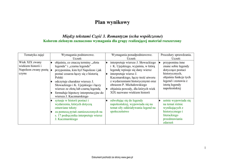 Plan wynikowy Między tekstami Część 3. Romantyzm (echa współczesne) Kolorem zielonym zaznaczono wymagania dla grupy realizującej materiał rozszerzony Tematyka zajęć Wiek XIX zwany ♦ wiekiem historii i Napoleon zwany poetą ♦ czynu ♦ ♦ ♦ ♦ Wymagania podstawowe. Uczeń: objaśnia, co znaczą terminy „złota legenda” i „czarna legenda” przypomina, kim był Napoleon i jak postać cesarza łączy się z historią Polski odczytuje charakter wierszy J. Słowackiego i K. Ujejskiego i łączy wiersze ze złotą lub czarną legendą formułuje hipotezy interpretacyjne do wiersza J. Kaczmarskiego sytuuje w historii postaci i wydarzenia, których dotyczą omawiane teksty za pomocą pytań zamieszczonych na s. 17 podręcznika interpretuje wiersz J. Kaczmarskiego Wymagania ponadpodstawowe. Procedury sprawdzania. Uczeń: Uczeń: ♦ interpretuje wiersze J. Słowackiego ♦ przypomina inne i K. Ujejskiego, wyjaśnia, w którą znane sobie legendy legendę wpisuje się dany wiersz dotyczące postaci historycznych, ♦ interpretuje wiersz J. objaśnia funkcje tych Kaczmarskiego, łączy treść utworu legend i zestawia z z wydarzeniami historycznymi oraz istotą legendy obrazem P. Michałowskiego napoleońskiej ♦ objaśnia powody, dla których wiek XIX nazwano wiekiem historii ♦ odwołując się do legendy ♦ ustnie wypowiada się napoleońskiej, wypowiada się na na temat różnic temat siły oddziaływania legend na wynikających z społeczeństwo historycznego i literackiego przedstawiania zdarzeń 1 Dokument pochodzi ze strony www.gwo.pl „Jeszcze Polska nie ♦ przypomina literackie i plastyczne zginęła...” – narodziny wyobrażenia umierającej Polski np. narodu polskiego Żale Sarmaty... F. Karpinskiego ♦ odwołując się do tekstów J. Morelowskiego i J. Wybickiego, przedstawia dwie wizje losu Polaków w Polsce pod zaborami ♦ zabiera głos w rozmowie o napisach na murach i ich politycznej roli Buntownicy nie bez ♦ streszcza historie mitycznego powodu Prometeusza i biblijnego Kaina ♦ zna fragment Prometeusza wyzwolonego i wskazuje związek tekstu P. B. Shelleya z antycznym mitem (osoba bohatera, bunt przeciw bogu, poświęcenie) ♦ zna fragment Kaina G. G. Byrona i wskazuje różnice między biblijnym a Byronowskim ujęciem bohatera (np. brak zrozumienia dla konieczności składania ofiar) ♦ łączy nazwiska romantycznych twórców z tematami znanymi z antyku ♦ interpretuje wiersze J. ♦ recytuje z pamięci Morelowskiego i J. Wybickiego Pieśń legionów polskich we Włoszech ♦ odwołując się do omawianych wierszy, formułuje wnioski na temat zmian w pojmowaniu narodu, tożsamości narodowej i państwa ♦ dyskutuje o niemilitarnych sposobach walki o wolność, swobodę wypowiedzi itp. ♦ referuje stanowisko F. Schlegla na ♦ pisemnie odpowiada temat potrzeby nowej mitologii na pytania ze s. 23 podręcznika ♦ wskazuje różnice między antycznym a romantycznym ujęciem tych samych tematów i motywów ♦ formułuje przypuszczenia na temat źródeł romantycznej potrzeby reinterpretacji mitycznych historii i konfrontuje je ze zdaniem F. Schlegla na ten temat ♦ wypowiada własne zdanie na temat potrzeby i istoty buntu 2 Dokument pochodzi ze strony www.gwo.pl Romantyczni bluźniercy – w pracowni doktora Fausta Romantyczni bluźniercy – w gabinecie doktora Frankensteina ♦ wskazuje w nowożytnym ujęciu ♦ wypowiada się na temat ♦ samodzielnie pisemnie historii Prometeusza i Kaina romantycznego pojmowania buntu i porównuje antyczną i problematykę romantycznej potrzeby w tym kontekście wymienia postaci romantyczną kreacją buntu Prometeusza i Kaina omawianych bohaterów ♦ wypowiada się na temat ♦ w kontekście wypowiedzi H.-G. kulturotwórczej roli antyku i jego Gadamera wskazuje aksjologiczne wpływu na literaturę europejską aspekty nowożytnych opowieści o starożytnych buntownikach (bunt jako forma poznania i wniknięcia w człowieczeństwo) ♦ porównuje Fausta przedstawionego w ♦ objaśnia, na czym polega ♦ formułuje odpowiedź dwóch kreacjach literackich uniwersalizm historii Fausta na pytanie 7. ze s. 38 podręcznika ♦ na podstawie tekstu S. Vincenza ♦ zabiera głos w dyskusji na temat wyjaśnia powody zainteresowania cywilizacji postępu oraz związanych literatury Faustem z nią zagrożeń i nadziei ♦ wymienia jedną z teatralnych realizacji historii Fausta ♦ objaśnia znaczenie pojęcia „okres burzy i naporu” ♦ opowiadając historię doktora ♦ porównuje bluźnierstwo ♦ pisze notatkę, w której Frankensteina, wskazuje Frankensteina z bluźnierstwem wyjaśnia, dlaczego podobieństwo intencji Frankensteina i Prometeusza i przedstawia wnioski czyn Wiktora Prometeusza wynikające z tego zestawienia Frankensteina jest bluźnierstwem ♦ wypowiada własne zdanie na temat ♦ wnioskuje na temat popularności zagrożeń, jakie może nieść rozwój historii doktora Frankensteina nauki 3 Dokument pochodzi ze strony www.gwo.pl Romantyczni ♦ podaje przynajmniej dwa tematy, bluźniercy – zmagania które podejmuje Konrad w swym z Bogiem w celi monologu Bazylianów ♦ wyjaśnia, na czym polega bluźnierstwo Konrada ♦ na podstawie wybranego fragmentu tekstu ocenia postawę Konrada ♦ wyjaśnia, z czego wynika podobieństwo Konrada i Prometeusza ♦ wskazuje symboliczne aspekty sceny (obecność duchów, umieszczenie ich po prawej i lewej stronie) ♦ wskazuje motywy i konsekwencje działań Konrada ♦ wskazuje wspólne cechy romantycznych bluźnierców ♦ w kontekście Wielkiej Improwizacji wyjaśnia, czym jest prometeizm Republika młodych ♦ objaśnia sposób i cele działania Towarzystwa Filomatów ♦ wyjaśnia, czym jest z biografia ♦ zna najważniejsze fakty z biografii A. Mickiewicza ♦ na podstawie swojej wiedzy o młodzieży filomackiej wyjaśnia pojęcie „republika młodych” ♦ dostrzega problematykę Wielkiej Improwizacji ♦ w kontekście całej Wielkiej Improwizacji