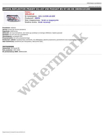 Informacje o produkcie Utworzono 04-03-2017 LAMPA REFLEKTOR PRAWY H1+H7 VW PASSAT B5 97-00 OE 3B0941018K Cena : 106,63 zł Nr katalogowy : 441-1125R-LD-EM Producent : DEPO Stan magazynowy : brak w magazynie Średnia ocena : brak recenzji w at ZASTOSOWANIE Samochód: VW Passat B5 Rok produkcji: 1997-2000 Nr porównawczy OEM: 3B0941018K er m ar k Przedmiot: reflektor Strona: prawa (po stronie pasażera) Regulacja: elektryczna Silniczek: nie ma w komplecie, ale można go przełożyć ze starego reflektora i będzie pasował Żarówka: H1+H7 (nie ma w komplecie) Homologacja: europejska ECE Przeznaczenie: do ruchu prawostronnego Producent / jakość: wysokiej klasy zamiennik, nie odbiegający jakością wykonania, parametrami oraz wyglądem od oryginału Stan techniczny: przedmiot jest nieużywany, fabrycznie nowy. Wygenerowano w programie www.oscGold.com