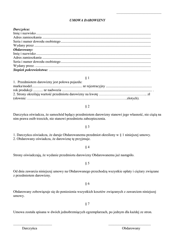 ................................................... UMOWA DAROWIZNY Darczyńca: Imię i nazwisko .................................................................................................................................. Adres zamieszkania ........................................................................................................................... Seria i numer dowodu osobistego ...................................................................................................... Wydany przez .................................................................................................................................... Obdarowany: Imię i nazwisko .................................................................................................................................. Adres zamieszkania ........................................................................................................................... Seria i numer dowodu osobistego ...................................................................................................... Wydany przez. ................................................................................................................................... Stopień pokrewieństwa: …………………………………………………………………………… §1 1. Przedmiotem darowizny jest połowa pojazdu: marka/model......................................................... nr rejestracyjny .................................................... rok produkcji ........... nr nadwozia ...................................................................................................... . 2. Strony określają wartość przedmiotu darowizny na kwotę ………………………………….. zł (słownie: ………………………………………………………………………….złotych). §2 Darczyńca oświadcza, że samochód będący przedmiotem darowizny stanowi jego własność, nie ciążą na nim prawa osób trzecich, nie stanowi przedmiotu zabezpieczenia. §3 1. Darczyńca oświadcza, że daruje Obdarowanemu przedmiot określony w § 1 niniejszej umowy. 2. Obdarowany oświadcza, że darowiznę tę przyjmuje. §4 Strony oświadczają, że wydanie przedmiotu darowizny Obdarowanemu już nastąpiło. §5 Od dnia zawarcia niniejszej umowy na Obdarowanego przechodzą wszystkie opłaty i ciężary związane z przedmiotem darowizny. §6 Obdarowany zobowiązuje się do poniesienia wszystkich kosztów związanych z zawarciem niniejszej umowy. §7 Umowa została spisana w dwóch jednobrzmiących egzemplarzach, po jednym dla każdej ze stron. ............................................ Darczyńca ................................................ Obdarowany
