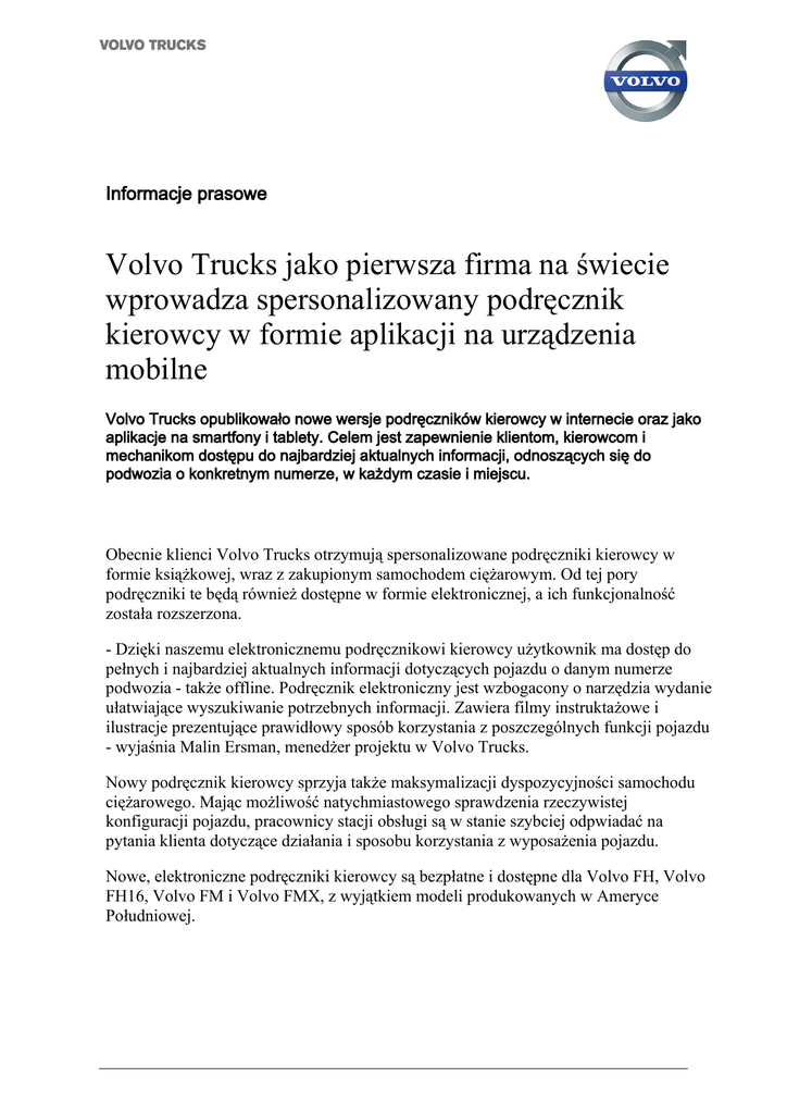 Informacje prasowe Volvo Trucks jako pierwsza firma na świecie wprowadza spersonalizowany podręcznik kierowcy w formie aplikacji na urządzenia mobilne Volvo Trucks opublikowało nowe wersje podręczników kierowcy w internecie oraz jako aplikacje na smartfony i tablety. Celem jest zapewnienie klientom, kierowcom i mechanikom dostępu do najbardziej aktualnych informacji, odnoszących się do podwozia o konkretnym numerze, w każdym czasie i miejscu. Obecnie klienci Volvo Trucks otrzymują spersonalizowane podręczniki kierowcy w formie książkowej, wraz z zakupionym samochodem ciężarowym. Od tej pory podręczniki te będą również dostępne w formie elektronicznej, a ich funkcjonalność została rozszerzona. - Dzięki naszemu elektronicznemu podręcznikowi kierowcy użytkownik ma dostęp do pełnych i najbardziej aktualnych informacji dotyczących pojazdu o danym numerze podwozia - także offline. Podręcznik elektroniczny jest wzbogacony o narzędzia wydanie ułatwiające wyszukiwanie potrzebnych informacji. Zawiera filmy instruktażowe i ilustracje prezentujące prawidłowy sposób korzystania z poszczególnych funkcji pojazdu - wyjaśnia Malin Ersman, menedżer projektu w Volvo Trucks. Nowy podręcznik kierowcy sprzyja także maksymalizacji dyspozycyjności samochodu ciężarowego. Mając możliwość natychmiastowego sprawdzenia rzeczywistej konfiguracji pojazdu, pracownicy stacji obsługi są w stanie szybciej odpwiadać na pytania klienta dotyczące działania i sposobu korzystania z wyposażenia pojazdu. Nowe, elektroniczne podręczniki kierowcy są bezpłatne i dostępne dla Volvo FH, Volvo FH16, Volvo FM i Volvo FMX, z wyjątkiem modeli produkowanych w Ameryce Południowej. Nowe podręczniki są dostępne zarówno na stronie internetowej, jak i w formie aplikacji na smartfony i tablety, do pobrania z AppStore i Google Play. 19 sierpnia 2014 r. W celu uzyskania dodatkowych informacji, prosimy o kontakt z: Agneta Malmcrona, Volvo Trucks Media Relations. Tel.: +46 31 322 07 07, e-mail: [email protected] Aby uzyskać dostęp do filmów o jakości telewizyjnej, związanych z niniejszą informacją prasową i nie tylko, odwiedź stronę http://www.thenewsmarket.com/volvotrucks Zdjęcia i filmy są dostępne w galerii zdjęć i filmów Volvo Trucks, pod adresem http://images.volvotrucks.com Koncern Volvo Trucks dostarcza kompletne rozwiązania transportowe dla profesjonalistów i wymagających klientów, oferując pełną gamę samochodów ciężarowych o średniej i dużej ładowności. Serwis zapewnia 2100 dealerów i stacji obsługi w ponad 140 krajach. Samochody ciężarowe są produkowane w 14 krajach. W 2013 r. dostarczono ponad 116 000 tych pojazdów. Koncern Volvo Trucks jest częścią Grupy Volvo, jednego z czołowych światowych producentów samochodów ciężarowych, autobusów, maszyn budowlanych oraz morskich i stacjonarnych układów napędowych. Grupa Volvo dostarcza również kompletne rozwiązania finansowe i serwisowe. Kluczowymi wartościami Volvo są jakość, bezpieczeństwo i troska o środowisko naturalne.