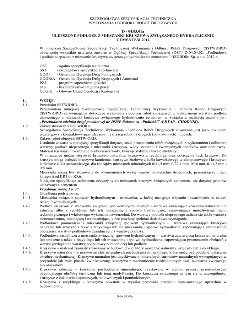 SZCZEGÓŁOWA SPECYFIKACJA TECHNICZNA WYKONANIA I ODBIORU ROBÓT DROGOWYCH D - 04.05.01a ULEPSZONE PODŁOŻE Z MIESZANKI KRUSZYWA ZWIĄZANEGO HYDRAULICZNIE CEMENTEM 2012 W niniejszej Szczegółowej Specyfikacji Technicznej Wykonania i Odbioru Robót Drogowych (SSTWiORD) obowiązują wszystkie ustalenia zawarte w Ogólnej Specyfikacji Technicznej (OST) D-04.04.02. „Podbudowa i podłoże ulepszone z mieszanki kruszywa związanego hydraulicznie cementem.” BZDBDiM Sp. z o.o. 2012 r. OST SST GDDP GDDKiA PZJ bhp. GUGiK 1. 1.1. 1.2. 1.3. 1.4. 1.4.1. 1.4.2. 1.4.3. 1.4.4. 1.4.5. 1.4.6. 1.4.7. 1.4.8. - ogólna specyfikacja techniczna - szczegółowa specyfikacja techniczna - Generalna Dyrekcja Dróg Publicznych - Generalna Dyrekcja Dróg Krajowych i Autostrad - program zapewnienia jakości - bezpieczeństwo i higiena pracy - Główny Urząd Geodezji i Kartografii WSTĘP. Przedmiot SSTWiORD. Przedmiotem niniejszej Szczegółowej Specyfikacji Technicznej Wykonania i Odbioru Robót Drogowych (SSTWiORD) są wymagania dotyczące wykonania i odbioru robót związanych z wykonaniem warstwy podłoża ulepszonego z mieszanki kruszywa związanego hydraulicznie cementem w związku z realizacją zadania pn.: „Przebudowa odcinka drogi powiatowej nr 4928P Rokosowo - Pudliszki” (I ETAP - CHODNIK). Zakres stosowania SSTWiORD. Szczegółowa Specyfikacja Techniczna Wykonania i Odbioru Robót Drogowych stosowana jest jako dokument przetargowy i kontraktowy przy zlecaniu i realizacji robót na drogach (powiatowych) i ulicach. Zakres robót objętych SSTWiORD. Ustalenia zawarte w niniejszej specyfikacji dotyczą zasad prowadzenia robót związanych z wykonaniem i odbiorem warstwy podłoża ulepszonego z mieszanki kruszywa, wody, cementu i ewentualnych dodatków oraz domieszek. Materiał ten wiąże i twardnieje w obecności wody, tworząc stabilne i trwałe struktury. W mieszance można stosować kruszywo naturalne, kruszywo z recyklingu oraz połączenia tych kruszyw. Do kruszyw mogą należeć kruszywo kamienne, kruszywo żużlowe z żużla kawałkowego wielkopiecowego i kruszywo żużlowe z żużla stalowniczego, dla rodzajów mieszanek mineralnych 0/31,5 mm, 0/22,4 mm, 0/16 mm, 0/11,2 mm i 0/8 mm. Mieszanki mogą być stosowane do wymienionych wyżej warstw nawierzchni drogowych, przenoszących ruch kategorii od KR1 do KR6. Niniejsza specyfikacja techniczna dotyczy tylko mieszanek kruszyw związanych cementem, nie dotyczy gruntów ulepszonych cementem. Przedmiar robót, Lp. 17. Określenia podstawowe. Mieszanka związana spoiwem hydraulicznym – mieszanka, w której następuje wiązanie i twardnienie na skutek reakcji hydraulicznych. Podłoże ulepszone z mieszanki związanej spoiwem hydraulicznym – warstwa zawierająca kruszywo naturalne lub sztuczne albo z recyklingu lub ich mieszaninę i spoiwo hydrauliczne, zapewniająca umożliwienie ruchu technologicznego i właściwego wykonania nawierzchni. Do warstwy podłoża ulepszonego zalicza się także warstwę mrozoochronną, odcinającą i wzmacniającą, które powinny spełniać dodatkowe wymagania. Podbudowa pomocnicza z mieszanki związanej spoiwem hydraulicznym – warstwa zawierająca kruszywo naturalne lub sztuczne a także z recyklingu lub ich mieszaninę i spoiwo hydrauliczne, zapewniająca przenoszenie obciążeń z warstwy podbudowy zasadniczej na warstwę podłoża. Podbudowa zasadnicza z mieszanki związanej spoiwem hydraulicznym – warstwa zawierająca kruszywo naturalne lub sztuczne a także z recyklingu lub ich mieszaninę i spoiwo hydrauliczne, zapewniająca przenoszenie obciążeń z warstw jezdnych na warstwę podbudowy pomocniczej lub podłoże. Kruszywo – materiał ziarnisty stosowany w budownictwie, który może być naturalny, sztuczny lub z recyklingu. Kruszywo naturalne – kruszywo ze złóż naturalnych pochodzenia mineralnego, które może być poddane wyłącznie obróbce mechanicznej. Kruszywo naturalne jest uzyskiwane z mineralnych surowców naturalnych występujących w przyrodzie jak żwir, piasek, żwir kruszony, kruszywo z mechanicznie rozdrobnionych skał, nadziarna żwirowego lub otoczaków. Kruszywo sztuczne – kruszywo pochodzenia mineralnego, uzyskiwane w wyniku procesu przemysłowego obejmującego obróbkę termiczną lub inną modyfikację. Do kruszywa sztucznego zalicza się w szczególności kruszywo z żużli: wielkopiecowych, stalowniczych i pomiedziowych. Kruszywo z recyklingu – kruszywo powstałe w wyniku przeróbki materiału zastosowanego uprzednio w budownictwie. ____________________________________________________________________________________________________________________________________________________________________________________________________________ D-04.05.01a 1.4.9. 1.4.10. 1.4.11. 1.4.12. 1.4.13. 1.4.14. 1.4.15. 1.4.16. 1.4.17. 1.4.18. 1.5. 2. 2.1. 2.2. 2.2.1. 2.2.2. 2.2.3. Kruszywo kamienne – kruszywo z mineralnych surowców jak żwir kruszony, mechanicznie rozdrobnione skały, nadziarno żwirowe. Kruszywo żużlowe z żużla wielkopiecowego – kruszywo składające się głównie ze skrystalizowanych krzemianów lub glinokrzemianów wapnia i magnezu uzyskanych przez powolne schładzanie powietrzem ciekłego żużla wielkopiecowego. Proces chłodzenia może odbywać się przy kontrolowanym dodawaniu wody. Chłodzony powietrzem żużel wielkopiecowy twardnieje dzięki reakcji hydraulicznej lub karbonatyzacji. Kruszywo żużlowe z żużla stalowniczego – kruszywo składające się głównie ze skrystalizowanego krzemianu wapnia i ferrytu zawierającego CaO, SiO2, MgO oraz tlenek żelaza. Kruszywo otrzymuje się przez powolne schładzanie powietrzem ciekłego żużla stalowniczego. Proces chłodzenia może odbywać się przy kontrolowanym dodawaniu wody. Kategoria ruchu (KR1 – KR6) – obciążenie drogi ruchem samochodowym, wyrażone w osiach obliczeniowych (100 kN) według „Katalogu typowych konstrukcji nawierzchni podatnych i półsztywnych”. Generalna Dyrekcja Dróg 