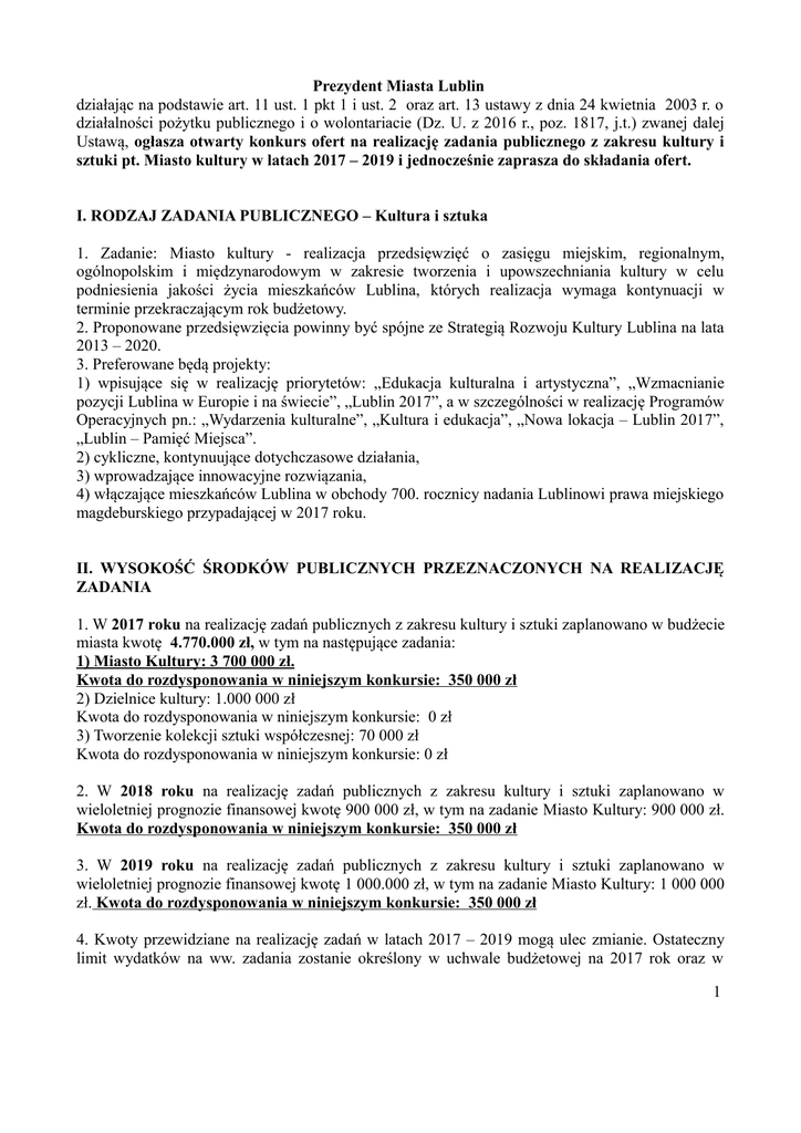 Prezydent Miasta Lublin działając na podstawie art. 11 ust. 1 pkt 1 i ust. 2 oraz art. 13 ustawy z dnia 24 kwietnia 2003 r. o działalności pożytku publicznego i o wolontariacie (Dz. U. z 2016 r., poz. 1817, j.t.) zwanej dalej Ustawą, ogłasza otwarty konkurs ofert na realizację zadania publicznego z zakresu kultury i sztuki pt. Miasto kultury w latach 2017 – 2019 i jednocześnie zaprasza do składania ofert. I. RODZAJ ZADANIA PUBLICZNEGO – Kultura i sztuka 1. Zadanie: Miasto kultury - realizacja przedsięwzięć o zasięgu miejskim, regionalnym, ogólnopolskim i międzynarodowym w zakresie tworzenia i upowszechniania kultury w celu podniesienia jakości życia mieszkańców Lublina, których realizacja wymaga kontynuacji w terminie przekraczającym rok budżetowy. 2. Proponowane przedsięwzięcia powinny być spójne ze Strategią Rozwoju Kultury Lublina na lata 2013 – 2020. 3. Preferowane będą projekty: 1) wpisujące się w realizację priorytetów: „Edukacja kulturalna i artystyczna”, „Wzmacnianie pozycji Lublina w Europie i na świecie”, „Lublin 2017”, a w szczególności w realizację Programów Operacyjnych pn.: „Wydarzenia kulturalne”, „Kultura i edukacja”, „Nowa lokacja – Lublin 2017”, „Lublin – Pamięć Miejsca”. 2) cykliczne, kontynuujące dotychczasowe działania, 3) wprowadzające innowacyjne rozwiązania, 4) włączające mieszkańców Lublina w obchody 700. rocznicy nadania Lublinowi prawa miejskiego magdeburskiego przypadającej w 2017 roku. II. WYSOKOŚĆ ŚRODKÓW PUBLICZNYCH PRZEZNACZONYCH NA REALIZACJĘ ZADANIA 1. W 2017 roku na realizację zadań publicznych z zakresu kultury i sztuki zaplanowano w budżecie miasta kwotę 4.770.000 zł, w tym na następujące zadania: 1) Miasto Kultury: 3 700 000 zł. Kwota do rozdysponowania w niniejszym konkursie: 350 000 zł 2) Dzielnice kultury: 1.000 000 zł Kwota do rozdysponowania w niniejszym konkursie: 0 zł 3) Tworzenie kolekcji sztuki współczesnej: 70 000 zł Kwota do rozdysponowania w niniejszym konkursie: 0 zł 2. W 2018 roku na realizację zadań publicznych z zakresu kultury i sztuki zaplanowano w wieloletniej prognozie finansowej kwotę 900 000 zł, w tym na zadanie Miasto Kultury: 900 000 zł. Kwota do rozdysponowania w niniejszym konkursie: 350 000 zł 3. W 2019 roku na realizację zadań publicznych z zakresu kultury i sztuki zaplanowano w wieloletniej prognozie finansowej kwotę 1 000.000 zł, w tym na zadanie Miasto Kultury: 1 000 000 zł. Kwota do rozdysponowania w niniejszym konkursie: 350 000 zł 4. Kwoty przewidziane na realizację zadań w latach 2017 – 2019 mogą ulec zmianie. Ostateczny limit wydatków na ww. zadania zostanie określony w uchwale budżetowej na 2017 rok oraz w 1 wieloletniej prognozie finansowej. 5. Prezydent Miasta Lublin zastrzega sobie prawo do zmniejszenia lub zwiększenia środków przeznaczonych do rozdysponowania w niniejszym konkursie po zapoznaniu się z protokołem i rekomendacjami komisji konkursowej. III. ZASADY PRZYZNAWANIA DOTACJI 1. Podmiotami uprawnionymi do złożenia oferty są: organizacje pozarządowe w rozumieniu Ustawy, osoby prawne i jednostki organizacyjne działające na podstawie przepisów o stosunku Państwa do Kościoła Katolickiego w Rzeczypospolitej Polskiej, o stosunku Państwa do innych kościołów i związków wyznaniowych oraz o gwarancjach wolności sumienia i wyznania, jeżeli ich cele statutowe obejmują prowadzenie działalności pożytku publicznego, stowarzyszenia jednostek samorządu terytorialnego, spółdzielnie socjalne, spółki akcyjne i spółki z ograniczoną odpowiedzialnością oraz kluby sportowe będące spółkami działającymi na podstawie przepisów ustawy z dnia 25 czerwca 2010 r. o sporcie (j.t. Dz. U. z 2016 r. poz. 176 ze zm.), które nie działają w celu osiągnięcia zysku oraz przeznaczają całość dochodu na realizację celów statutowych oraz nie przeznaczają zysku do podziału między swoich udziałowców, akcjonariuszy i pracowników. 2. O dotację na realizację zadania mogą się ubiegać wyłącznie podmioty, które prowadzą działalność statutową w dziedzinie objętej konkursem. Potwierdzeniem tego faktu są właściwe zapisy w statucie lub innym równoważnym dokumencie (jeśli przepisy dotyczące podmiotu nie nakładają obowiązku posiadania statutu). 3. Forma realizacji zadania: wspieranie. 4. Na zadanie „Miasto Kultury” jeden Oferent może złożyć maksymalnie 2 oferty. 5. Postępowanie w sprawie przyznania dotacji odbywać się będzie zgodnie z zasadami określonymi w Ustawie, w Programie współpracy Gminy Lublin z organizacjami pozarządowymi oraz z podmiotami, o których mowa w art. 3 ust. 3 Ustawy oraz w Zarządzeniu nr 18/11/2016 Prezydenta Miasta Lublin z dnia 14 listopada 2016 r. w sprawie określenia wzoru kart oceny w otwartych konkursach ofert na realizację zadań publicznych przez organizacje pozarządowe oraz podmioty wymienione w art. 3 ust. 3 Ustawy. 6. Oferta powinna być złożona zgodnie z wzorem określonym w Załączniku Nr 1 do Rozporządzenia Ministra Rodziny, Pracy i Polityki Społecznej z dnia 17.08.2016 r. w sprawie wzorów ofert i ramowych wzorów umów dotyczących realizacji zadań publicznych oraz wzorów sprawozdań z wykonania tych zadań (Dz. U. z 2016 r. poz. 1300). 7. Ofertę należy obligatoryjnie: - wypełnić i złożyć w formie elektronicznej za pomocą platformy internetowej „WITKAC” dostępnej na stronie www.witkac.pl - złożyć w formie papierowej zgodnej z wersją elektroniczną przygotowaną w elektronicznym generatorze ofert. Uwaga! Oferty złożone wyłącznie w formie elektronicznej lub wyłącznie w formie papierowej nie będą rozpatrywane. 8. Organizacje pozarządowe lub podmioty wymienione w art. 3 ust. 3 Ustawy działające wspólnie mogą złożyć ofertę wspólną. 9. Oferta musi być czytelnie i kompletnie wypełniona (z zastrzeżeniem pkt. 11), zawierać wszystkie 2 wskazane w jej treści
