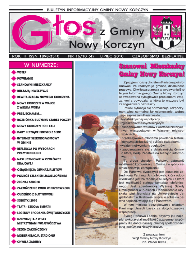 Anna Nowak Serdecznie witam wszystkich Mieszkańców Gminy Nowy Korczyn Nowy Korczyn inż. Wiktor Kwas powierzył mi funkcję współpracy z Państwem. Czuję sie więc zaszczycona, ale jednocześnie zobowiązana do takiej współpracy, która usatysfakcjonuje wszystkich zainteresowanych i przyniesie wymierny rezultat dla podwyższenia standardu życia w Gminie i dla lepszego samopoczucia każdego z nas. Dołożę wszelkich starań, aby nie zawieść Państwa oczekiwań, jak również oczekiwań mojego pracodawcy i postaram się być wszędzie tam, gdzie toczy sie życie w Gminie w sposób szczególny, gdzie pozyskam informacje, które będą istotne dla Państwa i które w nasze życie coś wniosą. Będę dzieliła się z Państwem wszystkimi wydarzeniami i tymi radosnymi i tymi smutnymi i tymi ważnymi i tymi mniej ważnymi. Szukać będę przede wszystkim informacji prawdziwych, niezakłamanych, nieegoistycznych, niepodsyconych emocjami, ale wobec zjawisk negatywnych nie pozostanę też obojętna. W obiektywny sposób będę starała się przekazać Państwu wszystko to, co dzieje się w Gminie, abyście nie czuli się wyizolowani ze społeczności gminnej, abyście nie musieli dowiadywać sie o wydarzeniach w Gminie z „poczty pantoflowej”, bo ona jest zawsze wypaczona, nieobiektywna, abyście czuli się podmiotami. Z biegiem czasu myślę, że uda się zaangażować Państwa do współpracy, do wspólnej odpowiedzialności, do wytworzenia atmosfery, w której wszystkim będzie się żyło lepiej. Takie właśnie jest życzenie i oczekiwanie Pana Wójta. wizytami i namawiała do wspólnej pracy, za co z góry już przepraszam, ale taka jest rola redaktora. Teraz chciałabym w kilku zdaniach przedstawić Państwu swoja osobę. Nazywam się Anna Nowak, mieszkam w Górnowoli wraz z mężem i trzyletnią córeczką Natalią. Ukończyłam Uniwersytet Jagielloński z tytułem licencjata na kierunku matematyka, natomiast w roku bieżącym obroniłam pracę magisterską na kierunku ekonomia w Wyższej Szkole Umiejętności w Kielcach. Kierunki moich studiów ukazują mnie zapewne jako osobę o umyśle ścisłym, posługującą się liczbami i utartymi schematami. Odnalazłam jednak w sobie zapał do bycia tam, gdzie dzieje się coś ważnego, ciekawego, by później móc Państwu zdać relację, uwiecznić na fotografiach te chwile. Drzemią więc we mnie pokłady humanistyczne. Już na starcie wiem, jak wiele czasu i poświęcenia wymaga przygotowanie tekstów i reportaży. Niemniej jednak widzę również, ile satysfakcji i radości daje świadomość, że oto w ręku trzymam wspólne dzieło całej Redakcji, które będzie służyło nam wszystkim, w mniejszym czy większym zakresie, ale na pewno z niego skorzystamy. Dlatego mam nadzieję, że praca nad wydawaniem biuletynu będzie owocna, pozwoli Państwu inaczej spojrzeć na nasza gminę, bardziej uważnie, może z mniejszym dystansem. Dla siebie natomiast pragnę, by praca ta dawała możliwość rozwijania się, odnajdywania w różnych sytuacjach, niejednokrotnie trudnych i stresujących, a także by była szansą na spotykanie się na co dzień z ciekawymi ludźmi, którzy będą się dzielić ze mną i z Państwem swoją bogatą wiedzą i mądrością życiową. Na koniec pragnę także podziękować wszystkim osobom, które zaangażowały się w wydanie inauguracyjnego egzemplarza biuletynu i z ogromną życzliwością dzieliły się swoją wiedzą. Serdecznie pozdrawiam mgr Anna Nowak Jestem optymistką, toteż wierzę, że nam się to uda i będę Państwa nękała telefonami oraz osobistymi Wiktor Kwas – Wójt Gminy Nowy Korczyn Szanowni Mieszkańcy! W kilku zdaniach chciałbym Państwu przekazać informację o tym, co aktualnie dzieje się w Gminie. Powódź, która dała się mocno we znaki, mamy już na szczęście poza sobą i w tym miejscu jeszcze raz bardzo serdecznie dziękuję wszystkim, bez wyjątku, którzy z taką ofiarnością się w nią zaangażowali i wspólnym wysiłkiem nie dopuściliśmy do przerwania wałów, to było naszym niewątpliwym sukcesem. Miejmy nadzieję, że już w tym roku warunki atmosferyczne oszczędzą Gminę Nowy Korczyn. Doraźne skutki powodzi zostały zażegnane, wyremontowałem zdewastowane ciężkim sprzętem odcinki dróg na dojazdach do wałów. Docelowe rozwiązania, zabezpieczające przed skutkami powodzi wymagają rozwiązań tech- nicznych, głównie ze szczebla centralnego. W gminie podejmować będziemy działania zabezpieczające najbardziej newralgiczne punkty, szczególnie w Nowym Korczynie tj. szkoła, kościół, ujęcie wody, ale również w Łęce, Brzostkowie, Podraju i Podzamczu – konieczność naprawienia śluz. Aktualnie koncentrujemy się głównie na zadaniach inwestycyjnych, które właśnie z powodu powodzi weszły do realizacji z niewielkim opóźnieniem. Rozpoczęta została budowa stadionu, na którą tak wszyscy czekają, rozpoczęto także budowę drogi do Pomnika Piłsudskiego w Czarkowach, podpisałem umowę na rewitalizację terenu w Strożyskach wraz z budową placu zabaw i boiska, w najbliższych dniach wkroczy Wykonawca na przebudowę ulicy Pocztowej w Nowym Korczynie, nabyliśmy nowy pojazd do zbierania śmieci, wyremontowany i odnowiony wewnątrz i na zewnątrz został budynek Gminnego Ośrodka Kultury, w którym ponownie będzie funkcjonował Posterunek Policji. Teraz już w dziewiętnastu sołectwach ruszą naprawy dróg tzw. schetynówek, ze środków powodziowych oraz z pieniędzy gminy. W ramach tego zadania przewidziana jest także przebudowa ulic w Nowym Korczynie: Partyzantów, Piłsudskiego, Zaścianek, Tarnowska, Krakowska. Pogłębiamy na bieżąco rowy przydrożne, żeby usprawnić przepływ wody, a tym samym dobrze odwodnić drogi, żeby nie ulegały niszczeniu w okresie zimy, tzw. przełomy. Poprawi się też efekt estetyczny dróg i bezpośredniego otoczenia. Następnie planujemy, jeszcze w roku bieżącym realizację trzynastu 