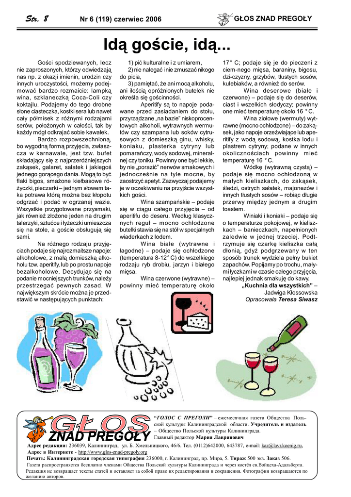 Str. 8 GŁOS ZNAD PREGOŁY Nr 6 (119) czerwiec 2006 Idą goście, idą... Gości spodziewanych, lecz nie zaproszonych, którzy odwiedzają nas np. z okazji imienin, urodzin czy innych uroczystości, możemy podejmować bardzo rozmaicie: lampką wina, szklaneczką Coca-Coli czy koktajlu. Podajemy do tego drobne słone ciasteczka, kostki sera lub nawet cały półmisek z różnymi rodzajami serów, położonych w całości, tak by każdy mógł odkrajać sobie kawałek. Bardzo rozpowszechnioną, bo wygodną formą przyjęcia, zwłaszcza w karnawale, jest tzw. bufet składający się z najprzeróżniejszych zakąsek, galaret, sałatek i jakiegoś jednego gorącego dania. Mogą to być flaki bigos, smażone kiełbasowe różyczki, pieczarki – jednym słowem taka potrawa którą można bez kłopotu odgrzać i podać w ogrzanej wazie. Wszystkie przygotowane przysmaki, jak również złożone jeden na drugim talerzyki, sztućce i łyżeczki umieszcza się na stole, a goście obsługują się sami. Na różnego rodzaju przyjęciach podaje się najrozmaitsze napoje: alkoholowe, z małą domieszką alkoholu tzw. aperitify, lub po prostu napoje bezalkoholowe. Decydując się na podanie mocniejszych trunków, należy przestrzegać pewnych zasad. W największym skrócie można je przedstawić w następujących punktach: 1) pić kulturalne i z umiarem, 2) nie nalegać i nie zmuszać nikogo do picia, 3) pamiętać, że ani mocą alkoholu, ani ilością opróżnionych butelek nie określa się gościnności. Aperitify są to napoje podawane przed zasiadaniem do stołu, przyrządzane „na bazie” niskoprocentowych alkoholi, wytrawnych wermutów czy szampana lub soków cytrusowych z domieszką ginu, whisky, koniaku, plasterka cytryny lub pomarańczy, wody sodowej, mineralnej czy toniku. Powinny one być lekkie, by nie „porazić” nerwów smakowych i jednocześnie na tyle mocne, by zaostrzyć apetyt. Zazwyczaj podajemy je w oczekiwaniu na przyjście wszystkich gości. Wina szampańskie – podaje się w ciągu całego przyjęcia – od aperitifu do deseru. Według klasycznych reguł – mocno ochłodzone butelki stawia się na stół w specjalnych wiaderkach z lodem. W ina białe (wytrawne i łagodne) – podaje się ochłodzone (temperatura 8-12° C) do wszelkiego rodzaju ryb drobiu, jarzyn i białego mięsa. Wina czerwone (wytrawne) – powinny mieć temperaturę około 17° C; podaje się je do pieczeni z ciem-nego mięsa, baraniny, bigosu, dzi-czyzny, grzybów, tłustych sosów, kulebiaków, a również do serów. W ina deserowe (białe i czerwone) – podaje się do deserów, ciast i wszelkich słodyczy; powinny one mieć temperaturę około 16 ° C. Wina ziołowe (wermuty) wytrawne (mocno ochłodzone) – do zakąsek, jako napoje orzeźwiające lub aperitify z wodą sodową, kostka lodu i plastrem cytryny; podane w innych okolicznościach powinny m ieć temperaturę 16 ° C. Wódkę (wytrawną czystą) – podaje się mocno ochłodzoną w małych kieliszkach, do zakąsek, śledzi, ostrych sałatek, majonezów i innych tłustych sosów – robiąc długie przerwy między jednym a drugim toastem. Winiaki i koniaki – podaje się o temperaturze pokojowej, w kieliszkach – banieczkach, napełnionych zaledwie w jednej trzeciej. Podtrzymuje się czarkę kieliszka całą dłonią, gdyż podgrzewany w ten sposób trunek wydziela pełny bukiet zapachów. Popijamy po trochu, małymi łyczkami w czasie całego przyjęcia, najlepiej jednak smakuję do kawy. „Kuchnia dla wszystkich” – Jadwiga Kłossowska Opracowała Teresa Siwasz “ГОЛОС С ПРЕГОЛИ” – ежемесячная газета Общества Польской культуры Калининградской области. Учредитель и издатель – Общество Польской культуры Калининграда. Главный редактор Мария Лавринович Адрес редакции: 236039, Kaлининград, ул. Б. Хмельницкогo, 46/6. Teл. (0112)642000, 643787, e-mail: [email protected], Адрес в Интернете - http://www.glos-znad-pregoly.org Печать: Калининградская городская типография 236000, г. Калининград, пр. Мира, 5. Тираж 500 экз. Заказ 506. Газета распространяется бесплатно членами Общества Польской культуры Калининграда и через костёл св.Войцеха-Адальберта. Редакция не возвращает тексты статей и оставляет за собой право их редактирования и сокращения. Фотографии возвращаются по желанию авторов.