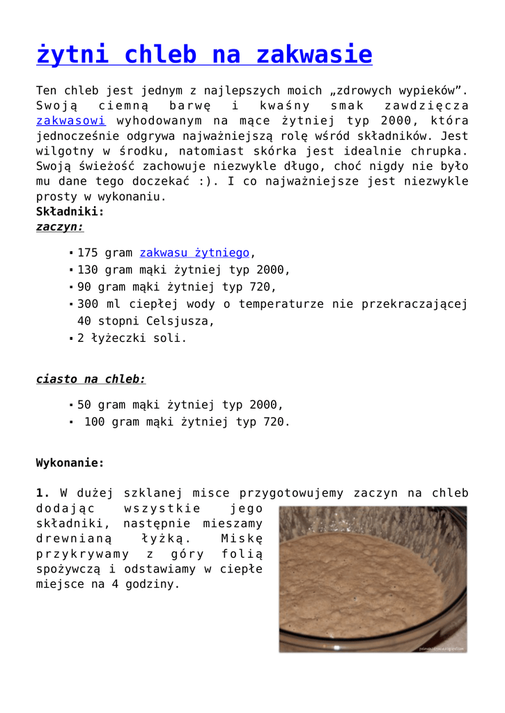 żytni chleb na zakwasie Ten chleb jest jednym z najlepszych moich „zdrowych wypieków”. Swoją ciemną barwę i kwaśny smak zawdzięcza zakwasowi wyhodowanym na mące żytniej typ 2000, która jednocześnie odgrywa najważniejszą rolę wśród składników. Jest wilgotny w środku, natomiast skórka jest idealnie chrupka. Swoją świeżość zachowuje niezwykle długo, choć nigdy nie było mu dane tego doczekać :). I co najważniejsze jest niezwykle prosty w wykonaniu. Składniki: zaczyn: 175 gram zakwasu żytniego, 130 gram mąki żytniej typ 2000, 90 gram mąki żytniej typ 720, 300 ml ciepłej wody o temperaturze nie przekraczającej 40 stopni Celsjusza, 2 łyżeczki soli. ciasto na chleb: 50 gram mąki żytniej typ 2000, 100 gram mąki żytniej typ 720. Wykonanie: 1. W dużej szklanej misce przygotowujemy zaczyn na chleb dodając wszystkie jego składniki, następnie mieszamy drewnianą łyżką. Miskę przykrywamy z góry folią spożywczą i odstawiamy w ciepłe miejsce na 4 godziny. 2. Do zaczynu dodajemy pozostałe mąki i mieszamy dokładnie. Przekładamy ciasto do formy „keksówki” (mniej więcej ciasto powinno sięgać co najmniej do połowy wysokości. Jeśli jest to blaszana forma musimy ją wysmarować tłuszczem (oliwą), a następnie oprószyć mąką żytnią, w przypadku formy silikonowej, pomijamy tą czynność. Formę przykrytą z góry ściereczką wkładamy do piekarnika na całą noc zostawiając zapalone światełko. 3. Rano, gdy ciasto wyrośnie rozpoczynamy pieczenie. Nie wyjmując formy z piekarnika rozgrzewamy go do 220 stopni Celsjusza i gdy piekarnik osiągnie tą temperaturę pieczemy chleb przez kolejne 40 minut. Chleb jest wypieczony, gdy wykałaczka włożona w środek ciasta chlebowego pozostanie sucha. 4. Upieczony chleb pozostawiamy w formie do wystygnięcia. * proces przygotowawczy ( dzień przed wypiekiem ) najlepiej rozpocząć w godzinach popołudniowych (15-16 -ta).