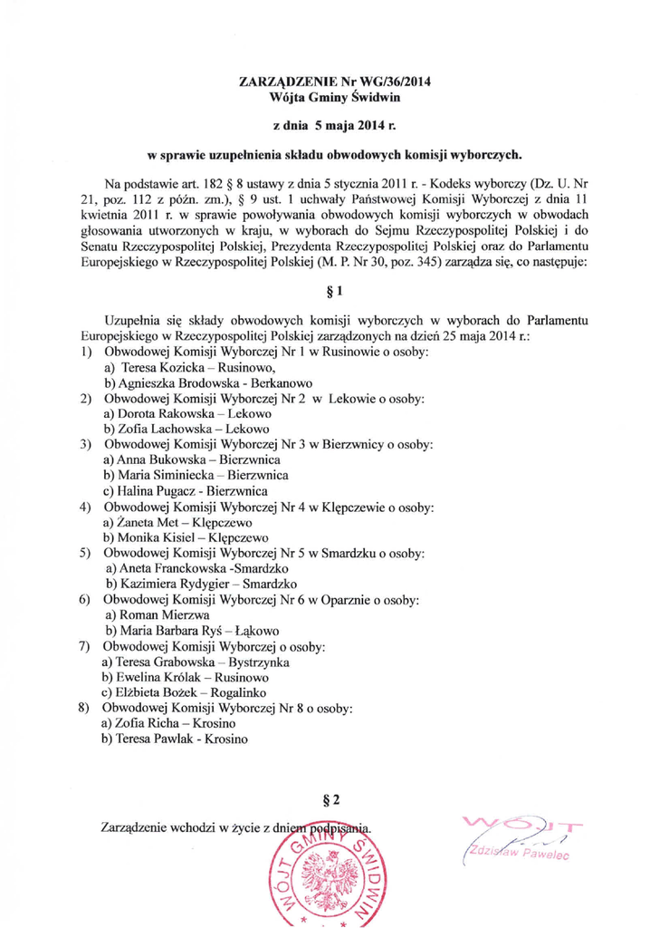 ZARZĄDZENIE Nr WG/36/2014 Wójta Gminy świdwin z dnia 5 maja