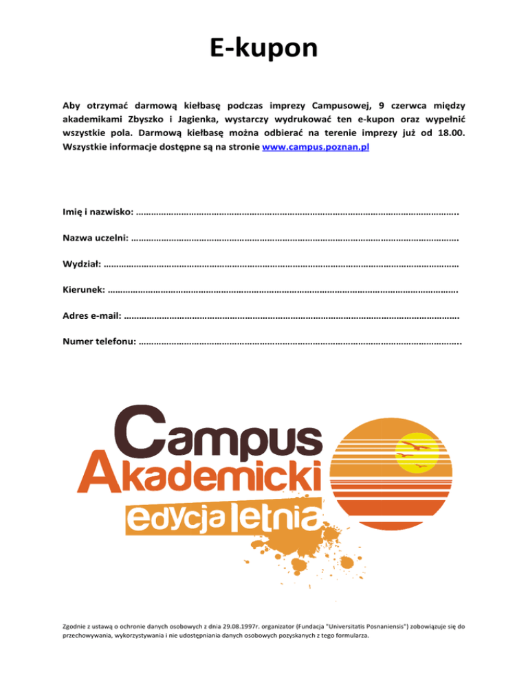 E-kupon Aby otrzymać darmową kiełbasę podczas imprezy Campusowej, 9 czerwca między akademikami Zbyszko i Jagienka, wystarczy wydrukować ten e-kupon e kupon oraz wypełnić wszystkie pola. Darmową kiełbasę można odbierać na terenie imprezy już od 18.00. Wszystkie informacje dostępne są na stronie www.campus.poznan.pl …………………………………………………………………… ………………………….. Imię i nazwisko: …………………… Nazwa uczelni: …………………… ……………………………………………………………………… …………………………. Wydział: ……………………………… …………………………………………………………………… …………………………… Kierunek: ………………………………………………………………………………………………… …………………………. Adres e-mail: ……………………… ……………………………………………………………………… …………………………. Numer telefonu: ………………… ……………………………………………………………………… ………………………….. Zgodnie z ustawą o ochronie danych osobowych z dnia 29.08.1997r. organizator (Fundacja "Universitatis Posnaniensis") zobowiązuje zobowiąz się do przechowywania, wykorzystywania i nie udostępniania danych osobowych pozyskanych z tego formularza.