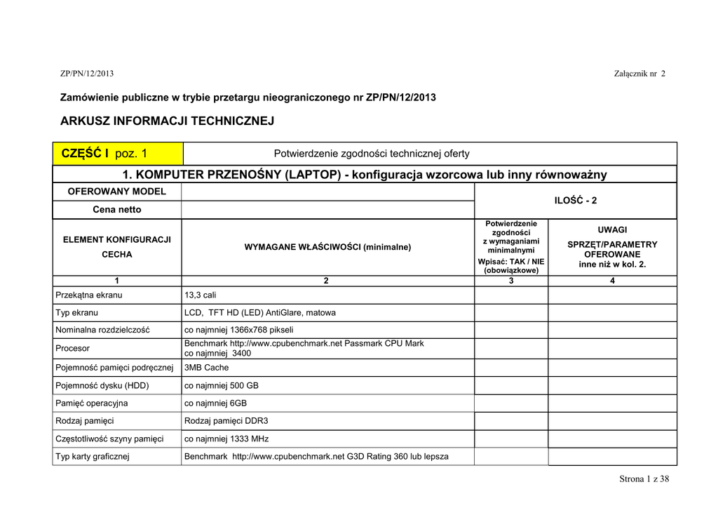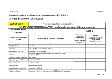 ZP/PN/12/2013 Załącznik nr 2 Zamówienie publiczne w trybie przetargu nieograniczonego nr ZP/PN/12/2013 ARKUSZ INFORMACJI TECHNICZNEJ CZĘŚĆ I poz. 1 Potwierdzenie zgodności technicznej oferty 1. KOMPUTER PRZENOŚNY (LAPTOP) - konfiguracja wzorcowa lub inny równoważny OFEROWANY MODEL ILOŚĆ - 2 Cena netto ELEMENT KONFIGURACJI CECHA WYMAGANE WŁAŚCIWOŚCI (minimalne) Potwierdzenie zgodności z wymaganiami minimalnymi Wpisać: TAK / NIE (obowiązkowe) 2 3 1 Przekątna ekranu 13,3 cali Typ ekranu LCD, TFT HD (LED) AntiGlare, matowa Nominalna rozdzielczość co najmniej 1366x768 pikseli Procesor Benchmark http://www.cpubenchmark.net Passmark CPU Mark co najmniej 3400 Pojemność pamięci podręcznej 3MB Cache Pojemność dysku (HDD) co najmniej 500 GB Pamięć operacyjna co najmniej 6GB Rodzaj pamięci Rodzaj pamięci DDR3 Częstotliwość szyny pamięci co najmniej 1333 MHz Typ karty graficznej Benchmark http://www.cpubenchmark.net G3D Rating 360 lub lepsza UWAGI SPRZĘT/PARAMETRY OFEROWANE inne niż w kol. 2. 4 Strona 1 z 38 ZP/PN/12/2013 Załącznik nr 2 Zainstalowana pamięć wideo co najmniej 512 MB Napęd optyczny wbudowany DVD-RW Rodzaj baterii litowo-jonowy 1x RJ-45 (LAN) 1x10/100/1000BaseT Gigabitethernet (RJ45) esata/USB Combo 2x USB 3.0 1 x wyjście HDMI 1 x wyjście D-Sub 15-stykowe Złącza komunikacyjne Bezprzewodowaj karta sieciowa typu IEEE 802.11a/b/g/n Bluetooth TAK Czytnik karty pamięci TAK xD SDHC SD Typ odczytywanych kart pamięci MS-Pro MMC Memory Stck mikrofon głośniki stereo Wyposażenie standardowe zintegrowana kamera 0,3 Mpix lub lepsza czytnik linii papilarnych Obudowa reprezentacyjna (srebrna, aluminiowa) Waga mniejsza niż 2,1 kg System operacyjny Zainstalowany system operacyjny Microsoft Windows 7 Professional 64-bit Oprogramowanie Microsoft Office 2013 Professional, wersja EDU Wyposażenie dodatkowe torba na laptopa Zasilacz w komplecie Gwarancja co najmniej 24 miesiące Strona 2 z 38 ZP/PN/12/2013 Załącznik nr 2 Potwierdzenie zgodności oferty przez wpisanie TAK/NIE w kolumnie "Potwierdzenie zgodności" jest obowiązkowe. Zamawiający dopuszcza składanie ofert równoważnych, jednakże podane przez Zamawiającego wymagania oraz parametry techniczne określające przedmiot zamówienia są warunkami minimalnymi, których spełnienia Zamawiający będzie oczekiwał. W przypadku złożenia oferty równoważnej na całość lub poszczególne pozycje, Wykonawca musi wyraźnie wskazać różnice, które powinny być jednoznacznie zaznaczone w treści specyfikacji technicznej. Zgodnie Art. 30, ust. 5 Ustawy, Wykonawca, który powołuje się na rozwiązania równoważne z opisanym przez Zamawiającego, jest obowiązany wykazać, że oferowany przez niego przedmiot zamówienia spełnia wymagania określone przez Zamawiającego. Strona 3 z 38 ZP/PN/12/2013 Załącznik nr 2 CZĘŚĆ I poz. 2 Potwierdzenie zgodności technicznej oferty 1. KOMPUTER PRZENOŚNY (LAPTOP) - konfiguracja wzorcowa lub inny równoważny OFEROWANY MODEL ILOŚĆ - 1 Cena netto ELEMENT KONFIGURACJI CECHA WYMAGANE WŁAŚCIWOŚCI (minimalne) Potwierdzenie zgodności z wymaganiami minimalnymi Wpisać: TAK / NIE (obowiązkowe) 2 3 1 Przekątna ekranu 15,6 cali, Rozdzielczość nominalna co najmniej 1366x768 Procesor czterordzeniowy - ocena co najmniej 7,600 wg PassMark CPU Benchmark z 06.02.2013 r. Cache minimum 6 MB pamięć RAM co najmniej 8 GB DDR3 karta graficzna ocena co najmniej 850 wg PassMark VideoCard Benchmark z 06.02.2013r. wyposażenie karty graficznej z pamięcią co najmniej 2 GB i technologią CUDA Dysk twardy (HDD) 1 TB Porty USB co najmniej . 4x USB 3.0 Komunikacja LAN 1 Gbps WiFi IEEE 802.11 b/g/n UWAGI SPRZĘT/PARAMETRY OFEROWANE inne niż w kol. 2. 4 Bluetooth Kamera wbudowana, o rozdzielczości co najmniej 1 Mpix Strona 4 z 38 ZP/PN/12/2013 Załącznik nr 2 Mikrofon TAK Klawiatura podświetlana Napęd optyczny nagrywarka DVD Czytnik kart SD Kolor obudowy czarny/szary/srebrny, System operacyjny MS Windows 8 Zasilacz w komplecie Gwarancja co najmniej 24 miesiące Potwierdzenie zgodności oferty przez wpisanie TAK/NIE w kolumnie "Potwierdzenie zgodności" jest obowiązkowe. Zamawiający dopuszcza składanie ofert równoważnych, jednakże podane przez Zamawiającego wymagania oraz parametry techniczne określające przedmiot zamówienia są warunkami minimalnymi, których spełnienia Zamawiający będzie oczekiwał. W przypadku złożenia oferty równoważnej na całość lub poszczególne pozycje, Wykonawca musi wyraźnie wskazać różnice, które powinny być jednoznacznie zaznaczone w treści specyfikacji technicznej. Zgodnie Art. 30, ust. 5 Ustawy, Wykonawca, który powołuje się na rozwiązania równoważne z opisanym przez Zamawiającego, jest obowiązany wykazać, że oferowany przez niego przedmiot zamówienia spełnia wymagania określone przez Zamawiającego. Strona 5 z 38 ZP/PN/12/2013 Załącznik nr 2 CZĘŚĆ I poz. 3 Potwierdzenie zgodności technicznej oferty 1. KOMPUTER PRZENOŚNY (LAPTOP) - konfiguracja wzorcowa lub inny równoważny OFEROWANY MODEL ILOŚĆ - 1 Cena netto ELEMENT KONFIGURACJI CECHA WYMAGANE WŁAŚCIWOŚCI (minimalne) Potwierdzenie zgodności z wymaganiami minimalnymi Wpisać: TAK / NIE (obowiązkowe) 2 3 1 Przekątna ekranu LCD 15,6 cali Rozdzielczość ekranu co najmniej 1366 x 768 pikseli Procesor http://www.cpubenchmark.net Passmark CPU Mark minimum 7525, Zainstalowana pamięć operacyjna co najmniej 8 GB Pojemność dysku (HDD) Min. 1000 GB Napęd optyczny DVD RW Złącze HDMI TAK Typ karty graficznej http://www.cpubenchmark.net GPU benchmark 826 lub lepsza Zainstalowany system operacyjny Windows 8 UWAGI SPRZĘT/PARAMETRY OFEROWANE inne niż w kol. 2. 4 Strona 6 z 38 ZP/PN/12/2013 Oprogramowanie Wyposażenie dodatkowe Załącznik nr 2 Microsoft Office 2013 Professional, wersja EDU zgodnie z MS Open Licence nr identyfikacyjny Licencjobiorcy 69665569ZZE1402 • • • mysz klawiatura torba na laptopa Zasilacz w komplecie Gwarancja co