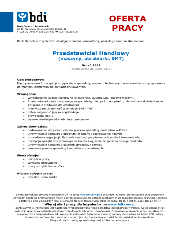 Bank Danych o Inżynierach 02-304 Warszawa, Al. Jerozolimskie 133 lok. 42 T 022 572 78 00 F 022 572 78 03 W www.bdi.com.pl OFERTA PRACY Bank Danych o Inżynierach, działając w imieniu pracodawcy, poszukuje osób na stanowisko: Przedstawiciel Handlowy (maszyny, obrabiarki, SMT) Nr ref. 8561 (oferta ważna do 06.08.2016) Opis pracodawcy: Międzynarodowa firma specjalizująca się w sprzedaży, wsparciu technicznym oraz serwisie oprzyrządowania do montażu elementów na płytkach drukowanych. Wymagania: • wykształcenie wyższe techniczne (elektronika, automatyka, budowa maszyn) • 2 lata doświadczenia związanego ze sprzedażą maszyn lub urządzeń (mile widziane doświadczenie związane z produkcją dla elektroniki) • mile widziana znajomość technologii SMT i THT • dobra znajomość języka angielskiego • prawo jazdy kat. B • wysoko rozwinięte zdolności interpersonalne Zakres obowiązków: • nadzorowanie wszystkich etapów procesu sprzedaży produktów w Polsce • utrzymywanie kontaktu z obecnymi klientami i pozyskiwanie nowych • prowadzenie negocjacji, śledzenie realizacji podpisywanych umów i tworzenie ofert • instalacja sprzętu dostarczonego do klienta i wyjaśnienie sposobu obsługi produktu • utrzymywanie kontaktu z działami sprzedaży i serwisu • tworzenie planów sprzedaży i raportów sprzedażowych Firma • • • oferuje: narzędzia pracy szkolenia produktowe pracę w trybie home office Miejsce podjęcia pracy: • dowolne - cała Polska Zainteresowanych prosimy o przesłanie CV na adres [email protected] z podaniem numeru referencyjnego oraz dopiskiem: „Wyrażam zgodę na przetwarzanie moich danych osobowych dla potrzeb niezbędnych do realizacji procesu rekrutacji (zgodnie z Ustawą z dnia 29.08.1997 roku o Ochronie Danych Osobowych; tekst jednolity: Dz.U. z 2014r., poz.1182 ze zm.).” Więcej ofert pracy dla inżynierów na www.bdi.com.pl Bank Danych o Inżynierach jest najstarszą wyspecjalizowana firmą doradztwa personalnego w Polsce. Już od ponad 24 lat aktywnie wspieramy polskich inżynierów w budowaniu ich karier zawodowych. Pomagamy w szukaniu pracy, weryfikujemy pracodawców i podpowiadamy jak skutecznie aplikować. Dotychczas z naszej pomocy skorzystało już blisko 200 tysięcy inżynierów, zarówno tych zaraz po studiach jak i tych posiadających wieloletnie doświadczenie zawodowe. Dołącz do nich i zyskaj sprawdzonego sojusznika na rynku pracy.
