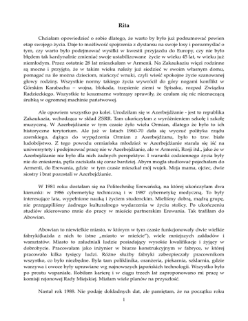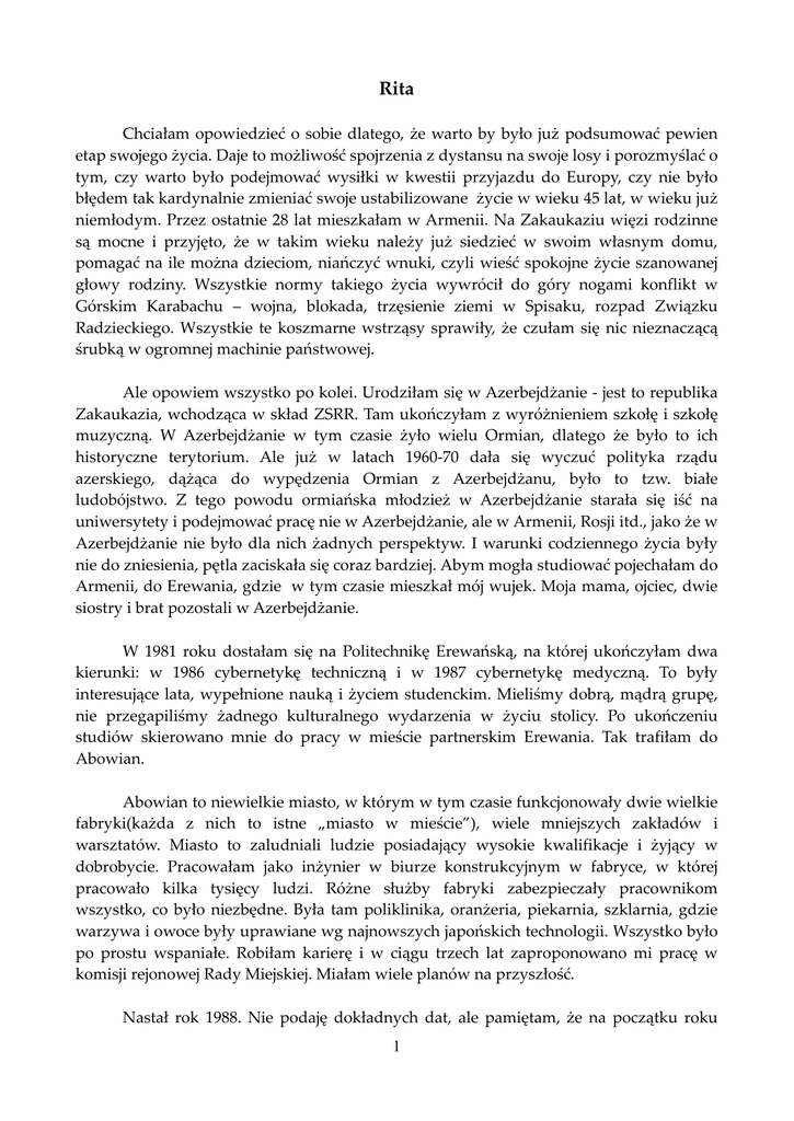 Rita Chciałam opowiedzieć o sobie dlatego, że warto by było już podsumować pewien etap swojego życia. Daje to możliwość spojrzenia z dystansu na swoje losy i porozmyślać o tym, czy warto było podejmować wysiłki w kwestii przyjazdu do Europy, czy nie było błędem tak kardynalnie zmieniać swoje ustabilizowane życie w wieku 45 lat, w wieku już niemłodym. Przez ostatnie 28 lat mieszkałam w Armenii. Na Zakaukaziu więzi rodzinne są mocne i przyjęto, że w takim wieku należy już siedzieć w swoim własnym domu, pomagać na ile można dzieciom, niańczyć wnuki, czyli wieść spokojne życie szanowanej głowy rodziny. Wszystkie normy takiego życia wywrócił do góry nogami konflikt w Górskim Karabachu – wojna, blokada, trzęsienie ziemi w Spisaku, rozpad Związku Radzieckiego. Wszystkie te koszmarne wstrząsy sprawiły, że czułam się nic nieznaczącą śrubką w ogromnej machinie państwowej. Ale opowiem wszystko po kolei. Urodziłam się w Azerbejdżanie - jest to republika Zakaukazia, wchodząca w skład ZSRR. Tam ukończyłam z wyróżnieniem szkołę i szkołę muzyczną. W Azerbejdżanie w tym czasie żyło wielu Ormian, dlatego że było to ich historyczne terytorium. Ale już w latach 1960-70 dała się wyczuć polityka rządu azerskiego, dążąca do wypędzenia Ormian z Azerbejdżanu, było to tzw. białe ludobójstwo. Z tego powodu ormiańska młodzież w Azerbejdżanie starała się iść na uniwersytety i podejmować pracę nie w Azerbejdżanie, ale w Armenii, Rosji itd., jako że w Azerbejdżanie nie było dla nich żadnych perspektyw. I warunki codziennego życia były nie do zniesienia, pętla zaciskała się coraz bardziej. Abym mogła studiować pojechałam do Armenii, do Erewania, gdzie w tym czasie mieszkał mój wujek. Moja mama, ojciec, dwie siostry i brat pozostali w Azerbejdżanie. W 1981 roku dostałam się na Politechnikę Erewańską, na której ukończyłam dwa kierunki: w 1986 cybernetykę techniczną i w 1987 cybernetykę medyczną. To były interesujące lata, wypełnione nauką i życiem studenckim. Mieliśmy dobrą, mądrą grupę, nie przegapiliśmy żadnego kulturalnego wydarzenia w życiu stolicy. Po ukończeniu studiów skierowano mnie do pracy w mieście partnerskim Erewania. Tak trafiłam do Abowian. Abowian to niewielkie miasto, w którym w tym czasie funkcjonowały dwie wielkie fabryki(każda z nich to istne „miasto w mieście”), wiele mniejszych zakładów i warsztatów. Miasto to zaludniali ludzie posiadający wysokie kwalifikacje i żyjący w dobrobycie. Pracowałam jako inżynier w biurze konstrukcyjnym w fabryce, w której pracowało kilka tysięcy ludzi. Różne służby fabryki zabezpieczały pracownikom wszystko, co było niezbędne. Była tam poliklinika, oranżeria, piekarnia, szklarnia, gdzie warzywa i owoce były uprawiane wg najnowszych japońskich technologii. Wszystko było po prostu wspaniałe. Robiłam karierę i w ciągu trzech lat zaproponowano mi pracę w komisji rejonowej Rady Miejskiej. Miałam wiele planów na przyszłość. Nastał rok 1988. Nie podaję dokładnych dat, ale pamiętam, że na początku roku 1 zaczęły się zamieszki. Były to masowe wystąpienia ludzi w Armenii o niepodległość Karabachu(jest to historyczny ormiański region, który od lat 20-tych XX wieku wg decyzji bolszewików i Stalina pozostawał w granicach Azerbejdżanu), gdzie żyli Ormianie, ale w ciągu ostatnich lat intensywnie wygryzali ich Azerowie, azerski rząd. Był to(i do tej pory jest) nie tylko konflikt terytorialny. To wojna dwóch religii – muzułmańskich Azerów przeciwko chrześcijańskim Ormianom. Kiedy w Armenii miały miejsce zamieszki, prości ludzie nie wyobrażali sobie, do jak tragicznych skutków to wszystko doprowadzi. W odpowiedzi Azerowie zaczęli rzeź Ormian żyjących w Azerbejdżanie. To bezpośrednio dotknęło naszą rodzinę, jako że wszyscy oprócz mnie mieszkali wtedy w Azerbejdżanie. Tato był w połowie Polakiem, jego mama, nasza babcia, była Polką(niestety babcia już nie żyje), która uciekła do Azerbejdżanu w 1937 roku, ratując się przed stalinowskimi represjami. Wszyscy wiedzieli o pochodzeniu taty, ale to nie uratowało by go i jego rodziny od śmierci z rąk uzbrojonych po zęby azerskich fanatyków. Sowieccy żołnierze stacjonowali w Kirowabadzie i nic nie robili, podporządkowując się rozkazom z góry, nie mieszali się do tworzącego się wokół chaosu, rzezi Ormian, potem także innych chrześcijan, pożarów, zajmowania domów. Chrześcijanie z rodzinami przesiedlili się w ciągu kilku dni do niewielkiego ormiańskiego kwartału w Kirowabadzie z centrum znajdującym się w cerkwi ormiańskiej. Cerkiew była twierdzą, duchowym centrum. Stała się także szpitalem. Tu przywozili rannych cywilów(później także i żołnierzy), którzy ucierpieli na skutek rzezi, a także zgwałcone kobiety i dzieci. Pomocy udzielali im lekarze ochotnicy, w tym sami poszkodowani i kobiety. A mężczyźni bronili tego chrześcijańskiego zakątka przy użyciu łopat, pałek i broni myśliwskiej w ręku. Wtedy wszyscy ludzie(niektórzy po raz pierwszy) poczuli duchową więź z Bogiem. Pozostawała tylko wiara w Boga i nadzieja co do Niego, ponieważ w nikim innym nadziei już nie było. A tymczasem zbrodnie azerskich bandytów, odurzonych narkotykami, były popełniane także w innych miastach Azerbejdżanu, gdzie mieszkała ormiańska ludność m. in. w Baku, Sumgait, wioskach leżących nieopodal. Nocami zazwyczaj atakowały Ormian zwierzęce tłumy zwyrodnialców, naśmiewali się, gwałcili, na oczach dzieci mordowali ich rodziców, a na oczach rodziców gwałcili i zabijali dzieci. Za wszystkie te zbrodnie odpowiedzialne były miejscowe władze, a moskiewskie przymykały oczy na wszystko. Azerowie powtórzyli historię swoich praojców Turków, którzy dokonali ludobójstwa w 1915 roku, kiedy to zginęło ponad 1,5 mln Ormian. Oczywiście trudno uwierzyć, że coś 