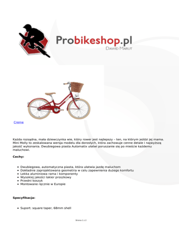 Creme Każda rozsądna, mała dziewczynka wie, który rower jest najlepszy – ten, na którym jeździ jej mama. Mini Molly to zeskalowana wersja modelu dla dorosłych, która zachowuje cenne detale i najwyższą jakość wykonania. Dwubiegowa piasta Automatix ułatwi poruszanie się po mieście każdemu maluchowi. Cechy: Dwubiegowa, automatyczna piasta, która ułatwia jazdę maluchom Dokładnie zaprojektowana geometria w celu zapewnienia dużego komfortu Lekka aluminiowa rama i komponenty Wysokiej jakości lakier proszkowy Przedni koszyk Montowane ręcznie w Europie Specyfikacja: Suport: square taper, 68mm shell Strona 1 z 2 Hamulec przedni: Promax caliper Hamulec tylny: coaster brake / hub integrated Bagażnik / Koszyk: front wicker basket Kaseta: --Łańcuch: KMC 1/2"x3/32" Korba: steel, 127mm, 36t Błotniki: steel painted Widelec: Hi-Ten steel fork, 1" Rama: Aluminium Gripy: Creme Spring Kierownica: steel, chrome plated, width: 425mm, barbore: 25.4mm Stery: VP, threaded, 1” Piasta przednia: Joytech loose ball, 28H, cup nuts Piasta tylna: SRAM Automatix, 28h, 2-speed, sprocket: 23t Obręcze: aluminium Siodełko: Creme Sztyca: steel, chrome plated 25.4mm Manetki: --Szprychy: stainless steel Nóżka: aluminium Mostek: aluminium, polished Opony: Kenda Kommuter 20"x1,75" Dodatki: stylowy dzwonek Strona 2 z 2