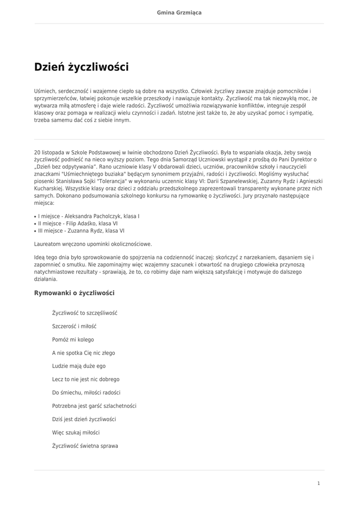 Gmina Grzmiąca Dzień życzliwości Uśmiech, serdeczność i wzajemne ciepło są dobre na wszystko. Człowiek życzliwy zawsze znajduje pomocników i sprzymierzeńców, łatwiej pokonuje wszelkie przeszkody i nawiązuje kontakty. Życzliwość ma tak niezwykłą moc, że wytwarza miłą atmosferę i daje wiele radości. Życzliwość umożliwia rozwiązywanie konfliktów, integruje zespół klasowy oraz pomaga w realizacji wielu czynności i zadań. Istotne jest także to, że aby uzyskać pomoc i sympatię, trzeba samemu dać coś z siebie innym. 20 listopada w Szkole Podstawowej w Iwinie obchodzono Dzień Życzliwości. Była to wspaniała okazja, żeby swoją życzliwość podnieść na nieco wyższy poziom. Tego dnia Samorząd Uczniowski wystąpił z prośbą do Pani Dyrektor o „Dzień bez odpytywania”. Rano uczniowie klasy V obdarowali dzieci, uczniów, pracowników szkoły i nauczycieli znaczkami "Uśmiechniętego buziaka" będącym synonimem przyjaźni, radości i życzliwości. Mogliśmy wysłuchać piosenki Stanisława Sojki "Tolerancja" w wykonaniu uczennic klasy VI: Darii Szpanelewskiej, Zuzanny Rydz i Agnieszki Kucharskiej. Wszystkie klasy oraz dzieci z oddziału przedszkolnego zaprezentowali transparenty wykonane przez nich samych. Dokonano podsumowania szkolnego konkursu na rymowankę o życzliwości. Jury przyznało następujące miejsca: ● ● ● I miejsce - Aleksandra Pacholczyk, klasa I II miejsce - Filip Adaśko, klasa VI III miejsce - Zuzanna Rydz, klasa VI Laureatom wręczono upominki okolicznościowe. Ideą tego dnia było sprowokowanie do spojrzenia na codzienność inaczej: skończyć z narzekaniem, dąsaniem się i zapomnieć o smutku. Nie zapominajmy więc wzajemny szacunek i otwartość na drugiego człowieka przynoszą natychmiastowe rezultaty - sprawiają, że to, co robimy daje nam większą satysfakcję i motywuje do dalszego działania. Rymowanki o życzliwości Życzliwość to szczęśliwość Szczerość i miłość Pomóż mi kolego A nie spotka Cię nic złego Ludzie mają duże ego Lecz to nie jest nic dobrego Do śmiechu, miłości radości Potrzebna jest garść szlachetności Dziś jest dzień życzliwości Więc szukaj miłości Życzliwość świetna sprawa 1 Gmina Grzmiąca I dobra też zabawa Lepszy świat się przed tobą otwiera Więc nie potrzebna jest dziś afera Postaraj się kolego To nie będzie dziś nic złego Bo gdy nie będziesz życzliwa Niech głowa ci się kiwa. Rydz Zuzanna, klasa VI (III miejsce w szkolnym konkursie na rymowankę o życzliwości) Życzliwość świetna sprawa Uprzejmość i zabawa 21 listopada – szlachetnością wykaże się Ada, która jest dobrocią omotana Nie zapomnij kolego, że uczyłeś się dużo dobrego. Kiedy szukasz życzliwości przyjdź do nas mamy dużo zawziętości w szczerości, życzliwość to lepszy świat uprzejmości jestem chwat. W szczerości żyje cała i jestem szanowana. Lubisz być po główce głaskany i przyjaźnią obdarowany? Patrz życzliwie na ludzi to nigdy się nie znudzi. Kucharska Agnieszka, klasa VI Dla ludzi życzliwości 2 Gmina Grzmiąca Człowieku podaruj im kawałek swej miłości. Na dodatek rozdaj za darmochę trochę szlachetności. Poczuj się dzięki temu w pełni radości. Codziennie poszukiwana, darem dobroci obdarowana, dzięki niej tworzę lepszy świat. Jak ją komuś dam, to dostanę piękny kolorowy kwiat. Woźniak Konrad, klasa VI Życzliwość to piękny czerwony kwiat, który jest jak szlachetny brat. Tolerancja i dobroć za pan brat i obierzy cały świat. Przyjaciel to jest fajna sprawa i bijemy dla niej brawa. Życzliwość jest jak lawa szczęścia i codziennie czekamy jej nadejścia. Donat Rafał, klasa VI Życzliwość ważna sprawa, lepsza jest niż kawa, A na co dzień spotykana, miłością obdarowana i przez wielu ludzi szukana. Szukamy jej, na co dzień w naszych sercach ogień płynie przez 100 lat, by poznać lepszy świat. Szukam dobrej wiary by nie zjadły mnie komary. 3 Gmina Grzmiąca Widzę świat przez różowe okulary. Szpanelewska Daria, klasa VI "Życzliwość" Pomagam mamie, babci, dziadkowi. Nakarmię pieska, dam mleczka kotkowi. Z każdym witam się uśmiechnięta. Lubią mnie chłopcy i dziewczęta. I naprawdę jestem szczęśliwa, gdy dla każdego jestem życzliwa. Pacholczyk Agnieszka, klasa I (I miejsce w szkolnym konkursie na rymowankę o życzliwości) Bądź życzliwa ważna sprawa, bądź też grzeczny to podstawa. To kolegów będziesz miał gromadkę. Jak przyjaciół masz gromadkę To i bawić jest się wspaniale. Gdy kogoś przewrócisz, albo wyzwiesz to powiedz przepraszam. Jak od kogoś prezent otrzymujesz To dziękuje obowiązuje. Jak komuś coś dasz To powiedz proszę Te magiczne słowa to już życzliwość Nasza cała trzecia klasa pożycza sobie nawzajem, Jesteśmy dla siebie życzliwi i lubimy się nawzajem. Gąsior Rokasana, klasa III Życzliwość bardzo ważna sprawa, Miła, serdeczna i ukochana. 4 Gmina Grzmiąca Gdy ktoś nie ma w sobie życzliwości To nie może liczyć na garść uprzejmości. Bądź zawsze szlachetny kolego Bo szlachetność to nic złego. Adaśko Filip, klasa VI (II miejsce w szkolnym konkursie na rymowankę o życzliwości) Człowiek jest życzliwy, dla innych bardzo miły. Szczęście ważna sprawa, idź do dziewczyny i daj jej kwiatka. Jest to moja słodka herbatka. Szukając dobroci zwróć się do mojej cioci. Dużo jest w niej szlachetności i uprzejmości. Ona zawsze dobrze doradzi i nikomu to nie wadzi, że pomaga nawet Madzi. Adaśko Oliwer, klasa VI 5