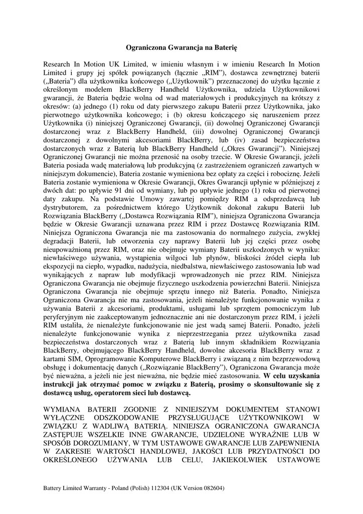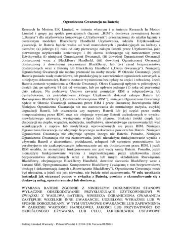Ograniczona Gwarancja na Baterię Research In Motion UK Limited, w imieniu własnym i w imieniu Research In Motion Limited i grupy jej spółek powiązanych (łącznie „RIM”), dostawca zewnętrznej baterii („Bateria”) dla uŜytkownika końcowego („UŜytkownik”) przeznaczonej do uŜytku łącznie z określonym modelem BlackBerry Handheld UŜytkownika, udziela UŜytkownikowi gwarancji, Ŝe Bateria będzie wolna od wad materiałowych i produkcyjnych na krótszy z okresów: (a) jednego (1) roku od daty pierwszego zakupu Baterii przez UŜytkownika, jako pierwotnego uŜytkownika końcowego; i (b) okresu kończącego się naruszeniem przez UŜytkownika (i) niniejszej Ograniczonej Gwarancji, (ii) dowolnej Ograniczonej Gwarancji dostarczonej wraz z BlackBerry Handheld, (iii) dowolnej Ograniczonej Gwarancji dostarczonej z dowolnymi akcesoriami BlackBerry, lub (iv) zasad bezpieczeństwa dostarczonych wraz z Baterią lub BlackBerry Handheld („Okres Gwarancji”). Niniejszej Ograniczonej Gwarancji nie moŜna przenosić na osoby trzecie. W Okresie Gwarancji, jeŜeli Bateria posiada wadę materiałową lub produkcyjną (z zastrzeŜeniem ograniczeń zawartych w niniejszym dokumencie), Bateria zostanie wymieniona bez opłaty za części i robociznę. JeŜeli Bateria zostanie wymieniona w Okresie Gwarancji, Okres Gwarancji upłynie w późniejszej z dwóch dat: po upływie 91 dni od wymiany, lub po upływie jednego (1) roku od pierwotnej daty zakupu. Na podstawie Umowy zawartej pomiędzy RIM a odsprzedawcą lub dystrybutorem, za pośrednictwem którego UŜytkownik dokonał zakupu Baterii lub Rozwiązania BlackBerry („Dostawca Rozwiązania RIM”), niniejsza Ograniczona Gwarancja będzie w Okresie Gwarancji uznawana przez RIM i przez Dostawcę Rozwiązania RIM. Niniejsza Ograniczona Gwarancja nie ma zastosowania do normalnego zuŜycia, zwykłej degradacji Baterii, lub otworzenia czy naprawy Baterii lub jej części przez osobę nieupowaŜnioną przez RIM, oraz nie obejmuje wymiany Baterii uszkodzonych w wyniku: niewłaściwego uŜywania, wystąpienia wilgoci lub płynów, bliskości źródeł ciepła lub ekspozycji na ciepło, wypadku, naduŜycia, niedbalstwa, niewłaściwego zastosowania lub wad wynikających z napraw lub modyfikacji wprowadzonych nie przez RIM. Niniejsza Ograniczona Gwarancja nie obejmuje fizycznego uszkodzenia powierzchni Baterii. Niniejsza Ograniczona Gwarancja nie obejmuje sprzętu innego niŜ Bateria. Ponadto, Niniejsza Ograniczona Gwarancja nie ma zastosowania, jeŜeli nienaleŜyte funkcjonowanie wynika z uŜywania Baterii z akcesoriami, produktami, usługami lub sprzętem pomocniczym lub peryferyjnym nie zaakceptowanym jednoznacznie ani nie dostarczonym przez RIM, i jeŜeli RIM ustaliła, Ŝe nienaleŜyte funkcjonowanie nie jest wadą samej Baterii. Ponadto, jeŜeli nienaleŜyte funkcjonowanie wynika z nieprzestrzegania przez uŜytkownika zasad bezpieczeństwa dostarczonych wraz z Baterią lub innym składnikiem Rozwiązania BlackBerry, obejmującego BlackBerry Handheld, dowolne akcesoria BlackBerry wraz z kartami SIM, Oprogramowanie Komputerowe BlackBerry i związaną z nim bezprzewodową obsługę i dokumentację danych („Rozwiązanie BlackBerry”), Ograniczona Gwarancja moŜe być niewaŜna, a jeŜeli nie jest niewaŜna, nie będzie mieć zastosowania. W celu uzyskania instrukcji jak otrzymać pomoc w związku z Baterią, prosimy o skonsultowanie się z dostawcą usług, operatorem sieci lub dostawcą. WYMIANA BATERII ZGODNIE Z NINIEJSZYM DOKUMENTEM STANOWI WYŁĄCZNE ODSZKODOWANIE PRZYSŁUGUJĄCE UśYTKOWNIKOWI W ZWIĄZKU Z WADLIWĄ BATERIĄ. NINIEJSZA OGRANICZONA GWARANCJA ZASTĘPUJE WSZELKIE INNE GWARANCJE, UDZIELONE WYRAŹNIE LUB W SPOSÓB DOROZUMIANY, W TYM USTAWOWE GWARANCJE LUB ZAPEWNIENIA W ZAKRESIE WARTOŚCI HANDLOWEJ, JAKOŚCI LUB PRZYDATNOŚCI DO OKREŚLONEGO UśYWANIA LUB CELU, JAKIEKOLWIEK USTAWOWE Battery Limited Warranty - Poland (Polish) 112304 (UK Version 082604) GWARANCJE LUB ZAPEWNIENIA NIENARUSZANIA PRAW OSÓB TRZECICH. RIM ANI śADEN DOSTAWCA ROZWIĄZAŃ RIM NIE BĘDZIE W śADEN SPOSÓB ODPOWIEDZIALNY WOBEC UśYTKOWNIKA A UśYTKOWNIK NINIEJSZYM ZRZEKA SIĘ WSZELKICH POŚREDNICH, GOSPODARCZYCH, SPECJALNYCH, HANDLOWYCH, PRZYPADKOWYCH, NASTĘPCZYCH (W TYM, Z TYTUŁU UTRACONYCH KORZYŚCI, UTRACONYCH PRZYCHODÓW Z DZIAŁALNOŚCI, UTRATY DANYCH, SZKÓD SPOWODOWANYCH OPÓŹNIENIEM W REALIZACJI LUB NIEZREALIZOWANIEM SPODZIEWANYCH OSZCZĘDNOŚCI) WYNIKAJĄCYCH LUB POWSTAŁYCH W ZWIĄZKU Z UśYWANIEM LUB DZIAŁANIEM BATERII, NAWET JEśELI RIM LUB DOSTAWCA ROZWIĄZAŃ RIM SĄ ŚWIADOMI MOśLIWOŚCI WYSTĄPIENIA TAKICH SZKÓD. NINIEJSZE WYŁĄCZENIE ODPOWIEDZIALNOŚCI MA BYĆ STOSOWANE I JEST STOSOWANIE BEZ WZGLĘDU NA TO, CZY Z TYTUŁU TYCH SZKÓD ZOSTAŁ WNIESIONY POZEW, SZKODY SĄ W TRAKCIE DOCHODZENIA, TOCZY SIĘ POSTĘPOWANIE SĄDOWE, Z TYTUŁU ODPOWIEDZIALNOŚCI DELIKTOWEJ (W TYM NIEDBALSTWA) LUB KONTRAKTOWEJ, Z TYTUŁU GWARANCJI LUB NA PODSTAWIE INNYCH PRZEPISÓW PRAWA LUB ROSZCZENIA. W śADNYM PRZYPADKU ODPOWIEDZIALNOŚĆ RIM WOBEC UśYTKOWNIKA LUB INNEJ OSOBY TRZECIEJ WYSTĘPUJĄCEJ Z ROSZCZENIEM ZA POŚREDNICTWEM UśYTKOWNIKA LUB W JEGO IMIENIU NIE PRZEKROCZY CENY ZAKUPU BATERII ZAKUPIONYCH PRZEZ UśYTKOWNIKA LUB KOSZTU NAPRAWY LUB WYMIANY BATERII, KTÓRAKOLWIEK Z TYCH KWOT JEST WIĘKSZA. NINIEJSZA OGRANICZONA GWARANCJA PRZYZNAJE UśYTKOWNIKOWI SPECJALNE PRAWA, PRZY CZYM UśYTKOWNIKOWI MOGĄ PRZYSŁUGIWAĆ RÓWNIEś INNE PRAWA, KTÓRE MOGĄ SIĘ RÓśNIĆ W ZALEśNOŚCI OD JURYSDYKCJI. W NIEKTÓRYCH KRAJACH MOśE NIE BYĆ DOZWOLONE WYŁĄCZENIE LUB OGRANICZENIE SZKÓD POŚREDNICH LUB NASTĘPCZYCH, LUB OGRANICZENIE CZASU TRWANIA USTAWOWEJ GWARANCJI LUB ZAPEWNIEŃ, LUB TEś USTANAWIANIE POSTANOWIEŃ DOPUSZCZAJĄCYCH UNIEWAśNIENIE GWARANCJI. Z TEJ PRZYCZYNY, NIEKTÓRE Z WYśEJ WYMIENIONYCH OGRANICZEŃ LUB WYŁĄCZEŃ MOGĄ NIE MIEĆ ZASTOSOWANIA DO UśYTKOWNIKA. Zrzeczenie się przez RIM prawa do dochodzenia roszczenia nie oznacza stałego zrz