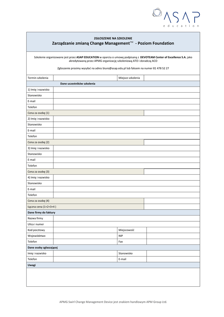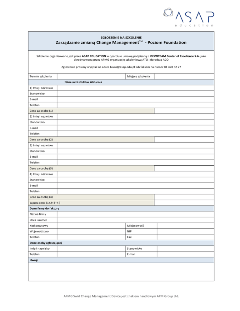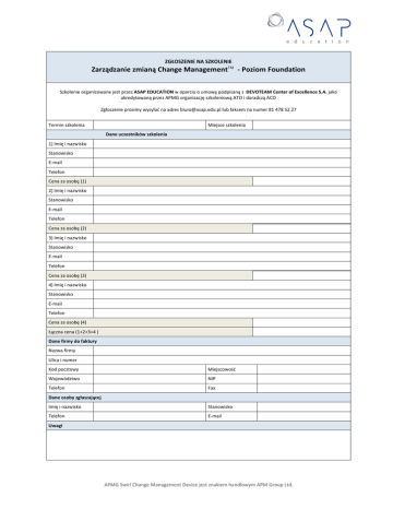 ZGŁOSZENIE NA SZKOLENIE Zarządzanie zmianą Change ManagementTM - Poziom Foundation Szkolenie organizowane jest przez ASAP EDUCATION w oparciu o umowę podpisaną z DEVOTEAM Center of Excellence S.A. jako akredytowaną przez APMG organizację szkoleniową ATO i doradczą ACO Zgłoszenie prosimy wysyłać na adres [email protected] lub faksem na numer 81 478 52 27 Termin szkolenia Miejsce szkolenia Dane uczestników szkolenia 1) Imię i nazwisko Stanowisko E-mail Telefon Cena za osobę (1) 2) Imię i nazwisko Stanowisko E-mail Telefon Cena za osobę (2) 3) Imię i nazwisko Stanowisko E-mail Telefon Cena za osobę (3) 4) Imię i nazwisko Stanowisko E-mail Telefon Cena za osobę (4) Łączna cena (1+2+3+4 ) Dane firmy do faktury Nazwa firmy Ulica i numer Kod pocztowy Miejscowość Województwo NIP Telefon Fax Dane osoby zgłaszającej Imię i nazwisko Stanowisko Telefon E-mail Uwagi APMG Swirl Change Management Device jest znakiem handlowym APM Group Ltd. Warunki uczestnictwa Warunkiem uczestnictwa w szkoleniu jest przesłanie wypełnionego zgłoszenia oraz dokonanie płatności przed rozpoczęciem zajęć na konto: DEVOTEAM Center of Excellence S.A. W przypadku rezygnacji ze szkolenia w terminie krótszym niż 21 dni od daty terminu szkolenia, DEVOTEAM Center of Excellence S.A. wystawi fakturę w wysokości 100% ceny szkolenia z jednoczesnym przesunięciem szkolenia na inny termin. Odwołanie zgłoszenia wymaga formy pisemnej. Istnieje możliwość zgłoszenia zastępstwa uczestnika szkolenia. W przypadku, gdy trener z przyczyn losowych nie będzie mógł przeprowadzić zajęć w podanym wcześniej terminie, organizator zastrzega sobie prawo zmiany terminu zajęć bądź zmiany osoby prowadzącej. Uczestnicy zajęć niezwłocznie zostaną poinformowani o tym fakcie. Z przyczyn niezależnych od organizatora zastrzega on sobie prawo do odwołania szkolenia najpóźniej na 5 dni przed terminem szkolenia. Upoważniamy firmę DEVOTEAM Center of Excellence S.A. do wystawienia faktury VAT bez naszego podpisu. Oświadczamy, że zgodnie z rozporządzeniem Ministra Finansów z dn. 15.12.97 w sprawie podatku od towarów i usług (Dz.U. Nr 156, poz. 1024 z późniejszymi zmianami), jesteśmy uprawnieni do otrzymywania faktur VAT. Wyrażam zgodę na przetwarzanie moich danych osobowych do celów rekrutacyjnych przez ASAP EDUCATION oraz CRM S.A., zgodnie z ustawą z dn. 29.08.1997 r. o Ochronie Danych Osobowych (Dz. U. Nr 133 poz. 883). Wiem, że mam pełne prawo do wglądu i zmiany swoich danych, jak też ich usunięcia z bazy. Wyrażam zgodę na otrzymywanie informacji handlowych od ASAP EDUCATION na podany adres e-mail (zgodnie z ustawą z dn. 29.08.1997 r. o ochronie danych osobowych - tekst jednolity Dz. U. z 2002r. Nr 101, poz. 926 z późn. zm.). W każdym momencie przysługuje mi prawo do odwołania powyższej zgody. Data: ............................................ Podpis i pieczątka firmy:.......................................................................................... Informacje dodatkowe W celu uzyskania dodatkowych informacji należy skontaktować się z Panią Agatą Pytką nr tel. 81 478 52 26 lub e-mailem [email protected] lub Panią Agnieszką Flynn pod nr tel. (22) 811 44 40 lub e-mailem [email protected] APMG Swirl Change Management Device jest znakiem handlowym APM Group Ltd.