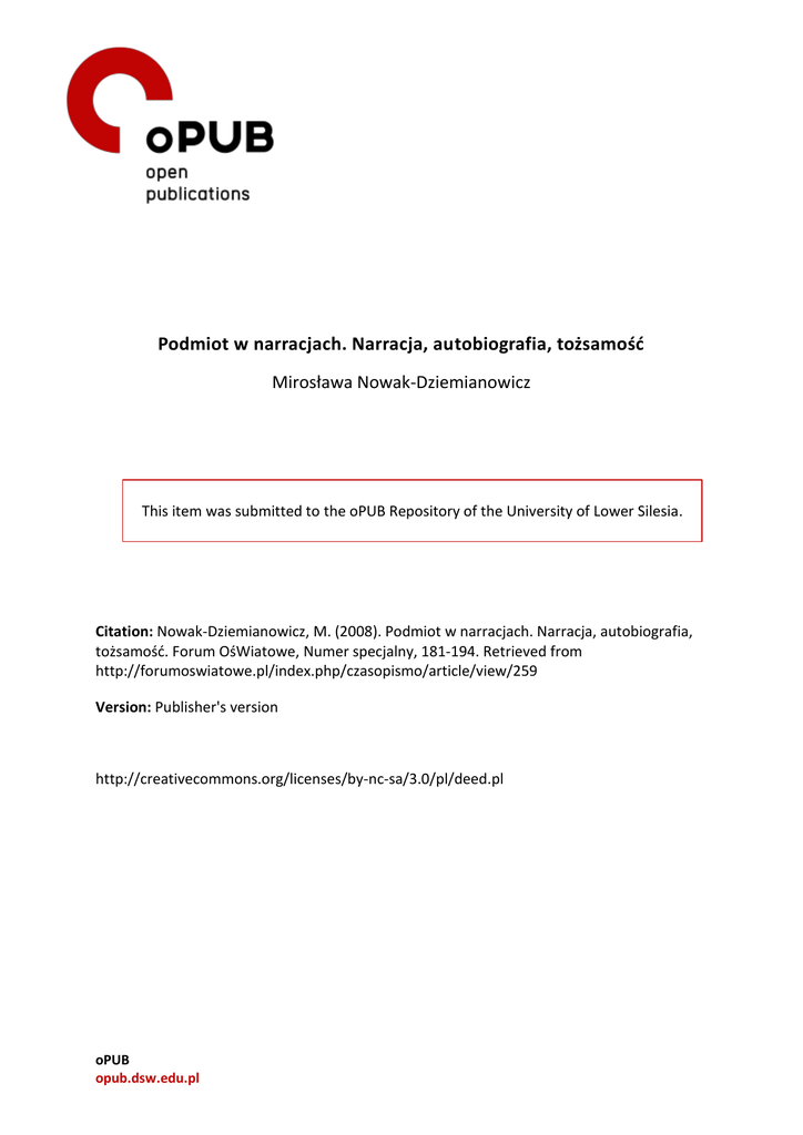 Podmiot w narracjach. Narracja, autobiografia, tożsamość Mirosława Nowak-Dziemianowicz This item was submitted to the oPUB Repository of the University of Lower Silesia. Citation: Nowak-Dziemianowicz, M. (2008). Podmiot w narracjach. Narracja, autobiografia, tożsamość. Forum OśWiatowe, Numer specjalny, 181-194. Retrieved from http://forumoswiatowe.pl/index.php/czasopismo/article/view/259 Version: Publisher's version http://creativecommons.org/licenses/by-nc-sa/3.0/pl/deed.pl oPUB opub.dsw.edu.pl FORUM OŚWIATOWE, numer specjalny, 2008 PL ISSN 0867–0323 Mirosława Nowak-Dziemianowicz Dolnośląska Szkoła Wyższa PODMIOT W NARRACJACH Narracja, autobiografia, tożsamość Tekst ten jest próbą udzielenia odpowiedzi na pytanie o to, jak podmiot (człowiek) obecny jest w narracjach dostępnych współczesnemu badaczowi – przedstawicielowi nauk społecznych czy też humanistyki? Czy i w jaki sposób podmiot istnieje w formie dostępnej wglądowi badacza, gdzie można go spotkać, zobaczyć, zrozumieć? Jest to więc pytanie praktyczne, a do odpowiedzi na nie prowadzi droga odmienna od tej, jaką przyjmuje filozof, rozważający kategorie pojęciowe na metapoziomie ich ogólności, posługując się abstrakcją. Poszukiwanie odpowiedzi na pytanie o to, kim jest człowiek, jak myśli i jak radzi sobie z własnym, jednostkowym i społecznym doświadczeniem prowadzi badacza w stronę narracji. Dzięki niej i poprzez nią możliwe staje się niejako „wejście w świat” dostępny opowiadającemu podmiotowi, dotknięcie i zrozumienie tego świata. Zaakcentowanie odmienności punktu wyjścia do stawianego o podmiot pytania wydaje mi się więc kluczowe. Wynika ono z głębokiego przekonania, iż rozważanie problemów podmiotu na poziomie abstrakcyjnej dyskusji filozoficznej to coś zupełnie innego, niż ich rzeczywiste „przeżywanie”. Sądzę, iż okazją do takiego współprzeżywania czyjegoś życia, doświadczeń, sposobów stanowienia sensu, nadawania znaczeń codziennym wydarzeniom dają historie życia, opowiadania o życiu, opowieści biograficzne, dają ją narracje. Jednostkowe historie, w których ujawnia się „mądrość powieści” i niepowtarzalność jednostkowego losu mogą być punktem wyjścia do postawienia pytania o podmiot i podmiotowość. Pytania subiektywnego zarówno w perspektywie badacza jak i opowiadającego historie życia narratora a dotyczącego tego kiedy, w jaki 182 Mirosława Nowak-Dziemianowicz sposób i dzięki jakim zdarzeniom psychospołecznym ludzie czują się podmiotami własnych działań, sprawcami własnego losu. Te jednostkowe, subiektywne historie stają się więc punktem wyjścia do postawienia pytania nie o to, czym podmiot jest (w systemach filozoficznych, koncepcjach teoretycznych) i jak ontologiczny sens tego pojęcia jest odczytywany przez pedagogikę i pedagogów, lecz o to, w jaki sposób ludzie odczuwają, jak rozumieją i jak opisują własną podmiotowość. W ten sposób historie życia, autobiografie i autonarracje stają się początkiem, inspiracją dla namysłu, opisu oraz próby zrozumienia tego, jak podmiot istnieje, a nie punktem dojścia, rozstrzygnięciem problemu. Wypowiedzi biograficzne i autobiograficzne oparte na autonarracjach są dla mnie rzeczywistym źródłem cudzych i własnych doświadczeń egzystencjalnych, są takim właśnie punktem wyjścia do stawiania pytania o podmiot i podmiotowość. Narracja to opowieść mająca swojego autora, swój przedmiot i motyw bądź cel uzasadniający potrzebę opowiadania. Jeżeli dotyczy ona własnych przeżyć i doświadczeń opowiadającej osoby, mamy do czynienia z autonarracją. Biografia to opis biegu życia konkretnego człowieka. Autonarracje odnoszą się do własnej biografii, są zapisem historii życia z perspektywy doświadczającego zdarzeń człowieka. Każdy człowiek tworzy swój indywidualny wzór życia, swoją indywidualną biografię. Nie oznacza to jednak, że wzory te są całkowicie dowolne i że możliwa jest ich nieskończona liczba. „Planowanie życia dokonuje się w polu napięcia między społecznymi oczekiwaniami, indywidualnymi nastawieniami i aspiracjami oraz konkretnymi warunkami życia i interwencyjnym wpływem różnych instytucji” (Urbaniak-Zając 1999). Jednostkowa biografia jest więc z jednej strony zapisem indywidualnego biegu życia, z drugiej zaś strony jak w soczewce skupiają się w niej społeczne możliwości i bariery, normy i reguły ładu społecznego oraz dostępne jednostce sposoby ich przestrzegania i przezwyciężania. W indywidualnej, jednostkowej biografii znajdziemy także zapis sposobów strategii i możliwości radzenia sobie z barierami, na jakie działający i doświadczający codzienności człowiek napotyka, z jakimi musi się zmierzyć, jakim musi sprostać. Z tego punktu widzenia biografia jest podwójnie bogata w wiedzę: dowiadujemy się z niej czegoś o jednostce (podmiocie codzienności), jak i o kontekście społeczno-kulturowym, w jakim ona żyje. Biografia posiada także wymiar historyczny; wszakże to my, uczestnicy codziennych zdarzeń, jesteśmy zarówno aktorami, jak i świadkami historycznych przemian, wydarzeń, które następnie stają się przedmiotem analiz i opracowań historycznych. W biografii odnaleźć więc można pytanie o to, jak w sytuacji ryzyka, niespójnej i nieciągłej współczesności, w czasie różnicowania się kultur radzi sobie jednostka, jak orientuje się w tak złożonym społeczeństwie. Jak możliwe jest podej- Podmiot w narracjach 183 mowanie przez nią spójnego działania przy oddziaływaniu tak wielu sprzecznych ze sobą bodźców? Jak radzi sobie podmiot, który nie jest przede wszystkim istotą reaktywną, reagującą na działające na niego bodźce, nie tylko dokonuje wyborów między możliwymi drogami życia, nie tylko aktywnie przystosowuje się do nowych warunków, ale wyznacza także własne cele, wykorzystuje nadarzające się okazje, ko