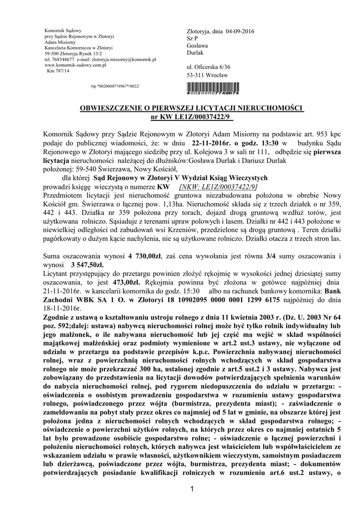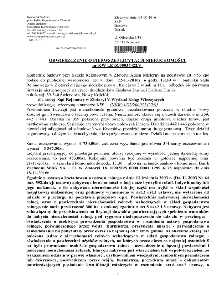 Komornik Sądowy przy Sądzie Rejonowym w Złotoryi Adam Misiorny Kancelaria Komornicza w Złotoryi 59-500 Złotoryja Rynek 13/2 tel. 768548677 e-mail: [email protected] www.komornik-sadowy.com.pl Km 787/14 #ip *0020000774967*/0022/ Złotoryja, dnia 04-09-2016 Sz P Gosława Durlak ul. Oficerska 6/36 53-311 Wrocław *0020000774967* OBWIESZCZENIE O PIERWSZEJ LICYTACJI NIERUCHOMOŚCI nr KW LE1Z/00037422/9 Komornik Sądowy przy Sądzie Rejonowym w Złotoryi Adam Misiorny na podstawie art. 953 kpc podaje do publicznej wiadomości, że: w dniu 22-11-2016r. o godz. 13:30 w budynku Sądu Rejonowego w Złotoryi mającego siedzibę przy ul. Kolejowa 3 w sali nr 111, odbędzie się pierwsza licytacja nieruchomości należącej do dłużników:Gosława Durlak i Dariusz Durlak położonej: 59-540 Świerzawa, Nowy Kościół, dla której Sąd Rejonowy w Złotoryi V Wydział Ksiąg Wieczystych prowadzi księgę wieczystą o numerze KW [NKW: LE1Z/00037422/9] Przedmiotem licytacji jest nieruchomość gruntowa niezabudowana położona w obrebie Nowy Kościół gm. Świerzawa o łącznej pow. 1,13ha. Nieruchomość składa się z trzech działek o nr 359, 442 i 443. Działka nr 359 położona przy torach, dojazd drogą gruntową wzdłuż torów, jest użytkowana rolniczo. Sąsiaduje z terenami upraw polowych i lasem. Działki nr 442 i 443 położone w niewielkiej odległości od zabudowań wsi Krzeniów, przedzielone są drogą gruntową . Teren działki pagórkowaty o dużym kącie nachylenia, nie są użytkowane rolniczo. Działki otacza z trzech stron las. Suma oszacowania wynosi 4 730,00zł, zaś cena wywołania jest równa 3/4 sumy oszacowania i wynosi 3 547,50zł. Licytant przystępujący do przetargu powinien złożyć rękojmię w wysokości jednej dziesiątej sumy oszacowania, to jest 473,00zł. Rękojmia powinna być złożona w gotówce najpóżniej dnia 21-11-2016r. w kancelarii komornika do godz. 15:30 albo na rachunek bankowy komornika: Bank Zachodni WBK SA 1 O. w Złotoryi 18 10902095 0000 0001 1299 6175 najpóźniej do dnia 18-11-2016r. Zgodnie z ustawą o kształtowaniu ustroju rolnego z dnia 11 kwietnia 2003 r. (Dz. U. 2003 Nr 64 poz. 592;dalej: ustawa) nabywcą nieruchomości rolnej może być tylko rolnik indywidualny lub jego małżonek, o ile nabywana nieruchomość lub jej część ma wejść w skład wspólności majątkowej małżeńskiej oraz podmioty wymienione w art.2 ust.3 ustawy, nie wyłączone od udziału w przetargu na podstawie przepisów k.p.c. Powierzchnia nabywanej nieruchomości rolnej, wraz z powierzchnią nieruchomości rolnych wchodzących w skład gospodarstwa rolnego nie może przekraczać 300 ha, ustalonej zgodnie z art.5 ust.2 i 3 ustawy. Nabywca jest zobowiązany do przedstawienia na licytacji dowodów potwierdzających spełnienia warunków do nabycia nieruchomości rolnej, pod rygorem niedopuszczenia do udziału w przetargu: oświadczenia o osobistym prowadzeniu gospodarstwa w rozumieniu ustawy gospodarstwa rolnego, poświadczonego przez wójta (burmistrza, prezydenta miast); - zaświadczenie o zameldowaniu na pobyt stały przez okres co najmniej od 5 lat w gminie, na obszarze której jest położona jedna z nieruchomości rolnych wchodzących w skład gospodarstwa rolnego; oświadczenie o powierzchni użytków rolnych, na których przez okres co najmniej ostatnich 5 lat było prowadzone osobiście gospodarstwo rolne; - oświadczenie o łącznej powierzchni i położeniu nieruchomości rolnych, których nabywca jest właścicielem lub współwłaścicielem ze wskazaniem udziału w prawie własności, użytkownikiem wieczystym, samoistnym posiadaczem lub dzierżawcą, poświadczone przez wójta, burmistrza, prezydenta miast; - dokumentów potwierdzających posiadanie kwalifikacji rolniczych w rozumieniu art.6 ust.2 ustawy, o 1 których mowa w § 6 i 7 Rozporządzenia Ministra Rolnictwa i Rozwoju Wsi z dnia 17 stycznia 2012 r. w sprawie kwalifikacji rolniczych posiadanych przez osoby wykonujące działalność rolniczą (Dz. U. z 2012 r. poz. 109) oraz dokumentów wydanych przez właściwe organy lub instytucje państw członkowskich Europejskiego Obszaru Gospodarczego oraz Konfederacji Szwajcarskiej. Zgodnie z przepisem art.976 §1 kpc w przetargu nie mogą uczestniczyć osoby, które mogą nabyć nieruchomość tylko za zezwoleniem organu państwowego, a zezwolenia tego nie przedstawiły oraz inne osoby wymienione w tym artykule. W ciągu dwóch ostatnich tygodni przed licytacją wolno oglądać nieruchomość w dni powszednie po wcześniejszym uzgodnieniu terminu oraz przeglądać w kancelarii komornika odpis protokołu oszacowania nieruchomości, operat szacunkowy biegłego sądowego, wypis z rejestru gruntów wraz z mapką z akt postępowania egzekucyjnego. Prawa osób trzecich nie będą przeszkodą do licytacji i przysądzenia własności na rzecz nabywcy bez zastrzeżeń, jeżeli osoby te przed rozpoczęciem przetargu nie złożą dowodu, że wniosły powództwo o zwolnienie nieruchomości lub przedmiotów razem z nią zajętych od egzekucji i uzyskały w tym zakresie orzeczenie wstrzymujące egzekucję. Użytkowanie, służebności i prawa dożywotnika, jeżeli nie są ujawnione w księdze wieczystej lub przez złożenie dokumentu do zbioru dokumentów i nie zostaną zgłoszone najpóźniej na trzy dni przed rozpoczęciem licytacji, nie będą uwzględnione w dalszym toku egzekucji i wygasną z chwilą uprawomocnienia się postanowienia o przysądzeniu własności. Komornik Sądowy Adam Misiorny 2