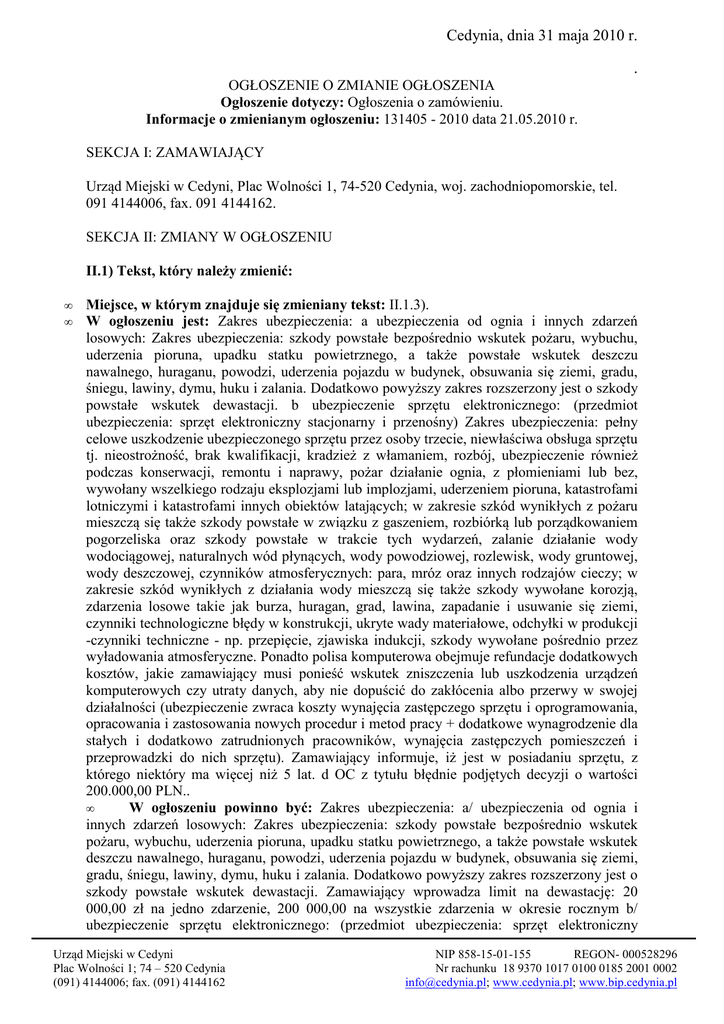 Cedynia, dnia 31 maja 2010 r. . OGŁOSZENIE O ZMIANIE OGŁOSZENIA Ogłoszenie dotyczy: Ogłoszenia o zamówieniu. Informacje o zmienianym ogłoszeniu: 131405 - 2010 data 21.05.2010 r. SEKCJA I: ZAMAWIAJĄCY Urząd Miejski w Cedyni, Plac Wolności 1, 74-520 Cedynia, woj. zachodniopomorskie, tel. 091 4144006, fax. 091 4144162. SEKCJA II: ZMIANY W OGŁOSZENIU II.1) Tekst, który należy zmienić: • • Miejsce, w którym znajduje się zmieniany tekst: II.1.3). W ogłoszeniu jest: Zakres ubezpieczenia: a ubezpieczenia od ognia i innych zdarzeń losowych: Zakres ubezpieczenia: szkody powstałe bezpośrednio wskutek pożaru, wybuchu, uderzenia pioruna, upadku statku powietrznego, a także powstałe wskutek deszczu nawalnego, huraganu, powodzi, uderzenia pojazdu w budynek, obsuwania się ziemi, gradu, śniegu, lawiny, dymu, huku i zalania. Dodatkowo powyższy zakres rozszerzony jest o szkody powstałe wskutek dewastacji. b ubezpieczenie sprzętu elektronicznego: (przedmiot ubezpieczenia: sprzęt elektroniczny stacjonarny i przenośny) Zakres ubezpieczenia: pełny celowe uszkodzenie ubezpieczonego sprzętu przez osoby trzecie, niewłaściwa obsługa sprzętu tj. nieostrożność, brak kwalifikacji, kradzież z włamaniem, rozbój, ubezpieczenie również podczas konserwacji, remontu i naprawy, pożar działanie ognia, z płomieniami lub bez, wywołany wszelkiego rodzaju eksplozjami lub implozjami, uderzeniem pioruna, katastrofami lotniczymi i katastrofami innych obiektów latających; w zakresie szkód wynikłych z pożaru mieszczą się także szkody powstałe w związku z gaszeniem, rozbiórką lub porządkowaniem pogorzeliska oraz szkody powstałe w trakcie tych wydarzeń, zalanie działanie wody wodociągowej, naturalnych wód płynących, wody powodziowej, rozlewisk, wody gruntowej, wody deszczowej, czynników atmosferycznych: para, mróz oraz innych rodzajów cieczy; w zakresie szkód wynikłych z działania wody mieszczą się także szkody wywołane korozją, zdarzenia losowe takie jak burza, huragan, grad, lawina, zapadanie i usuwanie się ziemi, czynniki technologiczne błędy w konstrukcji, ukryte wady materiałowe, odchyłki w produkcji -czynniki techniczne - np. przepięcie, zjawiska indukcji, szkody wywołane pośrednio przez wyładowania atmosferyczne. Ponadto polisa komputerowa obejmuje refundacje dodatkowych kosztów, jakie zamawiający musi ponieść wskutek zniszczenia lub uszkodzenia urządzeń komputerowych czy utraty danych, aby nie dopuścić do zakłócenia albo przerwy w swojej działalności (ubezpieczenie zwraca koszty wynajęcia zastępczego sprzętu i oprogramowania, opracowania i zastosowania nowych procedur i metod pracy + dodatkowe wynagrodzenie dla stałych i dodatkowo zatrudnionych pracowników, wynajęcia zastępczych pomieszczeń i przeprowadzki do nich sprzętu). Zamawiający informuje, iż jest w posiadaniu sprzętu, z którego niektóry ma więcej niż 5 lat. d OC z tytułu błędnie podjętych decyzji o wartości 200.000,00 PLN.. • W ogłoszeniu powinno być: Zakres ubezpieczenia: a/ ubezpieczenia od ognia i innych zdarzeń losowych: Zakres ubezpieczenia: szkody powstałe bezpośrednio wskutek pożaru, wybuchu, uderzenia pioruna, upadku statku powietrznego, a także powstałe wskutek deszczu nawalnego, huraganu, powodzi, uderzenia pojazdu w budynek, obsuwania się ziemi, gradu, śniegu, lawiny, dymu, huku i zalania. Dodatkowo powyższy zakres rozszerzony jest o szkody powstałe wskutek dewastacji. Zamawiający wprowadza limit na dewastację: 20 000,00 zł na jedno zdarzenie, 200 000,00 na wszystkie zdarzenia w okresie rocznym b/ ubezpieczenie sprzętu elektronicznego: (przedmiot ubezpieczenia: sprzęt elektroniczny Urząd Miejski w Cedyni Plac Wolności 1; 74 – 520 Cedynia (091) 4144006; fax. (091) 4144162 NIP 858-15-01-155 REGON- 000528296 Nr rachunku 18 9370 1017 0100 0185 2001 0002 [email protected]; www.cedynia.pl; www.bip.cedynia.pl Cedynia, dnia 31 maja 2010 r. stacjonarny i przenośny) Zakres ubezpieczenia: pełny - celowe uszkodzenie ubezpieczonego sprzętu przez osoby trzecie, niewłaściwa obsługa sprzętu tj. nieostrożność, brak kwalifikacji, kradzież z włamaniem, rozbój, - ubezpieczenie również podczas konserwacji, remontu i naprawy, -pożar - działanie ognia, z płomieniami lub bez, wywołany wszelkiego rodzaju eksplozjami lub implozjami, uderzeniem pioruna, katastrofami lotniczymi i katastrofami innych obiektów latających; w zakresie szkód wynikłych z pożaru mieszczą się także szkody powstałe w związku z gaszeniem, rozbiórką lub porządkowaniem pogorzeliska oraz szkody powstałe w trakcie tych wydarzeń, -zalanie - działanie wody wodociągowej, naturalnych wód płynących, wody powodziowej, rozlewisk, wody gruntowej, wody deszczowej, czynników atmosferycznych: para, mróz oraz innych rodzajów cieczy; w zakresie szkód wynikłych z działania wody mieszczą się także szkody wywołane korozją, -zdarzenia losowe - takie jak burza, huragan, grad, lawina, zapadanie i usuwanie się ziemi, -czynniki technologiczne błędy w konstrukcji, ukryte wady materiałowe, odchyłki w produkcji -czynniki techniczne np. przepięcie, zjawiska indukcji, szkody wywołane pośrednio przez wyładowania atmosferyczne. Ponadto polisa komputerowa obejmuje refundacje dodatkowych kosztów, jakie zamawiający musi ponieść wskutek zniszczenia lub uszkodzenia urządzeń komputerowych czy utraty danych, aby nie dopuścić do zakłócenia albo przerwy w swojej działalności (ubezpieczenie zwraca koszty wynajęcia zastępczego sprzętu i oprogramowania, opracowania i zastosowania nowych procedur i metod pracy + dodatkowe wynagrodzenie dla stałych i dodatkowo zatrudnionych pracowników, wynajęcia zastępczych pomieszczeń i przeprowadzki do nich sprzętu). Zamawiający informuje, iż jest w posiadaniu sprzętu, z którego niektóry ma więcej niż 5 lat. c/ ubezpieczenie danych i ich nośników: - obejmuje dane główne i transakcyjne zaw