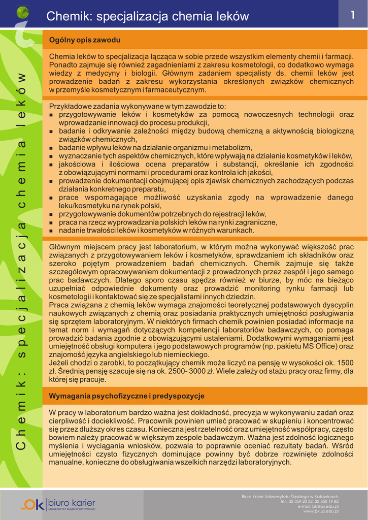 Chemik: specjalizacja chemia leków 1 C h e m i k : s p e c j a l i z a c j a c h e m i a l e k ó w Ogólny opis zawodu Chemia leków to specjalizacja ³¹cz¹ca w sobie przede wszystkim elementy chemii i farmacji. Ponadto zajmuje siê równie¿ zagadnieniami z zakresu kosmetologii, co dodatkowo wymaga wiedzy z medycyny i biologii. G³ównym zadaniem specjalisty ds. chemii leków jest prowadzenie badañ z zakresu wykorzystania okreœlonych zwi¹zków chemicznych w przemyœle kosmetycznym i farmaceutycznym. Przyk³adowe zadania wykonywane w tym zawodzie to: leków i kosmetyków za pomoc¹ nowoczesnych technologii oraz wprowadzanie innowacji do procesu produkcji, n badanie i odkrywanie zale¿noœci miêdzy budow¹ chemiczn¹ a aktywnoœci¹ biologiczn¹ zwi¹zków chemicznych, n badanie wp³ywu leków na dzia³anie organizmu i metabolizm, n wyznaczanie tych aspektów chemicznych, które wp³ywaj¹ na dzia³anie kosmetyków i leków, n jakoœciowa i iloœciowa ocena preparatów i substancji, okreœlanie ich zgodnoœci z obowi¹zuj¹cymi normami i procedurami oraz kontrola ich jakoœci, n prowadzenie dokumentacji obejmuj¹cej opis zjawisk chemicznych zachodz¹cych podczas dzia³ania konkretnego preparatu, n prace wspomagaj¹ce mo¿liwoœæ uzyskania zgody na wprowadzenie danego leku/kosmetyku na rynek polski, n przygotowywanie dokumentów potrzebnych do rejestracji leków, n praca na rzecz wyprowadzania polskich leków na rynki zagraniczne, n nadanie trwa³oœci leków i kosmetyków w ró¿nych warunkach. n przygotowywanie G³ównym miejscem pracy jest laboratorium, w którym mo¿na wykonywaæ wiêkszoœæ prac zwi¹zanych z przygotowywaniem leków i kosmetyków, sprawdzaniem ich sk³adników oraz szeroko pojêtym prowadzeniem badañ chemicznych. Chemik zajmuje siê tak¿e szczegó³owym opracowywaniem dokumentacji z prowadzonych przez zespó³ i jego samego prac badawczych. Dlatego sporo czasu spêdza równie¿ w biurze, by móc na bie¿¹co uzupe³niaæ odpowiednie dokumenty oraz prowadziæ monitoring rynku farmacji lub kosmetologii i kontaktowaæ siê ze specjalistami innych dziedzin. Praca zwi¹zana z chemi¹ leków wymaga znajomoœci teoretycznej podstawowych dyscyplin naukowych zwi¹zanych z chemi¹ oraz posiadania praktycznych umiejêtnoœci pos³ugiwania siê sprzêtem laboratoryjnym. W niektórych firmach chemik powinien posiadaæ informacje na temat norm i wymagañ dotycz¹cych kompetencji laboratoriów badawczych, co pomaga prowadziæ badania zgodnie z obowi¹zuj¹cymi ustaleniami. Dodatkowymi wymaganiami jest umiejêtnoœæ obs³ugi komputera i jego podstawowych programów (np. pakietu MS Office) oraz znajomoœæ jêzyka angielskiego lub niemieckiego. Je¿eli chodzi o zarobki, to pocz¹tkuj¹cy chemik mo¿e liczyæ na pensjê w wysokoœci ok. 1500 z³. Œredni¹ pensjê szacuje siê na ok. 2500- 3000 z³. Wiele zale¿y od sta¿u pracy oraz firmy, dla której siê pracuje. Wymagania psychofizyczne i predyspozycje W pracy w laboratorium bardzo wa¿na jest dok³adnoœæ, precyzja w wykonywaniu zadañ oraz cierpliwoœæ i dociekliwoœæ. Pracownik powinien umieæ pracowaæ w skupieniu i koncentrowaæ siê przez d³u¿szy okres czasu. Konieczna jest rzetelnoœæ oraz umiejêtnoœæ wspó³pracy, czêsto bowiem nale¿y pracowaæ w wiêkszym zespole badawczym. Wa¿na jest zdolnoœæ logicznego myœlenia i wyci¹gania wniosków, pozwala to poprawnie oceniaæ rezultaty badañ. Wœród umiejêtnoœci czysto fizycznych dominuj¹ce powinny byæ dobrze rozwiniête zdolnoœci manualne, konieczne do obs³ugiwania wszelkich narzêdzi laboratoryjnych. biuro karier UNIWERSYTET ŒL¥SKI W KATOWICACH Biuro Karier Uniwersytetu Œl¹skiego w Katowicach tel.: 32 359 20 32, 32 350 19 82 e-mail: [email protected] www.bk.us.edu.pl Chemik: specjalizacja chemia leków 2 s p e c j a l i z a c j a c h e m i a l e k ó w Zainteresowania Praca przy tworzeniu leków lub kosmetyków wymaga szczególnych zainteresowañ w jednej lub obu z tych dziedzin. Dodatkowo wa¿ne jest, aby mieæ wiedzê z zakresu biochemii, fizyki, medycyny, biologii czy przedmiotów pokrewnych. Chemik powinien te¿ na bie¿¹co œledziæ innowacje z zakresu farmacji-kosmetologii, dziêki czemu ma mo¿liwoœæ ci¹g³ego rozwoju zawodowego oraz wykorzystania znajomoœci jêzyków obcych. Przydatne mog¹ byæ te¿ zainteresowania zwi¹zane z obs³ug¹ komputera i jego podstawowych programów. Przeciwwskazania zdrowotne G³ównym miejscem pracy chemika jest laboratorium, w którym mo¿na byæ nara¿onym na dzia³anie ró¿nych czynników i substancji. St¹d te¿ zawód ten nie jest wskazany zw³aszcza dla alergików oraz osób, które cierpi¹ z powodu trudnoœci z oddychaniem. Istotna jest sprawnoœæ wszystkich zmys³ów, pozwala ona w odpowiedni sposób u¿ywaæ i oceniaæ poszczególne preparaty. Praca w laboratorium wymaga sprawnoœci koñczyn górnych i umiejêtnoœci manualnych, st¹d te¿ niepe³nosprawnoœæ w tym zakresie jest cech¹ uniemo¿liwiaj¹c¹ lub utrudniaj¹c¹ pracê (w przypadku lekkich niedow³adów). Wymagane kwalifikacje i œcie¿ka kszta³cenia Oprócz specyficznych zainteresowañ, do podjêcia pracy w charakterze chemika konieczne jest ukoñczenie studiów wy¿szych. Do pracy z lekami i kosmetykami nale¿y wybraæ chemiê (specjalizacja: chemia leków) lub farmacjê. Nale¿y te¿ nabyæ wiedzê dotycz¹c¹ norm odnoœnie pracy laboratoriów oraz przepisów BHP. W czasie studiów warto poznaæ specyfikê pracy w zawodzie poprzez podjêcie praktyk zawodowych. Pozwoli to na praktyczne wykorzystanie wiedzy i nabycie nowych umiejêtnoœci, przydatnych w dalszym rozwoju zawodowym oraz na etapie poszukiwania pracy ju¿ po ukoñczeniu studiów. Osoby zainteresowane dalsz¹ nauk¹ i pog³êbianiem swojej wiedzy w konkretnej dziedzinie mog¹ podj¹æ studia podyplomowe. Przyk³adowe miejsca pracy: n Baxter Polska Sp. z o.o. (firma farmaceutyczna) n Selvita Sp. z o. o. (firma biotechnologiczna bran¿y farmaceutycznej i chemic