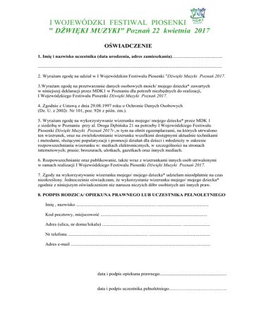 I WOJEWÓDZKI FESTIWAL PIOSENKI " DŹWIĘKI MUZYKI" Poznań 22 kwietnia 2017 OŚWIADCZENIE 1. Imię i nazwisko uczestnika (data urodzenia, adres zamieszkania)........................................... ............................................................................................................................................................. 2. Wyrażam zgodę na udział w I Wojewódzkim Festiwalu Piosenki "Dźwięki Muzyki Poznań 2017. 3.Wyrażam zgodę na przetwarzanie danych osobowych moich/ mojego dziecka* zawartych w niniejszej deklaracji przez MDK1 w Poznaniu dla potrzeb niezbędnych do realizacji, I Wojewódzkiego Festiwalu Piosenki Dźwięki Muzyki Poznań 2017. 4. Zgodnie z Ustawą z dnia 29.08.1997 roku o Ochronie Danych Osobowych (Dz. U. z 2002r. Nr 101, poz. 926 z późn. zm.). 5. Wyrażam zgodę na wykorzystywanie wizerunku mojego/ mojego dziecka* przez MDK 1 z siedzibą w Poznaniu przy al. Droga Dębińska 21 na potrzeby I Wojewódzkiego Festiwalu Piosenki Dźwięki Muzyki Poznań 2017r.,w tym na obrót egzemplarzami, na których utrwalono ten wizerunek, oraz na zwielokrotnianie wizerunku wszelkimi dostępnymi aktualnie technikami i metodami, służącymi popularyzacji i promocji działań dla dzieci i młodzieży w zakresie rozpowszechniania wizerunku w: mediach elektronicznych, w szczególności na stronach internetowych; prasie; broszurach, ulotkach, gazetkach oraz innych mediach. 6. Rozpowszechnianie oraz publikowanie, także wraz z wizerunkami innych osób utrwalonymi w ramach realizacji I Wojewódzkiego Festiwalu Piosenki Dźwięki Muzyki Poznań 2017. 7. Zgody na wykorzystywanie wizerunku mojego/ mojego dziecka* udzielam nieodpłatnie na czas nieokreślony. Jednocześnie oświadczam, że wykorzystanie wizerunku mojego/ mojego dziecka* zgodnie z niniejszym oświadczeniem nie narusza niczyich dóbr osobistych ani innych praw. 8. PODPIS RODZICA/ OPIEKUNA PRAWNEGO LUB UCZESTNIKA PEŁNOLETNIEGO Imię , nazwisko .................................................................... ............................................ Kod pocztowy, miejscowość ........................................................................................... Adres (ulica, nr domu/lokalu) .................................................................... ....................... Nr telefonu .................................................................... .................................................... Adres e-mail ....................................................................................................................... data i podpis opiekuna prawnego......................................................... data i podpis uczestnika pełnoletniego……………………………….