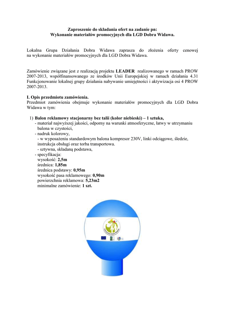 Zaproszenie do składania ofert na zadanie pn: Wykonanie materiałów promocyjnych dla LGD Dobra Widawa. Lokalna Grupa Działania Dobra Widawa zaprasza do złożenia oferty cenowej na wykonanie materiałów promocyjnych dla LGD Dobra Widawa. Zamówienie związane jest z realizacją projektu LEADER realizowanego w ramach PROW 2007-2013, współfinansowanego ze środków Unii Europejskiej w ramach działania 4.31 Funkcjonowanie lokalnej grupy działania nabywanie umiejętności i aktywizacja osi 4 PROW 2007-2013. I. Opis przedmiotu zamówienia. Przedmiot zamówienia obejmuje wykonanie materiałów promocyjnych dla LGD Dobra Widawa w tym: 1) Balon reklamowy stacjonarny bez talii (kolor niebieski) – 1 sztuka, - materiał najwyższej jakości, odporny na warunki atmosferyczne, łatwy w utrzymaniu balona w czystości, - nadruk kolorowy, - w wyposażeniu standardowym balona kompresor 230V, linki odciągowe, śledzie, instrukcja obsługi oraz torba transportowa. - sztywna, składaną podstawa, - specyfikacja: wysokość: 2,5m średnica: 1,85m średnica podstawy: 0,95m wysokość pasa reklamowego: 0,90m powierzchnia reklamowa: 5,23m2 minimalne zamówienie: 1 szt. logowanie: Europejski Fundusz Rolny na rzecz Rozwoju Obszarów Wiejskich: Europa inwestująca w obszary wiejskie Projekt realizowany przez LGD Dobra Widawa współfinansowany ze środków Unii Europejskiej w ramach Programu Rozwoju Obszarów Wiejskich na lata2007-2013, osi IV LEADER, działanie 4.31 „Funkcjonowanie lokalnej grupy działania, nabywanie umiejętności i aktywizacja”. Instytucja zarządzająca Programem Rozwoju Obszarów Wiejskich na lata 2007-2013 – Minister Rolnictwa i Rozwoju Wsi. 2) filiżanka z podstawką (kolor biały, nadruk w kolorze czarnym) – 200 kompletów, specyfikacja: - kwadratowa filiżanka z talerzykiem o średnicy 135 mm, duże ucho, wykonane z porcelany. Pojemność 150 ml, - pakowanie w czarne kartonowe opakowanie upominkowe, - wymiary produktu: 80mm/Fi65x65 mm 3) Brelok metalowy z żetonem - 200 sztuk. specyfikacja: - rozmiar żetonu 1 zł /1 EUR, jednostronny kolor, - pakowanie w czarne kartonowe opakowanie upominkowe, - logo umieszczone na breloku techniką grawerki laserowej, - wymiary:32x5x48 mm. 4) Kamizelka odblaskowa dla dorosłych w kolorze niebieskim, ologowana zgodnie z księgą wizualizacji wraz z logo LGD Dobra Widawa - 200 sztuk, - rozmiary i ilości: S - 40 szt, M - 30 szt, L - 50 szt, XL - 50 szt, XXL - 30 szt. 5) Samozaciskowe opaski odblaskowe – 200 sztuk (100 szt. zielonych, 100 szt. niebieskich) specyfikacja: - wymiar: 34 x 3 cm, - kolorystyka do wyboru wg wzornika, - blaszka samozaciskowa zalaminowana odblaskową folią pryzmatyczną, - spód: materiał typu flock, - uniwersalne zastosowanie, wzór logowania (logotypy monochromatyczne – ologowanie białe na tle opaski): LOKALNA GRUPA DZIAŁANIA DOBRA WIDAWA 6) pendrive 8 GB (kolor niebieski, nadruk w kolorze białym lub grawer) – 200 sztuk, logowanie: Wszystkie materiały promocyjne będą ologowane (nadruk lub grawer) zgodnie z księgą wizualizacji znaku Programu Rozwoju Obszarów Wiejskich na lata 2007-2013 obowiązującą na dzień wykonania zamówienia. II. Informacje dodatkowe do przedmiotu zamówienia: 1. Zamawiający udostępni (przekaże drogą elektroniczną) Wykonawcy/om materiały niezbędne do przygotowania materiałów promocyjnych (grafiki). 2. Przedmiot zamówienia będzie zgodny z wymogami księgi wizualizacji znaku Programu Rozwoju Obszarów Wiejskich na lata 2007-2013 obowiązującą na dzień wykonania zamówienia. 3. Wykonawca przedłoży Zamawiającemu koncepcję przedmiotu zamówienia do zatwierdzenia w terminie do 5 dni roboczych od dnia podpisania umowy. 4. Wykonawca zobowiązany będzie do wykorzystania materiałów dostarczonych przez Zamawiającego wyłącznie do realizacji przedmiotu umowy. 5. Wykonawca odpowiada za: błędy literowe, układ i jakość drukowanych zdjęć, które pojawiły się na materiałach promocyjnych z winy wykonawcy. 6. Zamawiający zastrzega sobie prawo pisemnej akceptacji . 7. Wykonawca w ramach usługi zobowiązuje się dostarczyć przedmiot zamówienia na własny koszt do siedziby Zamawiającego, na adres: LGD Dobra Widawa, ul. Wojska Polskiego 67/69, 56-400 Oleśnica – w terminie do 27.03.2015 r. III. Informacje ogólne. 1. Każdy z wykonawców może złożyć tylko jedną ofertę. W ofercie należy podać ogółem oraz w rozbiciu na poszczególne materiały promocyjne (zgodnie z załączonym wzorem). 2. Wykonawca ponosi wszelkie koszty związane z przygotowaniem i złożeniem oferty. 3. Nie dopuszcza się składania ofert częściowych. 3. Zamawiający nie dopuszcza możliwości podzlecania wykonania danego działania. 4. Zamawiający dopuszcza unieważnienie części lub całości postępowania. 4. W przypadku przekroczenia kwoty, jaką LGD Dobra Widawa dysponuje na sfinansowanie zamówienia, dopuszcza się negocjację oferowanej ceny. 5. Osobą uprawnioną do bezpośredniego kontaktowania się z oferentami jest Beata Zięba – Specjalista ds. koordynacji projektu tel.71/ 314 32 01. 6. Zamawiający zastrzega sobie prawo unieważnienia postępowania. IV. Opis sposobu przygotowania oferty 1. Ofertę należy napisać w języku polskim na maszynie, komputerze lub czytelnym pismem ręcznym. Oferty nieczytelne zostaną odrzucone. 2. Oferta powinna zawierać: Wymagania konieczne: - ofertę cenową sporządzoną przez składającego z danymi adresowymi i danymi personalnymi. - cenę ofertową całkowitą brutto obliczoną wg kalkulacji własnej, wyrażoną w złotych polskich z wyszczególnieniem cen za poszczególne materiały promocyjne. 3. O udzielenie zamówienia mogą ubiegać się firmy/osoby, które: posiadają uprawnienie do wykonywania określonej działalności lub czynności, jeżeli ustawy nakładają posiadania takich uprawnień; są w stanie zapewnić niezbędne zasoby dotyczące przedmiotu zamówienia; znajdują się w sytuacji ekonomicznej i finanso