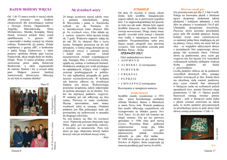 Od 1 do 12 marca trwała w naszej szkole zbiórka Ŝywności oraz środków chemicznych dla potrzebującej rodziny z Nowego Dworu. Organizatorki Angelikę Marcinkowską, Darię Michałowicz, Monikę Konopkę, Marię Durek, wzruszył artykuł, który został opublikowany w gazecie ABC i opowiadał o trudnej sytuacji tej właśnie rodziny. Postanowiły jej pomóc. Dzięki współpracy z gazetą ABC, a konkretnie z panią Kingą Zydorowicz, a takŜe pomocy opiekuna zbiórki pani Lucyny Frąckowiak, akcja mogła dojść do skutku. Dzięki Wam 12 marca produkty zostały zawiezione przez panią Katarzynę Bartkowiak, a takŜe organizatorki do rodziny. Radość i łzy w oczach miłej pani Małgosi jeszcze bardziej zmotywowały dziewczyny. Obiecują, Ŝe nie była to ostatnia zbiórka! Fot. W Nowym Dworze z panią Małgosią Fot. Organizatorki z zebranymi produktami Mary ☺ Gazeta 8 SCRABBLE Na ścieŜkach wiary 24 lutego uczniowie naszej szkoły wraz z paniami katechetkami, panią B. Bieczyńską i panią A. Kurzawską wybrali się do Poznania, by w interaktywnym kinie obejrzeć film pt. Na ścieŜkach wiary. Film składa się z sześciu seansów, które łącznie trwają ok. 3 godz. Widzowie najpierw udają się do sali 3D, by obejrzeć film o Ŝyciu Jezusa. Następnie przenoszą się do sali dźwięków, w której mogą dowiedzieć się ciekawych rzeczy o autorach pieśni i kolęd oraz śpiewać wśród niesamowitych świateł wypełniających salę. Następny film, o stworzeniu świata, ogląda się, siedząc w ruchomych fotelach. Dodatkową atrakcją jest woda pryskająca na oglądających, wiejący wiatr i odgłos zwierząt przebiegających w pobliŜu. Ta sala najbardziej przypadła do gustu naszym wycieczkowiczom. W kolejnej sali kinowej odbywa się rywalizacja Zadanie jest proste. Wykorzystując przenośne urządzenia, naleŜy odpowiadać na pytania ukazujące się na ekranie. Ten, kto ma najwięcej punktów, wygrywa. W ostatniej juŜ sali odbywają się dwa seanse. Pierwszy to seans wyobraźni. Słysząc opowiadanie, sami mamy wyobrazić sobie tę sytuację. Ostatnim punktem jest film pokazujący nam, jak powinniśmy się zachowywać w stosunku do drugiego człowieka. Na tym kończy się film Na ścieŜkach wiary. Naprawdę polecam obejrzenie tego filmu, gdyŜ jest on naprawdę ciekawy, a wraŜenia są niesamowite. Poza tym moŜe po jego obejrzeniu łatwiej będzie kroczyć nam po ścieŜkach naszej wiary. darja Od dnia 18 stycznia w naszej szkole działa koło scrabble. Inauguracyjne zajęcia odbyły się w pierwszym tygodniu ferii. I to najprawdopodobniej był powód, Ŝe było nas tak mało. MoŜna było zagrać Scrabble klasyczne oraz Scrabble karty (wersja nowoczesna). Drugi, mniej znany sposób, wywołał wiele emocji i śmiechu oraz walkę o najmniejszą nawet ilość punktów. Przypomnieliśmy sobie przy okazji zasady ortografii oraz pisownię wyrazów. Nad wszystkim czuwała pani Barbara Palcat – Sroka. SPRAWDŹ SPRAWD SIĘ!! SI !! UłóŜ siedmioliterowe słowa: • AOPMNYD • A L B E K K I (2 rozwiązania) • PLMEUKM • URĘKSAL • PUPRZIE • L M O A E P G (2 rozwiązania) Rozwiązania w następnym numerze. Krótka historia Scrabble zostały wynalezione w 1931 roku przez bezrobotnego architekta Alfreda Moshera Buttsa z Rhinebeck w stanie Nowy Jork. Wartość punktową liter ustalił, obliczając częstotliwość ich występowania na okładce gazety New York Times. AŜ do dziś ich wartości nie uległy zmianie. Grę po raz pierwszy sprzedano w 1946 roku pod nazwą Lewico. Wcześniej Butts próbował zainteresować swoją grą kilka najsłynniejszych wytwórni gier planszowych, jednak wszystkie odrzuciły ją jako zbyt nudną. W 1948 roku prawa do gry nabyła firma Selchow & Righter, która rozpoczęła jej masową produkcję pod nazwą Scrabble. Skrócone zasady gry: Gra przeznaczona jest dla 2, 3 lub 4 osób. Polega na losowaniu płytek z literkami (gracz dysponuje siedmioma takimi płytkami) i kolejnym układaniu z nich słów na planszy o wymiarach 15x15 pól. Układanka przypomina krzyŜówkę. Pierwsze słowo powinno przechodzić przez pole H8 (środek planszy). KaŜdy kolejny wyraz musi wykorzystywać co najmniej jedną literę znajdującą się juŜ na planszy. Gracz, który nie moŜe lub nie chce - ze względów taktycznych ułoŜyć z posiadanych liter poprawnego słowa, pasuje lub wymienia litery. UłoŜone słowa są punktowane, przy czym grę wygrywa ten, kto łącznie (we wszystkich wykonanych ruchach) zdobędzie większą liczbę punktów niŜ kaŜdy z przeciwników. Liczbę punktów oblicza się na podstawie wszystkich ułoŜonych słów, sumując wartości tworzących je liter. KaŜda litera ma określoną, stałą wartość punktową, przy czym wartość liter ułoŜonych w bieŜącym ruchu na wybranych polach specjalnych (tzw. premie literowe) ulega pomnoŜeniu ×2 lub ×3. Oprócz premii literowych istnieją równieŜ premie słowne - jeśli w bieŜącym ruchu jedna z płytek zostanie ustawiona na takim polu, to liczba punktów przyznawanych za przechodzące przez to pole słowo (lub słowa) zostaje pomnoŜona ×2 lub ×3. Fot. Scrabble RAZEM MOśEMY WIĘCEJ Asia Gazeta 17