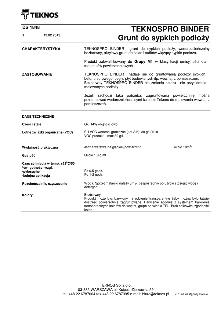 DS 1848 1 TEKNOSPRO BINDER Grunt do sypkich podłoży 13.02.2013 CHARAKTERYSTYKA TEKNOSPRO BINDER grunt do sypkich podłoży, wodorozcieńczalny bezbarwny, akrylowy grunt do ścian i sufitów wiążący sypkie podłoża. Produkt zakwalifikowany do Grupy M1 w klasyfikacji emisyjności dla materiałów powierzchniowych. ZASTOSOWANIE TEKNOSPRO BINDER nadaje się do gruntowania podłoży sypkich, betonu surowego, cegły, płyt budowlanych itp. wewnątrz pomieszczeń. Bezbarwny TEKNOSPRO BINDER nie zmienia koloru i nie przyciemnia malowanych podłoży. Jeżeli zachodzi taka potrzeba, zagruntowaną powierzchnię można przemalować wodorozcieńczalnymi farbami Teknos do malowania wewnątrz pomieszczeń. DANE TECHNICZNE Części stałe Ok. 14% objętościowo Lotne związki organiczne (VOC) EU VOC wartości graniczne (kat.A/h): 30 g/l 2010. VOC produktu: max 30 g/l. Wydajność praktyczna Jedna warstwa na gładkiej powierzchni Gęstość Około 1.0 g/ml 2 około 10m /l 0 Czas schnięcia w temp. +23 C/50 %wilgotności wzgl. -pyłosuche -kolejna aplikacja Po 0,5 godz. Po 1-2 godz. Rozcieńczalnik, czyszczenie Woda. Sprzęt malarski należy umyć bezpośrednio po użyciu stosując wodę i detergent. Kolory Bezbarwny Produkt może być barwiony na odcienie transparentne żeby można było łatwiej dostrzec powierzchnie zagruntowane. Barwienie zgodnie z systemem barwienia transparentnych kolorów do wnętrz, grupa barwienia TPL. Brak całkowitej zgodności koloru. TEKNOS Sp. z o.o. 03-885 WARSZAWA ul. Księcia Ziemowita 59 tel. +48 22 6787004 fax +48 22 6787995 e-mail: [email protected] c.d. na następnej stronie TEKNOSPRO BINDER DS 1848 strona 2 SPOSÓB STOSOWANIA Przygotowanie powierzchni i aplikacja Malowana powierzchnia musi być czysta i sucha. TEKNOSPRO BINDER jest produktem gotowym do użycia lub jeżeli to konieczne może być barwiony na odcienie transparentne. Pozwala to dokładniej stwierdzić, które elementy powierzchni zostały zagruntowane. Nakładać pędzlem, wałkiem lub natryskiem hydrodynamicznym w jednej lub w dwóch warstwach. Średnica dyszy do natrysku bezpowietrznego: 0,013 – 0,017’’. Warunki w trakcie aplikacji Malowana powierzchnia musi być sucha. Temperatura otaczającego powietrza malowanej powierzchni powinna być wyższa niż o +5 C. Wilgotność względna powietrza powinna wynosić poniżej 80%. Przechowywanie Należy przechowywać pomieszczeniu. w szczelnie zamkniętym opakowaniu w chłodnym NIE MOŻE ZAMARZAĆ. Informacje zawarte w arkuszu danych opierają się o badania laboratoryjne i doświadczenia praktyczne. Są to wyłącznie dane informacyjne i zależą np. od koloru i połysku. Nie mając wpływu na stosowanie i warunki nanoszenia możemy brać odpowiedzialność wyłącznie za jakość wyrobu i gwarantować, że odpowiada on naszym normom. Nie bierzemy również odpowiedzialności za straty lub uszkodzenia powstałe w wyniku nanoszenia wyrobów niezgodnie z zaleceniami lub niewłaściwego ich użycia. Najnowsze wersje kart technicznych i charakterystyki znajdują się na stronie: www.teknos.com. TEKNOS Sp. z o.o. 03-885 WARSZAWA ul. Księcia Ziemowita 59 tel. +48 22 6787004 fax +48 22 6787995 e-mail: [email protected] c.d. na następnej stronie