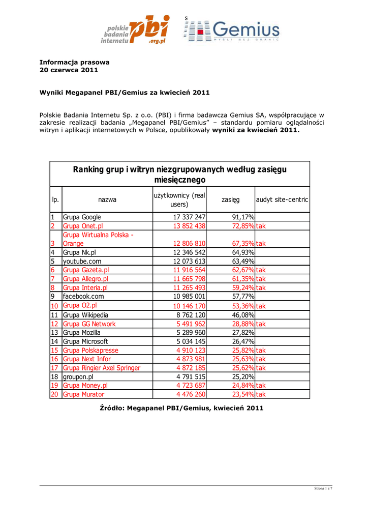 s Informacja prasowa 20 czerwca 2011 Wyniki Megapanel PBI/Gemius za kwiecień 2011 Polskie Badania Internetu Sp. z o.o. (PBI) i firma badawcza Gemius SA, współpracujące w zakresie realizacji badania „Megapanel PBI/Gemius” – standardu pomiaru oglądalności witryn i aplikacji internetowych w Polsce, opublikowały wyniki za kwiecień 2011. Ranking grup i witryn niezgrupowanych według zasięgu miesięcznego lp. 1 2 3 4 5 6 7 8 9 10 11 12 13 14 15 16 17 18 19 20 nazwa Grupa Google Grupa Onet.pl Grupa Wirtualna Polska Orange Grupa Nk.pl youtube.com Grupa Gazeta.pl Grupa Allegro.pl Grupa Interia.pl facebook.com Grupa O2.pl Grupa Wikipedia Grupa GG Network Grupa Mozilla Grupa Microsoft Grupa Polskapresse Grupa Next Infor Grupa Ringier Axel Springer groupon.pl Grupa Money.pl Grupa Murator uŜytkownicy (real users) zasięg audyt site-centric 17 337 247 13 852 438 91,17% 72,85% tak 12 806 810 12 346 542 12 073 613 11 916 564 11 665 798 11 265 493 10 985 001 10 146 170 8 762 120 5 491 962 5 289 960 5 034 145 4 910 123 4 873 981 4 872 185 4 791 515 4 723 687 4 476 260 67,35% tak 64,93% 63,49% 62,67% tak 61,35% tak 59,24% tak 57,77% 53,36% tak 46,08% 28,88% tak 27,82% 26,47% 25,82% tak 25,63% tak 25,62% tak 25,20% 24,84% tak 23,54% tak Źródło: Megapanel PBI/Gemius, kwiecień 2011 Strona 1 z 7 s Ranking domen według zasięgu miesięcznego lp. nazw a 1 google.pl 2 onet.pl nk.pl youtube.com allegro.pl google.com w p.pl facebook.com w ikipedia.org gazeta.pl interia.pl chomikuj.pl mozilla.com zumi.pl groupon.pl w rzuta.pl o2.pl ceneo.pl blogspot.com blox.pl 3 4 5 6 7 8 9 10 11 12 13 14 15 16 17 18 19 20 uŜytkow nicy (real zasięg users) 16 576 487 12 12 12 11 11 11 10 8 8 7 5 5 4 4 4 4 4 4 4 344 333 073 115 028 012 985 687 271 734 063 046 877 791 536 315 286 236 227 341 373 613 397 419 522 001 673 694 658 658 525 467 515 096 640 902 872 472 audyt sitecentric 87,17% 64,92% 64,86% 63,49% 58,45% 58,00% 57,91% 57,77% 45,69% 43,50% 40,67% 26,63% 26,54% 25,65% 25,20% 23,85% 22,69% 22,54% 22,28% 22,23% tak tak tak tak tak tak tak tak tak tak tak Źródło: Megapanel PBI/Gemius, kwiecień 2011 Ranking grup witryn i witryn niezgrupowanych objętych audytem site-centric według miesięcznej liczby odsłon krajowych witryny objęte odsłony krajowe lp. nazwa uŜytkownicy (real users) audytem siteogółem centric 1 Grupa Allegro.pl 4 995 666 337 11 665 798 tak 2 Grupa Onet.pl 2 828 884 710 13 852 438 tak Grupa Wirtualna Polska 3 Orange 2 292 548 624 12 806 810 tak 4 Grupa Gazeta.pl 1 106 664 114 11 916 564 tak 5 Grupa Interia.pl 1 080 804 766 11 265 493 tak 6 Grupa O2.pl 1 025 296 083 10 146 170 tak 7 Grupa Spolecznosci.pl 705 446 978 3 955 492 tak 8 Grupa Spilgames 266 672 825 2 946 498 tak 9 filmweb.pl 160 708 356 3 037 213 tak 10 Grupa GG Network 150 853 055 5 491 962 tak Źródło: Megapanel PBI/Gemius, kwiecień 2011 Strona 2 z 7 s Ranking grup witryn i witryn niezgrupowanych objętych audytem site-centric według miesięcznego czasu lp. 1 2 3 4 5 6 7 8 9 10 11 12 13 14 15 16 17 18 19 20 nazwa czas [godz] Grupa Onet.pl Grupa W irtualna Polska Orange Grupa Allegro.pl Grupa Interia.pl Grupa O2.pl Grupa Gazeta.pl Grupa Spolecznosci.pl Grupa GG Network Grupa Spilgames Grupa Murator Grupa Eurozet wyspagier.pl Grupa TVN joemonster.org Grupa Polskapresse Grupa Targeo.pl filmweb.pl jakdojade.pl nokaut.pl poszkole.pl średni czas na uŜytkownika [godz:min:s] 71 392 810 05:09:14 68 52 38 27 25 8 8 6 6 3 3 2 1 1 1 1 1 1 1 05:21:48 04:29:27 03:27:39 02:43:49 02:07:18 02:16:28 01:36:36 02:20:10 01:30:17 04:41:57 01:43:19 00:52:11 01:21:38 00:20:32 01:10:02 00:29:21 02:55:28 00:27:40 01:13:01 687 387 987 700 282 997 842 883 734 162 028 293 930 680 672 486 277 212 126 800 561 654 770 600 077 189 700 914 239 306 764 327 806 926 120 754 577 256 uŜytkownicy (real users) audyt site-centric 13 852 438 tak 12 11 11 10 11 3 5 2 4 1 2 1 4 1 3 2 806 665 265 146 916 955 491 946 476 672 758 637 418 910 433 037 436 629 925 810 798 493 170 564 492 962 498 260 943 585 747 908 123 100 213 910 602 538 tak tak tak tak tak tak tak tak tak tak tak tak tak tak tak tak tak tak tak Źródło: Megapanel PBI/Gemius, kwiecień 2011 Strona 3 z 7 s Ranking grup witryn i witryn niezgrupowanych objętych audytem site-centric według zasięgu lp. nazw a zasięg uŜytkow nicy (real audyt siteusers) centric 1 2 3 4 5 6 7 8 9 10 11 12 13 14 15 16 17 18 19 20 Grupa Onet.pl Grupa W irtualna Polska Orange Grupa Gazeta.pl Grupa Allegro.pl Grupa Interia.pl Grupa O2.pl Grupa GG Netw ork Grupa Polskapresse Grupa Next Infor Grupa Ringier Axel Springer Grupa Money.pl Grupa Murator Grupa Spolecznosci.pl dobreprogramy.pl Grupa Panorama Firm filmw eb.pl Grupa Spilgames Grupa Pkt.pl Grupa Edipresse.pl Grupa TVN 72,85% 13 852 438 tak 67,35% 12 806 810 tak 62,67% 11 916 564 tak 61,35% 59,24% 53,36% 28,88% 25,82% 25,63% 11 11 10 5 4 4 665 265 146 491 910 873 798 493 170 962 123 981 tak tak tak tak tak tak 25,62% 24,84% 23,54% 20,80% 19,71% 19,24% 15,97% 15,49% 14,80% 14,30% 13,87% 4 4 4 3 3 3 3 2 2 2 2 872 723 476 955 747 659 037 946 815 718 637 185 687 260 492 206 441 213 498 085 702 747 tak tak tak tak tak tak tak tak tak tak tak Źródło: Megapanel PBI/Gemius, kwiecień 2011 Strona 4 z 7 s Ranking aplikacji według zasięgu miesięcznego* lp. 1 2 3 4 5 6 7 nazwa Komunikator Gadu-Gadu Komunikator Skype W indows Media Player W inamp Ipla OpenFM RealPlayer Komunikator W indows Live 8 Messenger 9 VLC media player 10 Aplikacja Google Desktop 11 Komunikator Tlen.pl 12 iTunes 13 Komunikator AQQ 14 BestPlayer 15 QuickTime 16 Google Earth 17 AIMP 18 KMplayer 19 Czytnik RSS Paseczek 20 Czytnik RSS Pasek TVN24 aktywne aplikacje* audyt site-centric zasięg 34,78% 22,94% 21,70% 11,85% 10,73% 4,85% 3,16% 6 4 4 2 2 614 361 127 253 039 922 601 524 tak 636 295 482 685 286 793 2,19% 2,17% 416 922 412 413 2,04% 1,84% 0,85% 0,81% 0,80% 0,75% 0,72% 0,57% 0,46% 0,38% 0,30% 388 349 161 154 151 141 136 108 87 72 57 751 876 tak 492 594 313 752 925 788 638 410 453 Źródło: Megap