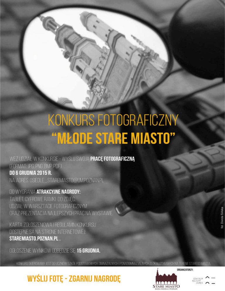 Konkurs fotograficzny “MŁODE STARE MIASTO” Weź udział w konkursie - wyślij swoją pracę fotograficzną (format: jpg, png ,bmp, pdf) do 6 grudnia 2015 R. na adres: [email protected] fot. Dorota Sińska Do wygrania atrakcyjne nagrody: tablet, cyfrowe ramki do zdjęć, udział w warsztacie fotograficznym oraz prezentacja najlepszych prac na wystawie. Karta zgłoszeniowa i regulamin konkursu dostępne są nA STRONIE INTERNETOWEJ: staremiasto.poznan.pl . Ogłoszenie wyników odbędzie się 15 grudnia. Konkurs skierowany jest do uczniów szkół podstawowych, gimnazalnych i ponadgimnazjalinych zlokalizowanych na terenie Starego Miasta. Organizatorzy: wyślij fotę - zgarnij nagrodę