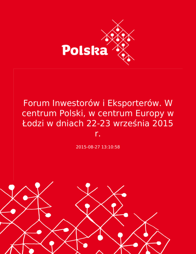 Forum Inwestorów i Eksporterów. W centrum Polski, w centrum Europy w Łodzi w dniach 22-23 września 2015 r. 2015-08-27 13:10:58 2 Forum inwestorów i eksporterów. W centrum Polski, w centrum Europy odbędzie się w dniach 22-23 września 2015 r. w Łodzi. Szczegółowe informacje oraz rejestracja on line dostępne na stronie internetowej: www.fiie2015.pl Udział w wydarzeniu jest bezpłatny. Forum inwestorów i eksporterów. W centrum Polski, w centrum Europy odbędzie się w dniach 22-23 września 2015 r. w Łodzi. Szczegółowe informacje oraz rejestracja on line dostępne na stronie internetowej: www.fiie2015.pl Udział w wydarzeniu jest bezpłatny. 3