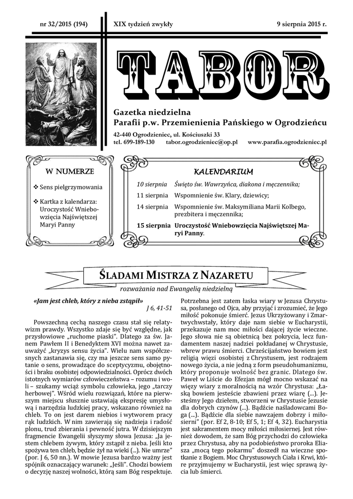 nr 32/2015 (194) XIX tydzień zwykły 9 sierpnia 2015 r. Gazetka niedzielna Parafii p.w. Przemienienia Pańskiego w Ogrodzieńcu 42-440 Ogrodzieniec, ul. Kościuszki 33 tel. 699-189-130 [email protected] KALENDARIUM W numerze Sens pielgrzymowania Kartka z kalendarza: Uroczystość Wniebowzięcia Najświętszej Maryi Panny www.parafia.ogrodzieniec.pl 10 sierpnia Święto św. Wawrzyńca, diakona i męczennika; 11 sierpnia Wspomnienie św. Klary, dziewicy; 14 sierpnia Wspomnienie św. Maksymiliana Marii Kolbego, prezbitera i męczennika; 15 sierpnia Uroczystość Wniebowzięcia Najświętszej Maryi Panny. ŚLADAMI MISTRZA Z NAZARETU rozważania nad Ewangelią niedzielną «Jam jest chleb, który z nieba zstąpił» J 6, 41-51 Powszechną cechą naszego czasu stał się relatywizm prawdy. Wszystko zdaje się być względne, jak przysłowiowe „ruchome piaski”. Dlatego za św. Janem Pawłem II i Benedyktem XVI można nawet zauważyć „kryzys sensu życia”. Wielu nam współczesnych zastanawia się, czy ma jeszcze sens samo pytanie o sens, prowadzące do sceptycyzmu, obojętności i braku osobistej odpowiedzialności. Oprócz dwóch istotnych wymiarów człowieczeństwa – rozumu i woli – szukamy wciąż symbolu człowieka, jego „tarczy herbowej”. Wśród wielu rozwiązań, które na pierwszym miejscu słusznie ustawiają ekspresję umysłową i narzędzia ludzkiej pracy, wskazano również na chleb. To on jest darem niebios i wytworem pracy rąk ludzkich. W nim zawierają się nadzieja i radość plonu, trud zbierania i pewność jutra. W dzisiejszym fragmencie Ewangelii słyszymy słowa Jezusa: „Ja jestem chlebem żywym, który zstąpił z nieba. Jeśli kto spożywa ten chleb, będzie żył na wieki (...). Nie umrze” (por. J 6, 50 nn.). W mowie Jezusa bardzo ważny jest spójnik oznaczający warunek: „Jeśli”. Chodzi bowiem o decyzję naszej wolności, którą sam Bóg respektuje. Potrzebna jest zatem łaska wiary w Jezusa Chrystusa, posłanego od Ojca, aby przyjąć i zrozumieć, że Jego miłość pokonuje śmierć. Jezus Ukrzyżowany i Zmartwychwstały, który daje nam siebie w Eucharystii, przekazuje nam moc miłości dającej życie wieczne. Jego słowa nie są obietnicą bez pokrycia, lecz fundamentem naszej nadziei pokładanej w Chrystusie, wbrew prawu śmierci. Chrześcijaństwo bowiem jest religią więzi osobistej z Chrystusem, jest rodzajem nowego życia, a nie jedną z form pseudohumanizmu, który proponuje wolność bez granic. Dlatego św. Paweł w Liście do Efezjan mógł mocno wskazać na więzy wiary z moralnością na wzór Chrystusa: „Łaską bowiem jesteście zbawieni przez wiarę (...). Jesteśmy Jego dziełem, stworzeni w Chrystusie Jezusie dla dobrych czynów (...). Bądźcie naśladowcami Boga (...). Bądźcie dla siebie nawzajem dobrzy i miłosierni” (por. Ef 2, 8-10; Ef 5, 1; Ef 4, 32). Eucharystia jest sakramentem mocy miłości miłosiernej. Jest również dowodem, że sam Bóg przychodzi do człowieka przez Chrystusa, aby na podobieństwo proroka Eliasza „mocą tego pokarmu” doszedł na wieczne spotkanie z Bogiem. Moc Chrystusowych Ciała i Krwi, które przyjmujemy w Eucharystii, jest więc sprawą życia lub śmierci. J Sens pielgrzymowania uż jutro, tj. w poniedziałek 10 sierpnia, z naszej parafii wyruszy pielgrzymka na pielgrzymi szlak grupa pątników, by po czterech dniach wędrówki pokłonić się Pani Jasnogórskiej. Marsz na Częstochowę rozpoczną od Mszy w Sanktuarium Matki Bożej Skałkowej w Podzamczu. Wcześniej do Podzamcza wkroczą pielgrzymi zmierzający z Olkusza. Ziemia polska od Tatr po Bałtyk, od Odry po Bug rok w rok, szczególnie w miesiącu sierpniu, wygląda jak wielkie mrowisko. Ludzie wędrują w różne strony. Wydawałoby się, że bez składu i ładu, chaotycznie, a więc bez sensu. Uważniejsze przyglądnięcie się temu ruchowi pozwala dostrzec, że jest on uporządkowany i sensowny. W gromadzie albo pojedynczo ludzie w różnym wieku, od niemowląt po starców, rozmaitych zawodów, zdrowi, a także kalecy zmierzają do tych samych punktów rozsianych po kraju. Są to albo Częstochowa, albo Kalwaria Pacławska lub Zebrzydowska, albo Kodeń, albo Licheń czy Święta Lipka... a w nich sanktuaria. Polska bogata jest w święte miejsca. Miejsca, w których Bóg w sposób szczególnie hojny obdziela łaskami. Można powiedzieć, że Polskę oplata sieć pątniczych szlaków krzyżujących się i powiązanych ze sobą węzełkami sanktuariów. Powinniśmy być Bogu za to wdzięczni. Wdzięczność tę można wyrazić, nawiedzając święte miejsca, a jeszcze bardziej – przyjmując w nich to wszystko, co w nich Bóg dla nas przygotował. Rozmaicie – uczy Kościół – można włączyć się w Rok Jubileuszowy, by otrzymać od Boga związane z nim łaski. Pielgrzymka jest jednym z tych sposobów. Od razu trzeba powiedzieć, że wbrew obiegowym mniemaniom nie jest to wcale łatwy i przyjemny sposób duchowej aktywności. Wręcz przeciwnie! Dlaczego? Pielgrzymowanie wymaga wyrzeczeń. Zatem pielgrzymować mogą tylko ci, którzy się ich nie boją, posiedli już tę sztukę albo chcą ją nabyć. 0 jakie wyrzeczenia chodzi? Te wynikające z codziennego życia, związane z tym, czego człowiek aktualnie doświadcza. Okazji do ich podejmowania jest mnóstwo. Podczas pielgrzymki takimi wyrzeczeniami jest trud pieszego wędrowania, bez narzekania na pogodę, ciche i cierpliwe znoszenie otarć, bólu nóg, piekących pęcherzy na stopach, zadawalanie się prostym i skromnym posiłkiem, znoszenie pragnienia, zgoda na przepocone ubranie, nocleg w rozmaitych, nierzadko prymitywnych, warunkach, chrapanie sąsiadów, mycie się w zimnej wodzie. To także otwarcie na ludzi o różnych temperamentach, nastrojach, usposobieniach, dziwactwach w zachowaniu, poglądach... Podporządkowanie się rygorowi wspólnego pielgrzymowania, posłuch wobec przewodnika, porządkowych, kapłanów... Aktywność we wspólnych pr