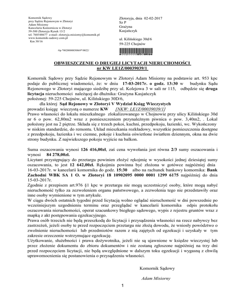 Komornik Sądowy przy Sądzie Rejonowym w Złotoryi Adam Misiorny Kancelaria Komornicza w Złotoryi 59-500 Złotoryja Rynek 13/2 tel. 768548677 e-mail: [email protected] www.komornik-sadowy.com.pl Km 30/16 #ip *0020000850869*/0022/ Złotoryja, dnia 02-02-2017 Sz P Grażyna Kasjańczyk ul. Kilińskiego 30d/6 59-225 Chojnów *0020000850869* OBWIESZCZENIE O DRUGIEJ LICYTACJI NIERUCHOMOŚCI nr KW LE1Z/00039039/1 Komornik Sądowy przy Sądzie Rejonowym w Złotoryi Adam Misiorny na podstawie art. 953 kpc podaje do publicznej wiadomości, że: w dniu 17-03-2017r. o godz. 13:30 w budynku Sądu Rejonowego w Złotoryi mającego siedzibę przy ul. Kolejowa 3 w sali nr 115, odbędzie się druga licytacja nieruchomości należącej do dłużnika: Grażyna Kasjańczyk położonej: 59-225 Chojnów, ul. Kilińskiego 30D/6, dla której Sąd Rejonowy w Złotoryi V Wydział Ksiąg Wieczystych prowadzi księgę wieczystą o numerze KW [NKW: LE1Z/00039039/1] Prawo własności do lokalu mieszkalnego zlokalizowanego w Chojnowie przy ulicy Kilińskiego 30d nr 6 o pow. 62,80m2 wraz z pomieszczeniem przynależnym piwnica o pow. 3,40m2, . Lokal położony jest na 2 piętrze. Składa się z trzech pokoi, kuchni, przedpokoju, łazienki, wc. Wykończony w niskim standardzie, do remontu. Układ mieszkania rozkładowy, wszystkie pomieszczenia dostępne z przedpokoju, łazienka i wc ciemne, pokoje i kuchnia oświetlone światłem dziennym, okna na dwie strony budynku. Z najwiekszego pokoju wyjście na balkon. Suma oszacowania wynosi 126 416,00zł, zaś cena wywołania jest równa 2/3 sumy oszacowania i wynosi 84 278,00zł. Licytant przystępujący do przetargu powinien złożyć rękojmię w wysokości jednej dziesiątej sumy oszacowania, to jest 12 642,00zł. Rękojmia powinna być złożona w gotówce najpóżniej dnia 16-03-2017r. w kancelarii komornika do godz. 15:30 albo na rachunek bankowy komornika: Bank Zachodni WBK SA 1 O. w Złotoryi 18 10902095 0000 0001 1299 6175 najpóźniej do dnia 15-03-2017r. Zgodnie z przepisem art.976 §1 kpc w przetargu nie mogą uczestniczyć osoby, które mogą nabyć nieruchomość tylko za zezwoleniem organu państwowego, a zezwolenia tego nie przedstawiły oraz inne osoby wymienione w tym artykule. W ciągu dwóch ostatnich tygodni przed licytacją wolno oglądać nieruchomość w dni powszednie po wcześniejszym uzgodnieniu terminu oraz przeglądać w kancelarii komornika odpis protokołu oszacowania nieruchomości, operat szacunkowy biegłego sądowego, wypis z rejestru gruntów wraz z mapką z akt postępowania egzekucyjnego. Prawa osób trzecich nie będą przeszkodą do licytacji i przysądzenia własności na rzecz nabywcy bez zastrzeżeń, jeżeli osoby te przed rozpoczęciem przetargu nie złożą dowodu, że wniosły powództwo o zwolnienie nieruchomości lub przedmiotów razem z nią zajętych od egzekucji i uzyskały w tym zakresie orzeczenie wstrzymujące egzekucję. Użytkowanie, służebności i prawa dożywotnika, jeżeli nie są ujawnione w księdze wieczystej lub przez złożenie dokumentu do zbioru dokumentów i nie zostaną zgłoszone najpóźniej na trzy dni przed rozpoczęciem licytacji, nie będą uwzględnione w dalszym toku egzekucji i wygasną z chwilą uprawomocnienia się postanowienia o przysądzeniu własności. Komornik Sądowy Adam Misiorny 1 2
