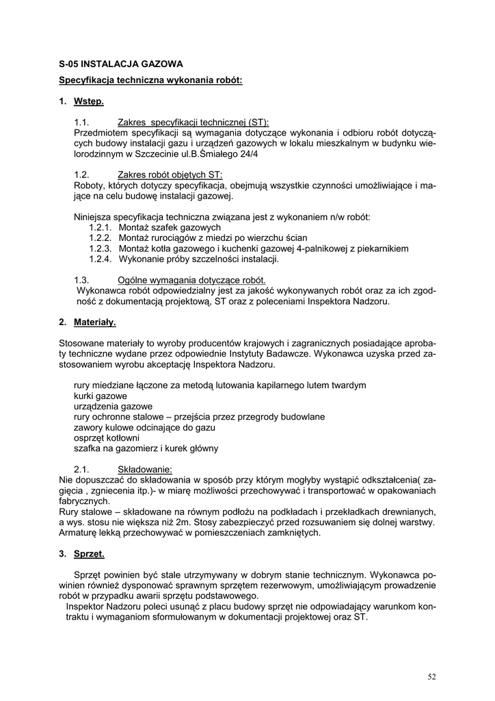 S-05 INSTALACJA GAZOWA Specyfikacja techniczna wykonania robót: 1. Wstęp. 1.1. Zakres specyfikacji technicznej (ST): Przedmiotem specyfikacji są wymagania dotyczące wykonania i odbioru robót dotyczących budowy instalacji gazu i urządzeń gazowych w lokalu mieszkalnym w budynku wielorodzinnym w Szczecinie ul.B.Śmiałego 24/4 1.2. Zakres robót objętych ST: Roboty, których dotyczy specyfikacja, obejmują wszystkie czynności umoŜliwiające i mające na celu budowę instalacji gazowej. Niniejsza specyfikacja techniczna związana jest z wykonaniem n/w robót: 1.2.1. MontaŜ szafek gazowych 1.2.2. MontaŜ rurociągów z miedzi po wierzchu ścian 1.2.3. MontaŜ kotła gazowego i kuchenki gazowej 4-palnikowej z piekarnikiem 1.2.4. Wykonanie próby szczelności instalacji. 1.3. Ogólne wymagania dotyczące robót. Wykonawca robót odpowiedzialny jest za jakość wykonywanych robót oraz za ich zgodność z dokumentacją projektową, ST oraz z poleceniami Inspektora Nadzoru. 2. Materiały. Stosowane materiały to wyroby producentów krajowych i zagranicznych posiadające aprobaty techniczne wydane przez odpowiednie Instytuty Badawcze. Wykonawca uzyska przed zastosowaniem wyrobu akceptację Inspektora Nadzoru. rury miedziane łączone za metodą lutowania kapilarnego lutem twardym kurki gazowe urządzenia gazowe rury ochronne stalowe – przejścia przez przegrody budowlane zawory kulowe odcinające do gazu osprzęt kotłowni szafka na gazomierz i kurek główny 2.1. Składowanie: Nie dopuszczać do składowania w sposób przy którym mogłyby wystąpić odkształcenia( zagięcia , zgniecenia itp.)- w miarę moŜliwości przechowywać i transportować w opakowaniach fabrycznych. Rury stalowe – składowane na równym podłoŜu na podkładach i przekładkach drewnianych, a wys. stosu nie większa niŜ 2m. Stosy zabezpieczyć przed rozsuwaniem się dolnej warstwy. Armaturę lekką przechowywać w pomieszczeniach zamkniętych. 3. Sprzęt. Sprzęt powinien być stale utrzymywany w dobrym stanie technicznym. Wykonawca powinien równieŜ dysponować sprawnym sprzętem rezerwowym, umoŜliwiającym prowadzenie robót w przypadku awarii sprzętu podstawowego. Inspektor Nadzoru poleci usunąć z placu budowy sprzęt nie odpowiadający warunkom kontraktu i wymaganiom sformułowanym w dokumentacji projektowej oraz ST. 52 4. Transport: Wykonawca jest zobowiązany do uŜywania pojazdów o odpowiedniej długości, tak by wolne końce wystające poza skrzynię ładunkową nie były dłuŜsze niŜ jeden metr. Przewóz rur wykonywany samochodami skrzyniowymi. Wysokość ładunku na samochodzie nie powinna przekraczać 1 m. 5. Wykonanie robót. 5.1. Rozpoczęcie robót. Przed rozpoczęciem montaŜu instalacji kierownik robót powinien stwierdzić , Ŝe: -obiekt odpowiada warunkom zgodnym z przepisami bezpieczeństwa pracy do prowadzenia robót instalacyjnych -elementy budowlano-konstrukcyjne, mające wpływ na montaŜ instalacji gazowej, odpowiadają załoŜeniom projektowym. 5.2. Roboty montaŜowe. 5.2.1. Prowadzenie przewodów: Projektowaną wewnętrzną instalację gazu wykonać z rur miedzianych posiadających aprobatę IGNiG w Krakowie potwierdzoną deklaracją zgodności z aprobata techniczną przez producenta, łączonych za metodą lutowania kapilarnego lutem twardym. Przejścia przewodów gazowych przez przegrody konstrukcyjne prowadzić w rurach ochronnych . Są to krótkie odcinki rur stalowych , osadzone na zaprawie cementowej w ścianie lub stropie. Przestrzeń między rurą ochronną a przewodową naleŜy wypełnić pianką poliuretanową. 5.2.2. MontaŜ przewodów gazowych.: Instalację gazową prowadzić po wierzchu ścian, stosując mocowanie poprzez uchwyty dystansowe. Przy przejściach przez ściany stosować stalowe tuleje ochronne. Instalację prowadzić powyŜej przewodów elektrycznych. Rozmieszczenie uchwytów: • dla rur φ12 odległość między uchwytami 1,25m • dla rur φ15 odległość między uchwytami 1,25m • dla rur φ18 odległość między uchwytami 1,5m • dla rur φ22 odległość między uchwytami 2m • dla rur φ28 odległość między uchwytami 2,25m Montując przewody wykonać punkty stałe za pomocą nakładek ustalających połoŜenie nieprzesuwne przewodu w uchwycie mocującym ( przylutować tuleję z mosiądzu po obu stronach uchwytu). Na odcinkach poziomych instalacji zachować minimalny spadek 0,4% w kierunku urządzeń gazowych. Przed kotłem gazowym oraz kuchenką gazową czteropalnikowa z piekarnikiem w miejscu łatwo dostępnym naleŜy zamontować kurki odcinające ( zawory kulowe) posiadający atest IGNiG w Krakowie. Odprowadzenie spalin- do istniejącego komina wentylacyjnego – zgodnie z opinią kominiarską. Prawidłowość wykonania podłączenia przewodu spalinowego oraz działania wentylacji nawiewno-wywiewnej winna być poświadczona przez uprawnionego kominiarza. Po wykonaniu instalacji gazowej dokonać próby ciśnieniowej na 0,21 MPa przy pomocy spręŜonego powietrza w ciągu 4 godzin. Wynik uwaŜa się za pozytywny jeśli manometr nie wykaŜe spadku ciśnienia. Po zmontowaniu instalacji i przeprowadzeniu próby ciśnienia zgłosić do obioru w Zakładzie Gazowniczym. 53 5.2.3. Podłączenie urządzeń gazowych. Urządzenia gazowe podłączyć na stałe z przewodami instalacji gazowej za pomocą stałego przewodu, kurka gazowego , dwuzłączki lub atestowanego przewodu elastycznego. Kurki odcinające dopływ gazu do urządzenia umieścić w miejscu łatwo dostępnym. Podłączenie i montaŜ urządzeń wg instrukcji. Obowiązkiem wykonawcy jest sprawdzenie, czy maja one kompletne wyposaŜenie i fabryczną instrukcję uŜytkowania w języku polskim. DuŜe znaczenie ma prawidłowe połączenie rur spalinowych z kanałem spalinowym. Urządzenia gazowe ustawić w pobliŜu tych kanałów tak, aby łączna długość rur spalinowych nie przekraczała 3m. Pionowy odcinek rury nad urządzeniem powinien mieć długość co najmniej 22cm. Odcinek