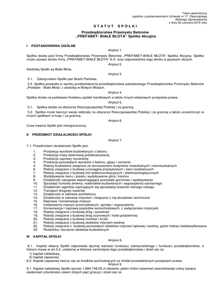 STATUT Tekst ujednolicony zgodnie z postanowieniami Uchwały nr 17 Zwyczajnego Walnego Zgromadzenia z dnia 26 czerwca 2015 roku SPÓŁKI Przedsiębiorstwa Przemysłu Betonów „PREFABET- BIAŁE BŁOTA” Spółka Akcyjna I POSTANOWIENIA OGÓLNE Artykuł 1. Spółka działa pod firmą Przedsiębiorstwo Przemysłu Betonów „PREFABET-BIAŁE BŁOTA” Spółka Akcyjna. Spółka może używać skrótu firmy „PREFABET-BIAŁE BŁOTA” S.A. oraz odpowiednika tego skrótu w językach obcych. Artykuł 2. Siedzibą Spółki są Białe Błota. Artykuł 3. 3.1. Założycielem Spółki jest Skarb Państwa. 3.2. Spółka powstała w wyniku przekształcenia przedsiębiorstwa państwowego Przedsiębiorstwo Przemysłu Betonów „Prefabet - Białe Błota” z siedzibą w Białych Błotach. Artykuł 4. Spółka działa na podstawie Kodeksu spółek handlowych a także innych właściwych przepisów prawa. Artykuł 5. 5.1. Spółka działa na obszarze Rzeczypospolitej Polskiej i za granicą. 5.2. Spółka może tworzyć swoje oddziały na obszarze Rzeczypospolitej Polskiej i za granicą a także uczestniczyć w innych spółkach w kraju i za granicą. Artykuł 6. Czas trwania Spółki jest nieograniczony. II PRZEDMIOT DZIAŁALNOŚCI SPÓŁKI Artykuł 7. 7.1. Przedmiotem działalności Spółki jest: 1. 2. 3. 4. 5. 6. 7. 8. 9. 10. 11. 12. 13. 14. 15. 16. 17. 18. 19. 20. 21. 22. 23. III Produkcja wyrobów budowlanych z betonu Produkcja masy betonowej prefabrykowanej Produkcja zaprawy murarskiej Produkcja pozostałych wyrobów z betonu, gipsu i cementu Roboty budowlane związane ze wznoszeniem budynków mieszkalnych i niemieszkalnych Roboty związane z budową rurociągów przesyłowych i sieci rozdzielczych Roboty związane z budową linii telekomunikacyjnych i elektroenergetycznych Wydobywanie żwiru i piasku; wydobywanie gliny i kaolinu Działalność usługowa wspomagająca pozostałe górnictwo i wydobywanie Sprzedaż hurtowa drewna, materiałów budowlanych i wyposażenia sanitarnego Działalność agentów zajmujących się sprzedażą towarów różnego rodzaju Transport drogowy towarów Działalność w zakresie architektury Działalność w zakresie inżynierii i związane z nią doradztwo techniczne Naprawa i konserwacja maszyn Instalowanie maszyn przemysłowych, sprzętu i wyposażenia Konserwacja i naprawa pojazdów samochodowych, z wyłączeniem motocykli Roboty związane z budową dróg i autostrad Roboty związane z budową dróg szynowych i kolei podziemnej Roboty związane z budową mostów i tuneli Roboty związane z budową obiektów inżynierii wodnej Roboty związane z budową pozostałych obiektów inżynierii lądowej i wodnej, gdzie indziej niesklasyfikowane Rozbiórka i burzenie obiektów budowlanych KAPITAŁ SPÓŁKI Artykuł 8. 8.1. Kapitał własny Spółki odpowiada łącznej wartości funduszu założycielskiego i funduszu przedsiębiorstwa, o którym mowa w art.3.2, ustalonej w bilansie zamknięcia tego przedsiębiorstwa i dzieli się na: 1) kapitał zakładowy, 2) kapitał zapasowy. 8.2. Kapitał zapasowy tworzy się ze środków pochodzących ze źródeł przewidzianych przepisami prawa Artykuł 9. 9.1. Kapitał zakładowy Spółki wynosi 1.884.748,05 zł (słownie: jeden milion osiemset osiemdziesiąt cztery tysiące siedemset czterdzieści osiem złotych pięć groszy) i dzieli się na: 2 a) 622.393 (słownie: sześćset dwadzieścia dwa tysiące trzysta dziewięćdziesiąt trzy) akcje na okaziciela serii A o wartości nominalnej 2,15 zł (słownie: dwa złote piętnaście groszy) każda, b) 254.234 (słownie: dwieście pięćdziesiąt cztery tysiące dwieście trzydzieści cztery ) akcje na okaziciela serii B o wartości nominalnej 2,15 zł (słownie: dwa złote piętnaście groszy) każda. 9.2. Wszystkie akcje wyemitowane z chwilą przekształcenia przedsiębiorstwa, o którym mowa w art. 3.2., oznaczone są jako akcje serii A, natomiast kolejne emisje akcji oznaczone będą kolejnymi literami alfabetu. .Artykuł 10. Wszystkie akcje Spółki są akcjami zwykłymi na okaziciela. Artykuł 10a. Akcje Spółki mogą być umarzane za zgodą akcjonariusza w drodze ich nabycia przez Spółkę (umorzenie dobrowolne). IV WŁADZE SPÓŁKI Artykuł 11. Władzami Spółki są: A. Zarząd B. Rada Nadzorcza C. Walne Zgromadzenie A. ZARZĄD Artykuł 12. 12.1. 12.2. 12.3. 12.4. Zarząd składa się z dwóch do pięciu osób. Kadencja Zarządu trwa trzy lata. Rada Nadzorcza powołuje prezesa Zarządu oraz członków Zarządu. Rada Nadzorcza określi liczbę członków Zarządu. Rada Nadzorcza może odwołać prezesa Zarządu, członka Zarządu lub cały Zarząd przed upływem kadencji Zarządu. Artykuł 13. 13.1. Zarząd wykonuje wszelkie uprawnienia w zakresie zarządzania Spółką, z wyjątkiem uprawnień zastrzeżonych przez prawo lub niniejszy statut dla pozostałych władz Spółki. 13.2. Tryb działania Zarządu, a także sprawy, które mogą być powierzone poszczególnym jego członkom, określi szczegółowo regulamin Zarządu. Regulamin Zarządu uchwala Zarząd Spółki, a zatwierdza go Rada Nadzorcza. Artykuł 14. Do składania oświadczeń w imieniu Spółki wymagane jest współdziałanie dwóch członków Zarządu albo jednego członka Zarządu łącznie z prokurentem. Artykuł 15. Rada Nadzorcza zawiera w imieniu Spółki umowy z członkami Zarządu i reprezentuje Spółkę w sporach z członkami Zarządu. Rada Nadzorcza może upoważnić, w drodze uchwały, jednego lub więcej członków do dokonania takich czynności prawnych. B. RADA NADZORCZA Artykuł 16. Rada Nadzorcza składa się z co najmniej pięciu członków powoływanych i odwoływanych przez Walne Zgromadzenie. Kadencja Rady Nadzorczej trwa trzy lata. Artykuł 17. 17.1. Rada Nadzorcza wybiera ze swego grona przewodniczącego, jego zastępcę i sekretarza . 17.2. Przewodniczący Rady Nadzorczej zwołuje posiedzenia Rady i przewodniczy im. Przewodniczący ustępującej Rady Nadzorczej zwołuje i otwiera pie