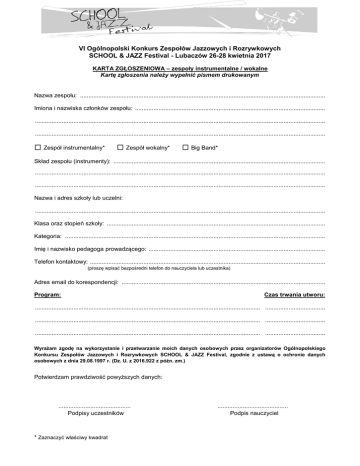VI Ogólnopolski Konkurs Zespołów Jazzowych i Rozrywkowych SCHOOL & JAZZ Festival - Lubaczów 26-28 kwietnia 2017 KARTA ZGŁOSZENIOWA – zespoły instrumentalne / wokalne Kartę zgłoszenia należy wypełnić pismem drukowanym Nazwa zespołu: ................................................................................................................................................... Imiona i nazwiska członków zespołu: .................................................................................................................. .............................................................................................................................................................................. .............................................................................................................................................................................. ☐ Zespół instrumentalny* ☐ Zespół wokalny* ☐ Big Band* Skład zespołu (instrumenty): ............................................................................................................................... .............................................................................................................................................................................. .............................................................................................................................................................................. Nazwa i adres szkoły lub uczelni: .............................................................................................................................................................................. Klasa oraz stopień szkoły: ................................................................................................................................... Kategoria: ............................................................................................................................................................ Imię i nazwisko pedagoga prowadzącego: .......................................................................................................... Telefon kontaktowy: ............................................................................................................................................. (proszę wpisać bezpośredni telefon do nauczyciela lub uczestnika) Adres email do korespondencji: .......................................................................................................................... Program: Czas trwania utworu: ....................................................................................................................................... .................................... ....................................................................................................................................... .................................... ....................................................................................................................................... .................................... Wyrażam zgodę na wykorzystanie i przetwarzanie moich danych osobowych przez organizatorów Ogólnopolskiego Konkursu Zespołów Jazzowych i Rozrywkowych SCHOOL & JAZZ Festival, zgodnie z ustawą o ochronie danych osobowych z dnia 29.08.1997 r. (Dz. U. z 2016.922 z późn. zm.) Potwierdzam prawdziwość powyższych danych: ........................................... Podpisy uczestników * Zaznaczyć właściwy kwadrat .......................................... Podpis nauczyciel