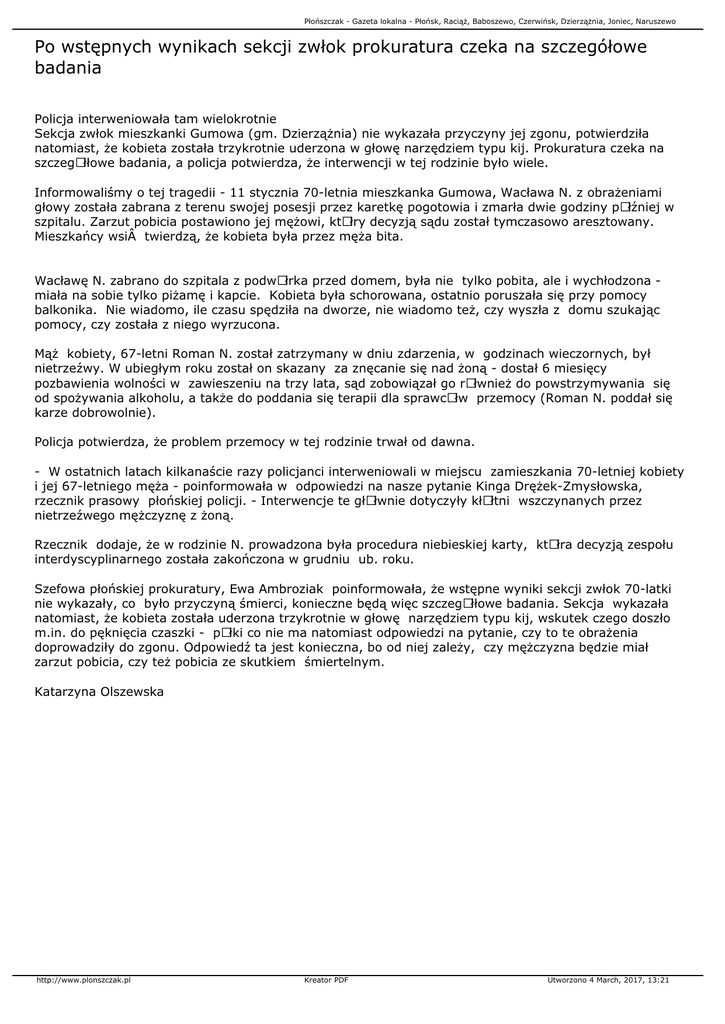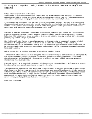 Płońszczak - Gazeta lokalna - Płońsk, Raciąż, Baboszewo, Czerwińsk, Dzierzążnia, Joniec, Naruszewo Po wstępnych wynikach sekcji zwłok prokuratura czeka na szczegółowe badania Policja interweniowała tam wielokrotnie Sekcja zwłok mieszkanki Gumowa (gm. Dzierzążnia) nie wykazała przyczyny jej zgonu, potwierdziła natomiast, że kobieta została trzykrotnie uderzona w głowę narzędziem typu kij. Prokuratura czeka na szczegÃłłowe badania, a policja potwierdza, że interwencji w tej rodzinie było wiele. Informowaliśmy o tej tragedii - 11 stycznia 70-letnia mieszkanka Gumowa, Wacława N. z obrażeniami głowy została zabrana z terenu swojej posesji przez karetkę pogotowia i zmarła dwie godziny pÃłźniej w szpitalu. Zarzut pobicia postawiono jej mężowi, ktÃłry decyzją sądu został tymczasowo aresztowany. Mieszkańcy wsi twierdzą, że kobieta była przez męża bita. Wacławę N. zabrano do szpitala z podwÃłrka przed domem, była nie tylko pobita, ale i wychłodzona miała na sobie tylko piżamę i kapcie. Kobieta była schorowana, ostatnio poruszała się przy pomocy balkonika. Nie wiadomo, ile czasu spędziła na dworze, nie wiadomo też, czy wyszła z domu szukając pomocy, czy została z niego wyrzucona. Mąż kobiety, 67-letni Roman N. został zatrzymany w dniu zdarzenia, w godzinach wieczornych, był nietrzeźwy. W ubiegłym roku został on skazany za znęcanie się nad żoną - dostał 6 miesięcy pozbawienia wolności w zawieszeniu na trzy lata, sąd zobowiązał go rÃłwnież do powstrzymywania się od spożywania alkoholu, a także do poddania się terapii dla sprawcÃłw przemocy (Roman N. poddał się karze dobrowolnie). Policja potwierdza, że problem przemocy w tej rodzinie trwał od dawna. - W ostatnich latach kilkanaście razy policjanci interweniowali w miejscu zamieszkania 70-letniej kobiety i jej 67-letniego męża - poinformowała w odpowiedzi na nasze pytanie Kinga Drężek-Zmysłowska, rzecznik prasowy płońskiej policji. - Interwencje te głÃłwnie dotyczyły kłÃłtni wszczynanych przez nietrzeźwego mężczyznę z żoną. Rzecznik dodaje, że w rodzinie N. prowadzona była procedura niebieskiej karty, ktÃłra decyzją zespołu interdyscyplinarnego została zakończona w grudniu ub. roku. Szefowa płońskiej prokuratury, Ewa Ambroziak poinformowała, że wstępne wyniki sekcji zwłok 70-latki nie wykazały, co było przyczyną śmierci, konieczne będą więc szczegÃłłowe badania. Sekcja wykazała natomiast, że kobieta została uderzona trzykrotnie w głowę narzędziem typu kij, wskutek czego doszło m.in. do pęknięcia czaszki - pÃłki co nie ma natomiast odpowiedzi na pytanie, czy to te obrażenia doprowadziły do zgonu. Odpowiedź ta jest konieczna, bo od niej zależy, czy mężczyzna będzie miał zarzut pobicia, czy też pobicia ze skutkiem śmiertelnym. Katarzyna Olszewska http://www.plonszczak.pl Kreator PDF Utworzono 4 March, 2017, 13:21