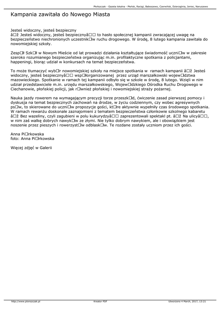 Płońszczak - Gazeta lokalna - Płońsk, Raciąż, Baboszewo, Czerwińsk, Dzierzążnia, Joniec, Naruszewo Kampania zawitała do Nowego Miasta Jesteś widoczny, jesteś bezpieczny „Jesteś widoczny, jesteś bezpieczny― to hasło społecznej kampanii zwracającej uwagę na bezpieczeństwo niechronionych uczestnikÃłw ruchu drogowego. W środę, 8 lutego kampania zawitała do nowomiejskiej szkoły. ZespÃłł SzkÃłł w Nowym Mieście od lat prowadzi działania kształtujące świadomość uczniÃłw w zakresie szeroko rozumianego bezpieczeństwa organizując m.in. profilaktyczne spotkania z policjantami, happeningi, biorąc udział w konkursach na temat bezpieczeństwa. To może tłumaczyć wybÃłr nowomiejskiej szkoły na miejsce spotkania w ramach kampanii „Jesteś widoczny, jesteś bezpieczny― wspÃłłorganizowanej przez urząd marszałkowski wojewÃłdztwa mazowieckiego. Spotkanie w ramach tej kampanii odbyło się w szkole w środę, 8 lutego. Wzięli w nim udział przedstawiciele m.in. urzędu marszałkowskiego, WojewÃłdzkiego Ośrodka Ruchu Drogowego w Ciechanowie, płońskiej policji, jak rÃłwnież płońskiej i nowomiejskiej straży pożarnej. Nauka jazdy rowerem na wymagającym precyzji torze przeszkÃłd, ćwiczenie zasad pierwszej pomocy i dyskusja na temat bezpiecznych zachowań na drodze, w życiu codziennym, czy wobec agresywnych psÃłw, to skierowane do uczniÃłw propozycje gości, ktÃłre aktywnie wypełniły czas środowego spotkania. W ramach rewanżu doskonale zaznajomieni z tematem bezpieczeństwa członkowie szkolnego kabaretu „Bez wazeliny, czyli zagubieni w polu kukurydzy― zaprezentowali spektakl pt. „Na ulicy―, w nim zaś walkę dobrych nawykÃłw ze złymi. Nie tylko dobrym nawykiem, ale i obowiązkiem jest noszenie przez pieszych i rowerzystÃłw odblaskÃłw. Te rozdane zostały uczniom przez ich gości. Anna PiÃłrkowska foto: Anna PiÃłrkowska Więcej zdjęć w Galerii http://www.plonszczak.pl Kreator PDF Utworzono 4 March, 2017, 13:21