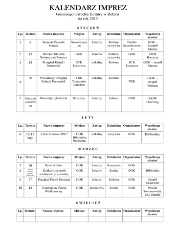 KALENDARZ IMPREZ Gminnego Ośrodka Kultury w Bełżcu na rok 2013 STYCZ E Ń Lp. Termin Nazwa imprezy Miejsce Zasięg Dziedzina Organizator Współorga nizator 1 6 Koncert Zespołu Marase Szczebrzesz yn lokalny Kultura Parafia rozrywka Szczebrzeszy n GOK – Zesdpół Marase 2 13 Wielka Orkiestra Świątecznej Pomocy GOK lokalna Kultura, rozrywka GOK ZMW Harcerze 3 13 Przegląd Kolęd i Pastorałek SCK Tyszowce Lokalny Kultura SCK Tyszowce GOK – zespół Marase 20 Powiatowy Przegląd Kolęd i Pastorałek TDK Tomaszów Lubelski Lokalny Kultura TDK GOK – zespół Marase Warsztaty rękodzieła Brzeziny lokalny 4 5 Styczeń -czerwi ec kultura GOK KGW Brzeziny LUTY Lp. Termin 6 12-15 luty Nazwa imprezy Miejsce Zasięg Dziedzina Organizator Współorga nizator „Ferie Zimowe 2011” GOK Biblioteka Publiczna Lokalny rozrywka Biblioteka GOK MAR Z E C Lp. Termin Nazwa imprezy Miejsce Zasięg Dziedzina Organizator Współorga nizator 7 10 Dzień Kobiet GOK lokalny Rozrywka GOK 8 Termin zostanie podany niebawem Konkurs na stroik wielkanocny i pisankę GOK lokalny Sztuka GOK Biblioteka 9 17 Przegląd Pieśni Pasyjnej GOK lokalny Kultura GOK Zespół MARASE 10 24 Konkurs na Palmę Wielkanocną GOK powiatowy Sztuka GOK Powiat Tomaszowski, UG, Parafia KWIECIEŃ Lp. Termin Nazwa imprezy Miejsce Zasięg Dziedzina Organizator Współorga nizator 11 2 Rocznica śmierci Papieża Jana Pawła II GOK Lokalny Kultura, religia GOK Szkoła, Zespół Marase MAJ Lp. Termin Nazwa imprezy Miejsce Zasięg Dziedzina Organizator 12 Termin zostanie podany niebawem Przegląd Pieśni Maryjnej SCK Tyszowce Lokalny Kultura, religia SCK Tyszowce 13 26 Dzień Matki GOK lokalny rozrywka GOK Współorga nizator Szkoła ZMW CZERWIEC Lp. Termin Nazwa imprezy Miejsce Zasięg Dziedzina Organizator 14 1 Gminne Święto Sportu Stadion Sportowy „Orlik” Gminny Sport Gmina 15 Termin zostanie podany niebawem Wystawa w Cerkwi Galeria Cerkiewka Lokalny Kultura GOK 16 16 Zawody Wędkarskie o Puchar Wójta Zalew „Młynki” Gminny Sport GOK 17 23 Piosenka ku czci Najświętszego Serca Pana Jezusa Kościół w Krynicach lokalny Kultura religia GOK Krynice Współorga nizator GOK szkoła Koło Wędkarskie LIPIEC Lp. Termin Nazwa imprezy Miejsce Zasięg Dziedzina Organizator Współorga nizator Kultura rozrywka Biblioteka 18 1-15 Wakacje dla dzieci GOK lokalny 19 Termin zostanie podany niebawem IV Powiatowa Pielgrzymka Samorządowców Nabróż Sanktuariu m lokalny 20 14 Festiwal Trzech Kultur Bełzka Brama Bełz Ukraina międzynaro dowy GOK GMINA kultura Miasto Bełz Gmina Bełżec SIERPIEŃ Lp. Termin Nazwa imprezy Miejsce Zasięg 21 10,11 Jarmark św. Wawrzyńca stadion 22 24 Dzień Niepodległości Ukrainy Bełz Międzynaro dowy 23 25 Dożynki gminnoparafialne Żyłka lokalny Dziedzina Organizator międzynaro rozrywka dowy rozrywka Współorga nizator GOK UG Urząd Miasta Bełz GOK GOK UG KGW Chyże Sołectwo Chyże WRZESIEŃ Lp. Termin Nazwa imprezy Miejsce Zasięg Dziedzina Organizator Współorga nizator 24 17 Rocznica najazdu wojsk Sowieckich Bełżec I Lokalny Historia UG Kombatanci 25 22 Święto pieczonego ziemniaka – Konkurs na najlepszą potrawę z ziemniaka „Majka”Bełżec lokalny Rozrywka GOK Sołectwo OSP Bełżec II PAŹDZIERNIK Lp. Termin 26 3-14 Nazwa imprezy Miejsce Zasięg Dziedzina Organizator Współorga nizator Konkurs malarski „Inspiracje jesienne" GOK lokalny sztuka GOK Biblioteka LISTOPAD Lp. Termin Nazwa imprezy Miejsce Zasięg Dziedzina Organizator Współorga nizator 27 11 Gminne Obchody Święta Niepodległości GOK Lokalny Historia GOK UG, Szkoły, Parafia 28 17 Przegląd Pieśni Patriotycznej TDK Tomaszów Lubelski Lokalny Kultura TDK GOK, Zespół Marase, 29 24 Pomóż Dzieciom Przetrwać Zimę GOK lokalny Kultura, rozrywka GOK GOPS ZMW GRUDZIEŃ Lp. Termin Nazwa imprezy Miejsce Zasięg Dziedzina Organizator Współorga nizator GOK Biblioteka UG Parafia 30 5-16 Konkurs na kartkę, stroik i szopkę bożonarodzeniową GOK lokalny sztuka Wigilia dla mieszkańców GOK lokalny 31 Termin zostanie podany niebawem Sprawy społeczne Urząd Gminy GOPS, GOK Bełżec