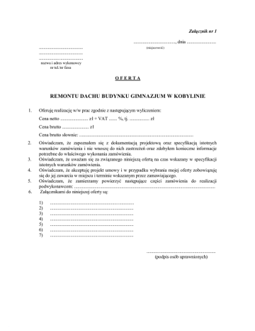 Załącznik nr 1 ....................................., dnia .......................... ....................................... ....................................... ....................................... (miejscowość) nazwa i adres wykonawcy nr tel./nr faxu OFERTA REMONTU DACHU BUDYNKU GIMNAZJUM W KOBYLINIE 1. Oferuję realizację w/w prac zgodnie z następującym wyliczeniem: Cena netto ........................ z ł + VAT ....... %, tj. ................. zł Cena brutto ....................... z ł Cena brutto słownie: .................................................................................................. 2. 3. 4. 5. 6. Oświadczam, że zapoznałem się z dokumentacją projektową oraz specyfikacją istotnych warunków zamówienia i nie wnoszę do nich zastrzeżeń oraz zdobyłem konieczne informacje potrzebne do właściwego wykonania zamówienia. Oświadczam, że uważam się za związanego niniejszą ofertą na czas wskazany w specyfikacji istotnych warunków zamówienia. Oświadczam, że akceptuję projekt umowy i w przypadku wybrania mojej oferty zobowiązuję się do jej zawarcia w miejscu i terminie wskazanym przez zamawiającego. Oświadczam, że zamierzamy powierzyć następujące części zamówienia do realizacji podwykonawcom: ............................................................................................................................. Załącznikami do niniejszej oferty są: 1) 2) 3) 4) 5) 6) 7) .......................................................................... .......................................................................... .......................................................................... .......................................................................... .......................................................................... .......................................................................... .......................................................................... ............................................................. (podpis osób uprawnionych)