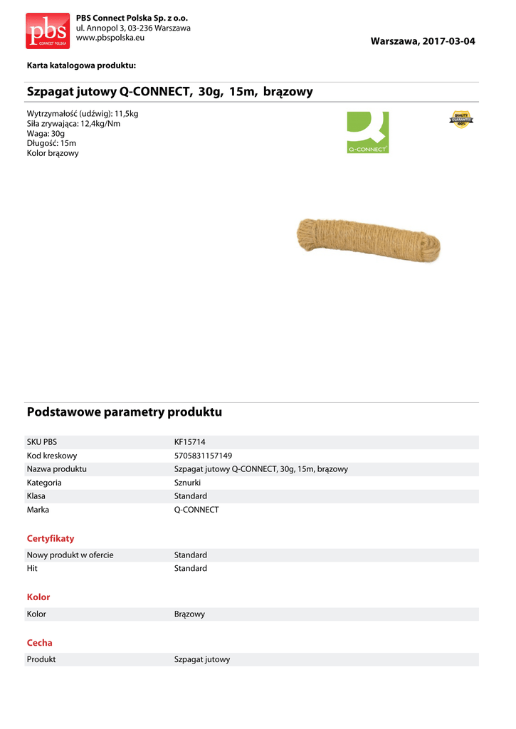PBS Connect Polska Sp. z o.o. ul. Annopol 3, 03-236 Warszawa www.pbspolska.eu Karta katalogowa produktu: Szpagat jutowy Q-CONNECT, 30g, 15m, brązowy Wytrzymałość (udźwig): 11,5kg Siła zrywająca: 12,4kg/Nm Waga: 30g Długość: 15m Kolor brązowy Podstawowe parametry produktu SKU PBS KF15714 Kod kreskowy 5705831157149 Nazwa produktu Szpagat jutowy Q-CONNECT, 30g, 15m, brązowy Kategoria Sznurki Klasa Standard Marka Q-CONNECT Certyfikaty Nowy produkt w ofercie Standard Hit Standard Kolor Kolor Brązowy Cecha Produkt Szpagat jutowy Warszawa, 2017-03-04 PBS Connect Polska Sp. z o.o. ul. Annopol 3, 03-236 Warszawa www.pbspolska.eu Warszawa, 2017-03-04 Karta katalogowa produktu cd. Szpagat jutowy Q-CONNECT, 30g, 15m, brązowy Podstawowe parametry produktu Typ Duża wytrzymałość Rodzaj B.d. Materiał B.d. W ofercie od 2013-01 Wymiary Rozmiar 3dkg/15m Wspólny słownik zamówień CPV 39540000-9 Różne wyroby powroźnicze, linowe, szpagatowe i sieciowe Zamiennik Zamiennik 7651001PL-99 Jednostki logistyczne Opakowanie 1 25 szt Opakowanie 2 500 szt Opakowanie 3 10000 szt