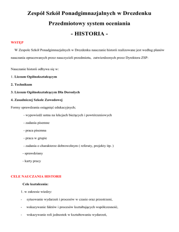 Zespół Szkół Ponadgimnazjalnych w Drezdenku Przedmiotowy system oceniania - HISTORIA WSTĘP W Zespole Szkół Ponadgimnazjalnych w Drezdenku nauczanie historii realizowane jest według planów nauczania opracowanych przez nauczycieli przedmiotu, zatwierdzonych przez Dyrektora ZSP: Nauczanie historii odbywa się w: 1. Liceum Ogólnokształcącym 2. Technikum 3. Liceum Ogólnokształcącym Dla Dorosłych 4. Zasadniczej Szkole Zawodowej Formy sprawdzania osiągnięć edukacyjnych; - wypowiedź ustna na lekcjach bieżących i powtórzeniowych - zadania pisemne - praca pisemna - praca w grupie - zadania o charakterze dobrowolnym ( referaty, projekty itp. ) - sprawdziany - karty pracy CELE NAUCZANIA HISTORII Cele kształcenia: 1. w zakresie wiedzy: - sytuowanie wydarzeń i procesów w czasie oraz przestrzeni, - wskazywanie faktów i procesów kształtujących współczesność, - wskazywanie roli jednostek w kształtowaniu wydarzeń, - poznawanie dziejów swojej „małej ojczyzny” na tle wydarzeń i procesów zachodzących w Polsce i na świecie 2. w zakresie umiejętności: - analizowanie przyczyn i skutków wydarzeń oraz procesów historycznych, - analiza map i planów, - rozróżnianie typów źródeł historycznych, - kształtowanie umiejętności krytycznej analizy źródeł historycznych - odróżnianie faktów od opinii, - łączenie informacji z różnych dziedzin nauki, - przygotowanie wypowiedzi publicznych, - dokonywanie samodzielnej oceny wydarzeń i procesów i przedstawianie ich w związku przyczynowo-skutkowym, - hierarchizowanie wydarzeń i procesów historycznych, - zauważenie związku między historią regionu, Polski i Europy 3. w zakresie świadomości historycznej: - rozumienie pojęć historycznych i posługiwanie się nimi, - dostrzeganie różnorodności kulturowej współczesnego świata, - zauważenie związku między historią regionu, Polski i Europy, - ocenianie zjawisk historycznych, wydarzeń współczesnych, procesów kulturowych, społecznych, gospodarczych i politycznych, - porządkowanie wiedzy zgodnie z procesem historycznym, - nabywanie umiejętności wykorzystania wiadomości historycznych przy analizie wydarzeń współczesnych, procesów kulturowych, społecznych, gospodarczych i politycznych Cele wychowania: - kształtowanie postaw patriotycznych, - utrwalanie szacunku do symboli narodowych, - kształtowanie przywiązania do swojej „małej ojczyzny”, - doskonalenie umiejętności pracy w zespole, - rozwijanie szacunku wobec dokonań poprzednich pokoleń, - pogłębianie postaw obywatelskich, - kształtowanie postaw solidarności. OCENIANIE Uczniowie za swą pracę otrzymują oceny według Wewnątrzszkolnego Systemu Oceniania, w skali 1-6. Wyznaczniki ocen : OCENA DOPUSZCZAJĄCA: Uczeń potrafi: - prezentować fakty - odczytywać dane kartograficzne - posługiwać się podręcznikiem, słownikiem, encyklopedią - częściowo interpretować źródła - objaśniać proste zjawiska i fakty - częściowo uzasadniać swoje stanowisk - stosować niektóre pojęcia OCENA DOSTATECZNA Uczeń potrafi: - chronologicznie przedstawiać wydarzenia - formułować pytania do analizowanego tekstu źródłowego - schematycznie przedstawia związki przyczynowo- skutkowe - w miarę poprawnie stosować pojęcia OCENA DOBRA Uczeń potrafi: - dostrzegać ciągłość i zmiany w historii - odróżniać historię regionalną od ogólnej - przeprowadzić analizę porównawczą źródeł - stosować właściwą hierarchizację - prawidłowo formułować wnioski - poprawnie stosować pojęcia - właściwie przedstawiać związki przyczynowo-skutkowe OCENA BARDZO DOBRA Uczeń potrafi: - ocenić przydatność źródła do rekonstrukcji wydarzeń historycznych - rozpoznawać rodzaje i tempo zmian ( gwałtowne, stopniowe) - umiejętnie dyskutować - budować własny obraz przeszłości na podstawie różnych przekazów źródłowej i wiedzy ogólnej - porównywać analogiczne zjawiska w różnych krajach OCENA CELUJĄCA Uczeń potrafi: - wykazać się wiedzą i umiejętnościami wykraczającymi poza materiał podręcznikowy, stosować je w sytuacjach problemowych - uczestniczyć w Olimpiadzie Historycznej w stopniu przynajmniej okręgowym - pogłębiać wiedzę historyczną znacznie wykraczającą poza program - samodzielnie i rzeczowo analizować poszczególne fakty i postaci - umiejętnie posługiwać się związkami przyczynowo–skutkowymi - uczeń wykazuje szczególne uzdolnienia humanistyczne Kryteria oceny 1. Według skali punktowej z przeliczeniem na procenty, na wszystkich pracach pisemnych z wyjątkiem wypracowań: wymaganych odpowiedzi: 35% - 50% - dopuszczający 51% - 74% - dostateczny 75% - 90% - dobry 91% - 99% - bardzo dobry 100% + ewentualnie dodatkowe zadania wykonane poprawnie – celujący 2. W wypowiedzi ustnej lub pisemnej (wypracowanie) wymagane elementy dają : 1.Zrozumienie tematu, umieszczenie go w czasie i przestrzeni 2.Dobór materiału rzeczowego - faktów, wydarzeń i ich hierarchizacja 20% 70% 3.Umiejętność posługiwania się wiedzą i pojęciami. 4.Dostrzeganie związków między faktami z różnych dziedzin życia. 5.Ujmowanie zjawisk historycznych w różnym kontekście. 6.Analiza, wnioskowanie, porównywanie, wyjaśnianie i uogólnianie, ocena własna. 7.Język wypowiedzi - słownictwo, styl 8.Konstrukcja wypowiedzi 5% 5% Uczeń nieobecny na pracy klasowej, jeżeli nieobecność jest nieusprawiedliwiona, zalicza tę pracę na najbliższych zajęciach.. W przypadku nieobecności usprawiedliwionej uczeń ma obowiązek w ciągu dwóch tygodni od oddania pracy zaliczyć materiał przewidziany na nią. Uczeń ma prawo poprawić każdą ocenę w ciągu dwóch tygodni od jej otrzymania. Materiał bieżący (obejmujący trzy ostatnie tematy) może być sprawdzany w toku wypowiedzi ustnych i niezapowiedzianych sprawdzianów (kartkówek). Uczeń może zgłosić nieprzygotowanie do lekcji (nie dotyczy zapowiedzianych sprawdzianów i lekcji podsumo