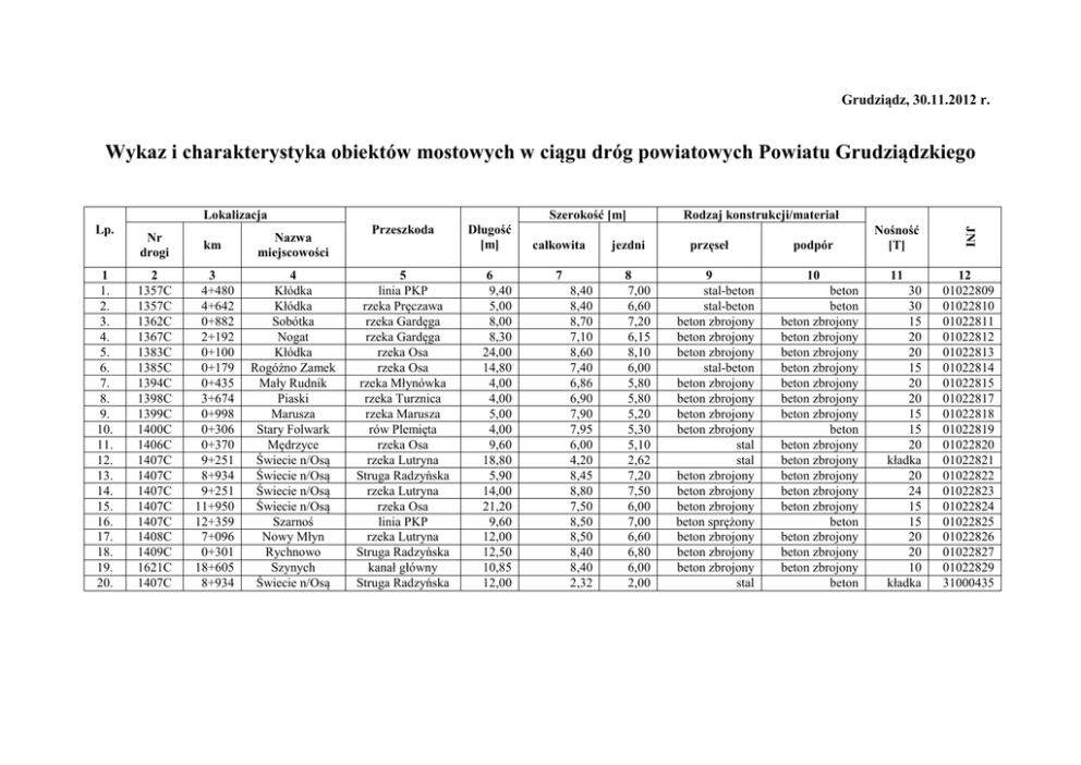 Grudziądz, 30.11.2012 r. Wykaz i charakterystyka obiektów mostowych w ciągu dróg powiatowych Powiatu Grudziądzkiego Szerokość [m] Lokalizacja 1 1. 2. 3. 4. 5. 6. 7. 8. 9. 10. 11. 12. 13. 14. 15. 16. 17. 18. 19. 20. Nr drogi km Nazwa miejscowości 2 1357C 1357C 1362C 1367C 1383C 1385C 1394C 1398C 1399C 1400C 1406C 1407C 1407C 1407C 1407C 1407C 1408C 1409C 1621C 1407C 3 4+480 4+642 0+882 2+192 0+100 0+179 0+435 3+674 0+998 0+306 0+370 9+251 8+934 9+251 11+950 12+359 7+096 0+301 18+605 8+934 4 Kłódka Kłódka Sobótka Nogat Kłódka Rogóźno Zamek Mały Rudnik Piaski Marusza Stary Folwark Mędrzyce Świecie n/Osą Świecie n/Osą Świecie n/Osą Świecie n/Osą Szarnoś Nowy Młyn Rychnowo Szynych Świecie n/Osą Przeszkoda 5 linia PKP rzeka Pręczawa rzeka Gardęga rzeka Gardęga rzeka Osa rzeka Osa rzeka Młynówka rzeka Turznica rzeka Marusza rów Plemięta rzeka Osa rzeka Lutryna Struga Radzyńska rzeka Lutryna rzeka Osa linia PKP rzeka Lutryna Struga Radzyńska kanał główny Struga Radzyńska Długość [m] 6 9,40 5,00 8,00 8,30 24,00 14,80 4,00 4,00 5,00 4,00 9,60 18,80 5,90 14,00 21,20 9,60 12,00 12,50 10,85 12,00 całkowita 7 8,40 8,40 8,70 7,10 8,60 7,40 6,86 6,90 7,90 7,95 6,00 4,20 8,45 8,80 7,50 8,50 8,50 8,40 8,40 2,32 jezdni 8 7,00 6,60 7,20 6,15 8,10 6,00 5,80 5,80 5,20 5,30 5,10 2,62 7,20 7,50 6,00 7,00 6,60 6,80 6,00 2,00 Rodzaj konstrukcji/materiał przęseł 9 stal-beton stal-beton beton zbrojony beton zbrojony beton zbrojony stal-beton beton zbrojony beton zbrojony beton zbrojony beton zbrojony stal stal beton zbrojony beton zbrojony beton zbrojony beton sprężony beton zbrojony beton zbrojony beton zbrojony stal podpór Nośność [T] JNI Lp. 10 11 12 01022809 01022810 01022811 01022812 01022813 01022814 01022815 01022817 01022818 01022819 01022820 01022821 01022822 01022823 01022824 01022825 01022826 01022827 01022829 31000435 beton beton beton zbrojony beton zbrojony beton zbrojony beton zbrojony beton zbrojony beton zbrojony beton zbrojony beton beton zbrojony beton zbrojony beton zbrojony beton zbrojony beton zbrojony beton beton zbrojony beton zbrojony beton zbrojony beton 30 30 15 20 20 15 20 20 15 15 20 kładka 20 24 15 15 20 20 10 kładka