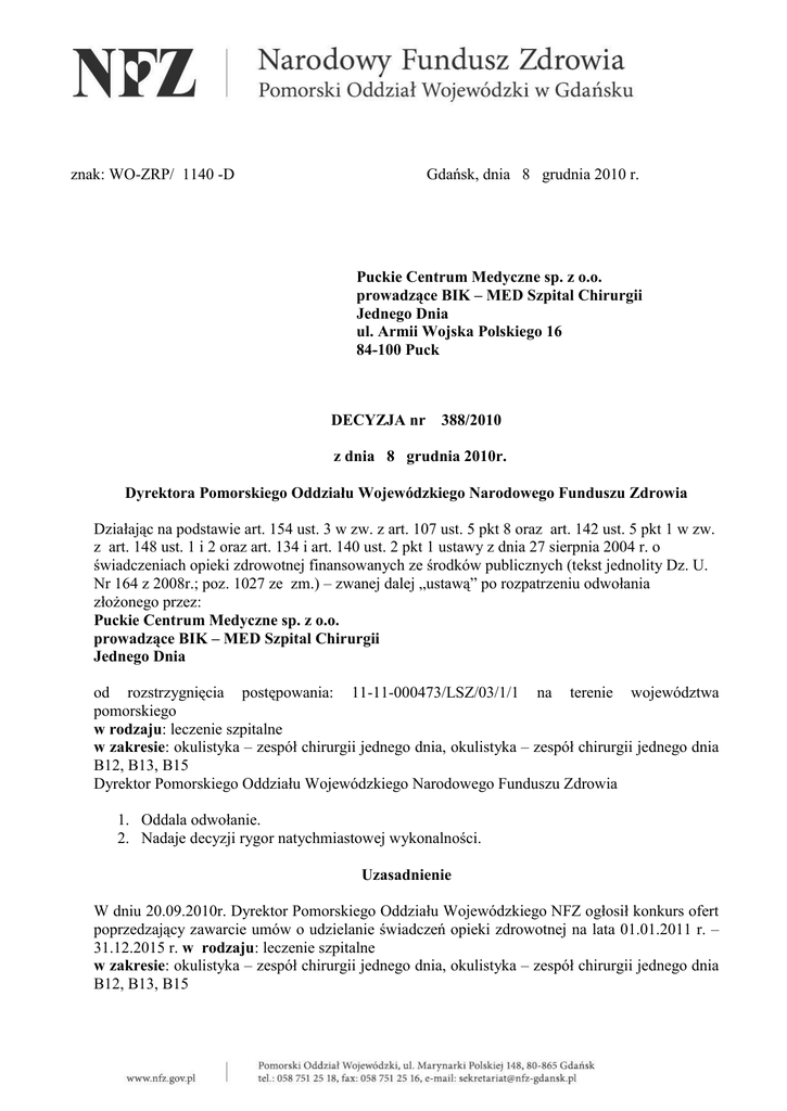 Gdańsk, dnia 8 grudnia 2010 r. znak: WO-ZRP/ 1140 -D Puckie Centrum Medyczne sp. z o.o. prowadzące BIK – MED Szpital Chirurgii Jednego Dnia ul. Armii Wojska Polskiego 16 84-100 Puck DECYZJA nr 388/2010 z dnia 8 grudnia 2010r. Dyrektora Pomorskiego Oddziału Wojewódzkiego Narodowego Funduszu Zdrowia Działając na podstawie art. 154 ust. 3 w zw. z art. 107 ust. 5 pkt 8 oraz art. 142 ust. 5 pkt 1 w zw. z art. 148 ust. 1 i 2 oraz art. 134 i art. 140 ust. 2 pkt 1 ustawy z dnia 27 sierpnia 2004 r. o świadczeniach opieki zdrowotnej finansowanych ze środków publicznych (tekst jednolity Dz. U. Nr 164 z 2008r.; poz. 1027 ze zm.) – zwanej dalej „ustawą” po rozpatrzeniu odwołania złożonego przez: Puckie Centrum Medyczne sp. z o.o. prowadzące BIK – MED Szpital Chirurgii Jednego Dnia od rozstrzygnięcia postępowania: 11-11-000473/LSZ/03/1/1 na terenie województwa pomorskiego w rodzaju: leczenie szpitalne w zakresie: okulistyka – zespół chirurgii jednego dnia, okulistyka – zespół chirurgii jednego dnia B12, B13, B15 Dyrektor Pomorskiego Oddziału Wojewódzkiego Narodowego Funduszu Zdrowia 1. Oddala odwołanie. 2. Nadaje decyzji rygor natychmiastowej wykonalności. Uzasadnienie W dniu 20.09.2010r. Dyrektor Pomorskiego Oddziału Wojewódzkiego NFZ ogłosił konkurs ofert poprzedzający zawarcie umów o udzielanie świadczeń opieki zdrowotnej na lata 01.01.2011 r. – 31.12.2015 r. w rodzaju: leczenie szpitalne w zakresie: okulistyka – zespół chirurgii jednego dnia, okulistyka – zespół chirurgii jednego dnia B12, B13, B15 dla obszaru województwa pomorskiego Postępowanie konkursowe zostało ogłoszone na kwotę 7.128.219 zł. W ogłoszeniu wskazano obowiązujące przepisy dotyczące zarówno wymogów, jakie muszą być spełnione przez podmioty składające oferty, jak i przepisy dotyczące kryteriów oceny ofert w postępowaniu w sprawie zawarcia umowy o udzielanie świadczeń opieki zdrowotnej. W postępowaniu konkursowym oferty złożyło 9 oferentów, w tym Odwołujący się. Oferent do złożonej oferty załączył oświadczenie z dnia 07.10.2010r., że zapoznał się z warunkami postępowania oraz warunkami zawierania umów i nie zgłasza do nich zastrzeżeń oraz że przyjmuje je do wykonania. Komisja konkursowa dnia 13 października 2010 roku, wezwała Odwołującego do usunięcia braków formalnych złożonej oferty. Braki formalne zostały uzupełnione dnia 14 października 2010 roku, tj. w wyznaczonym przez POW NFZ terminie. Po sprawdzeniu oferty pod względem spełnienia warunków formalno-prawnych oraz analizie oferty w aspekcie spełnienia wymagań określonych w przepisach, oferta została przyjęta do dalszego postępowania. Oferent został zaproszony do negocjacji i dnia 26 listopada 2010 roku podpisał protokół końcowy z negocjacji. Strony doszły do porozumienia, co do ilości punków i ceny za punkt. W podpisanym przez Strony protokole końcowym z negocjacji znajdują się uwagi, że podpisanie protokołu negocjacyjnego nie jest gwarancją wybrania oferty oraz że wynegocjowane warunki zostaną wzięte pod uwagę przy tworzeniu rankingu końcowego (...). W rankingu końcowym konkursu ofert, oferta Odwołującego się uzyskała w sumie 77,500 punktów, w tym za kryteria cenowe 30,000 pkt a niecenowe 47,500 pkt. Dnia 30.11.2010 r. komisja konkursowa rozstrzygnęła postępowanie nie dokonując wyboru Odwołującego. W terminie wynikającym z art. 154 ust.1 ustawy wpłynęło do NFZ POW odwołanie od rozstrzygnięcia postępowania nr 11-11-000473/LSZ/03/1/1 Zgodnie z art. 10 § 1 kodeksu postępowania administracyjnego oferent został poinformowany o tym, że posiada prawo do czynnego udziału na każdym etapie postępowania, a przed wydaniem decyzji przez Dyrektora Oddziału w przedmiotowej sprawie, istnieje możliwość wypowiedzenia się co do zebranych w Oddziale dowodów i materiałów oraz zgłoszonych żądań. Odwołanie złożone przez Oferenta nie zasługuje na uwzględnienie. W złożonym odwołaniu Oferent zarzucił, że postępowanie konkursowe zostało przeprowadzone z naruszeniem art. 97 ust. 3 ustawy. Podniósł jednocześnie, iż zgodnie z zapisem w/w przepisu do zadań Funduszu należy określenie jakości i dostępności oraz analiza kosztów świadczeń opieki zdrowotnej w zakresie niezbędnym dla prawidłowego zawierania umów o udzielanie świadczeń opieki zdrowotnej. Wynik rozstrzygnięcia postępowania w zakresie okulistyki – Zespół Chirurgii Jednego Dnia wskazuje, zdaniem Odwołującego, że zadanie to w toku postępowania nie zostało zrealizowane ponieważ środki na świadczenia zostały przydzielone w sposób rażąco nie gwarantujący równego dostępu ubezpieczonym tzn. wybrano dwóch oferentów realizujących umowę w Sopocie, a pozbawiono dostępności do nich mieszkańców uboższych powiatów, m. in. puckiego. Komisja w toku postępowania nie zrealizowała zadania postawionego przed Funduszem i nie przeprowadziła analizy kosztów gdyż pozbawieni dostępności mieszkańcy powiatów, zmuszeni będą ponosić koszty dojazdów do oddalonych placówek medycznych oraz do korzystania ze świadczeń w szpitalach, w których koszty świadczeń są zdecydowanie większe, niż proponowany w toku negocjacji przez Odwołującego koszt 45,90 zł za punkt okulistyczny. Dyrektor POW NFZ ustosunkowując się do podniesionych zarzutów wskazuje, co następuje: Zgodnie z treścią art. 152 ust. 1 ustawy, świadczeniodawcom, których interes prawny doznał uszczerbku w wyniku naruszenia przez Fundusz zasad przeprowadzania postępowania w sprawie zawarcia umowy o udzielanie świadczeń opieki zdrowotnej, przysługują środki odwoławcze (...). Jednym z nich, jest zgodnie z art. 154 ust. 1 ustawy odwołanie wnoszone do dyrektora oddziału wojewódzkiego Funduszu a dotyczące rozstrzygnięcia postępowania. W odwołaniu wniesionym przez Oferenta, brak jest zarzutów dotyczących rozstrzygnięcia postępowania a Odwołujący 