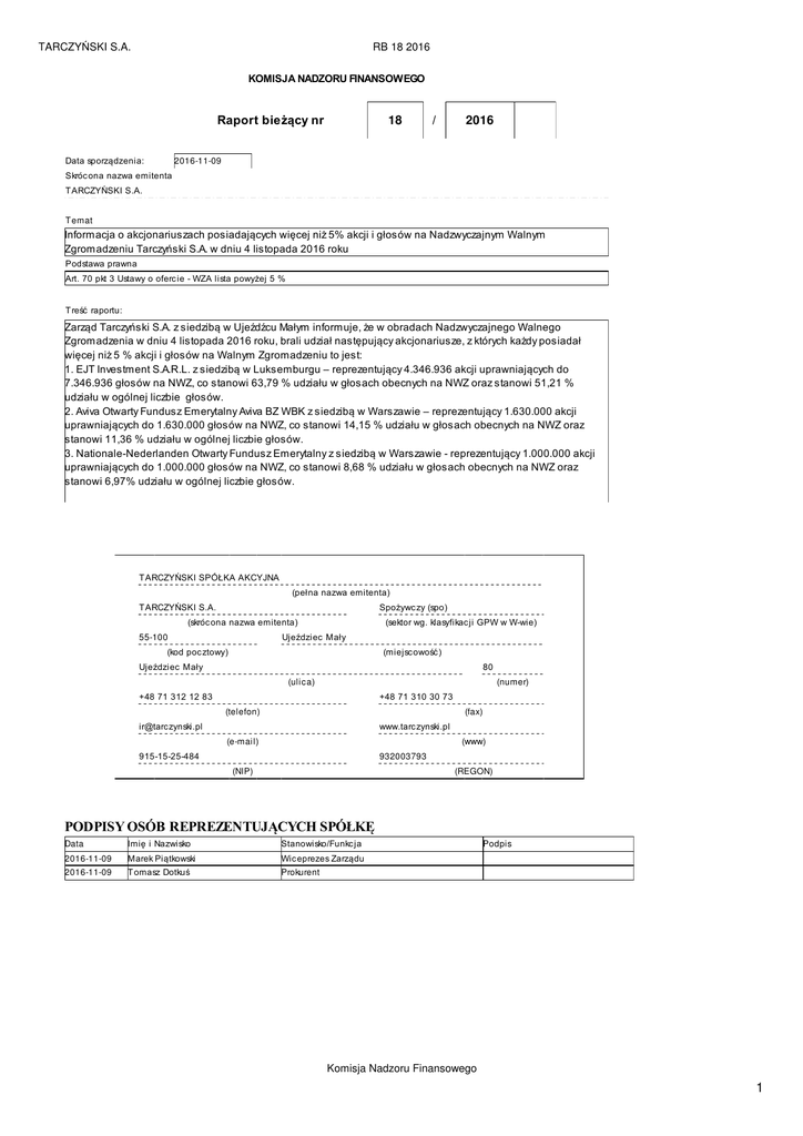 TARCZYŃSKI S.A. RB 18 2016 KOMISJA NADZORU FINANSOWEGO Raport bieżący nr 18 / 2016 2016-11-09 Data sporządzenia: Skróc ona nazwa emitenta TARCZYŃSKI S.A. Temat Informacja o akcjonariuszach posiadających więcej niż 5% akcji i głosów na Nadzwyczajnym Walnym Zgromadzeniu Tarczyński S.A. w dniu 4 listopada 2016 roku Podstawa prawna Art. 70 pkt 3 Ustawy o oferc ie - WZA lista powyżej 5 % Treść raportu: Zarząd Tarczyński S.A. z siedzibą w Ujeźdźcu Małym informuje, że w obradach Nadzwyczajnego Walnego Zgromadzenia w dniu 4 listopada 2016 roku, brali udział następujący akcjonariusze, z których każdy posiadał więcej niż 5 % akcji i głosów na Walnym Zgromadzeniu to jest: 1. EJT Investment S.A.R.L. z siedzibą w Luksemburgu – reprezentujący 4.346.936 akcji uprawniających do 7.346.936 głosów na NWZ, co stanowi 63,79 % udziału w głosach obecnych na NWZ oraz stanowi 51,21 % udziału w ogólnej liczbie głosów. 2. Aviva Otwarty Fundusz Emerytalny Aviva BZ WBK z siedzibą w Warszawie – reprezentujący 1.630.000 akcji uprawniających do 1.630.000 głosów na NWZ, co stanowi 14,15 % udziału w głosach obecnych na NWZ oraz stanowi 11,36 % udziału w ogólnej liczbie głosów. 3. Nationale-Nederlanden Otwarty Fundusz Emerytalny z siedzibą w Warszawie - reprezentujący 1.000.000 akcji uprawniających do 1.000.000 głosów na NWZ, co stanowi 8,68 % udziału w głosach obecnych na NWZ oraz stanowi 6,97% udziału w ogólnej liczbie głosów. TARCZYŃSKI SPÓŁKA AKCYJNA (pełna nazwa emitenta) TARCZYŃSKI S.A. Spożywc zy (spo) (skróc ona nazwa emitenta) 55-100 (sektor wg. klasyfikac ji GPW w W-wie) Ujeździec Mały (kod poc ztowy) (miejscowość) 80 Ujeździec Mały (ulica) (numer) +48 71 312 12 83 +48 71 310 30 73 (telefon) (fax) [email protected] www.tarc zynski.pl (e-mail) (www) 932003793 915-15-25-484 (NIP) (REGON) PODPISY OSÓB REPREZENTUJĄCYCH SPÓŁKĘ Data Imię i Nazwisko Stanowisko/Funkc ja 2016-11-09 Marek Piątkowski Wic eprezes Zarządu 2016-11-09 Tomasz Dotkuś Prokurent Podpis Komisja Nadzoru Finansowego 1